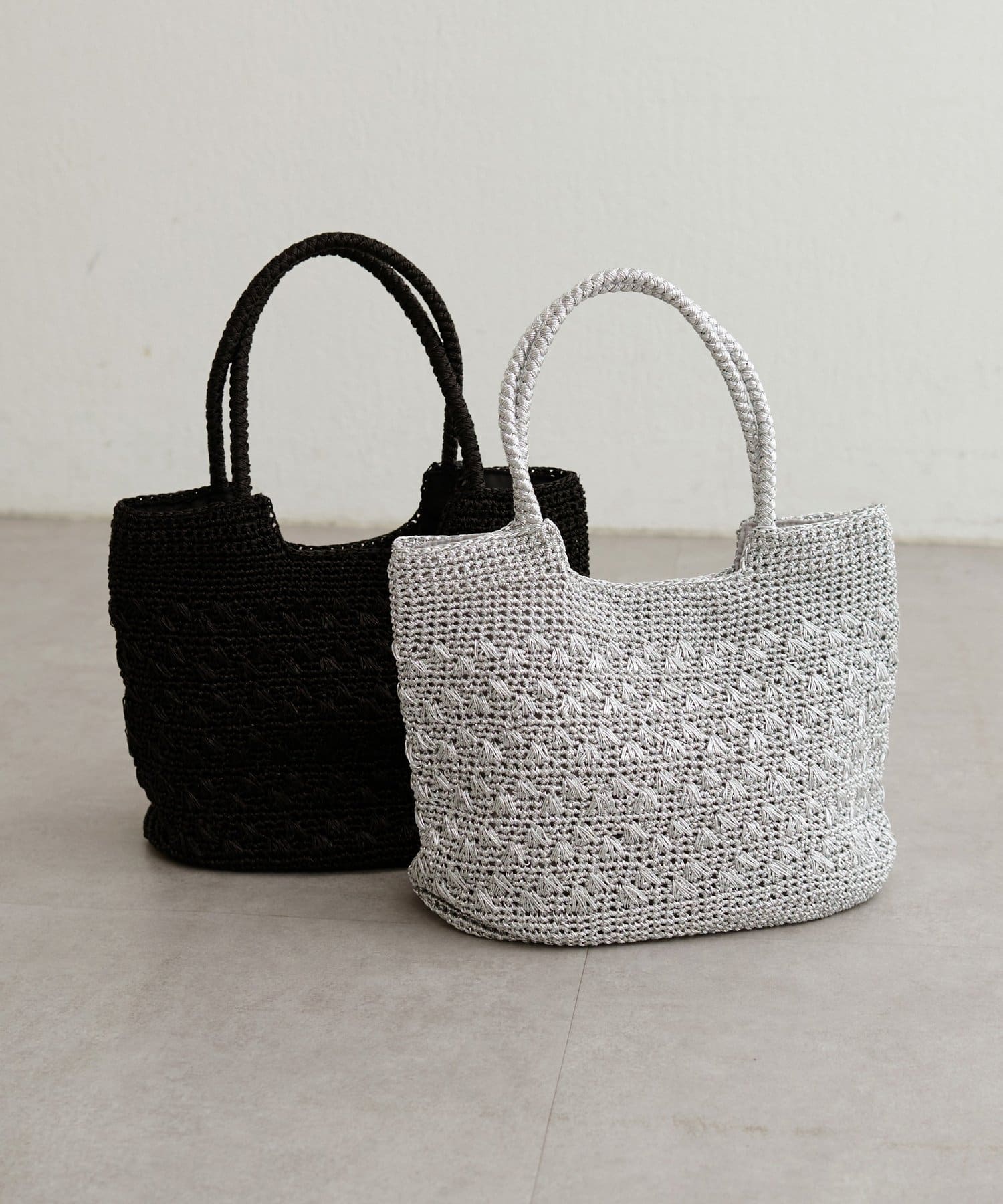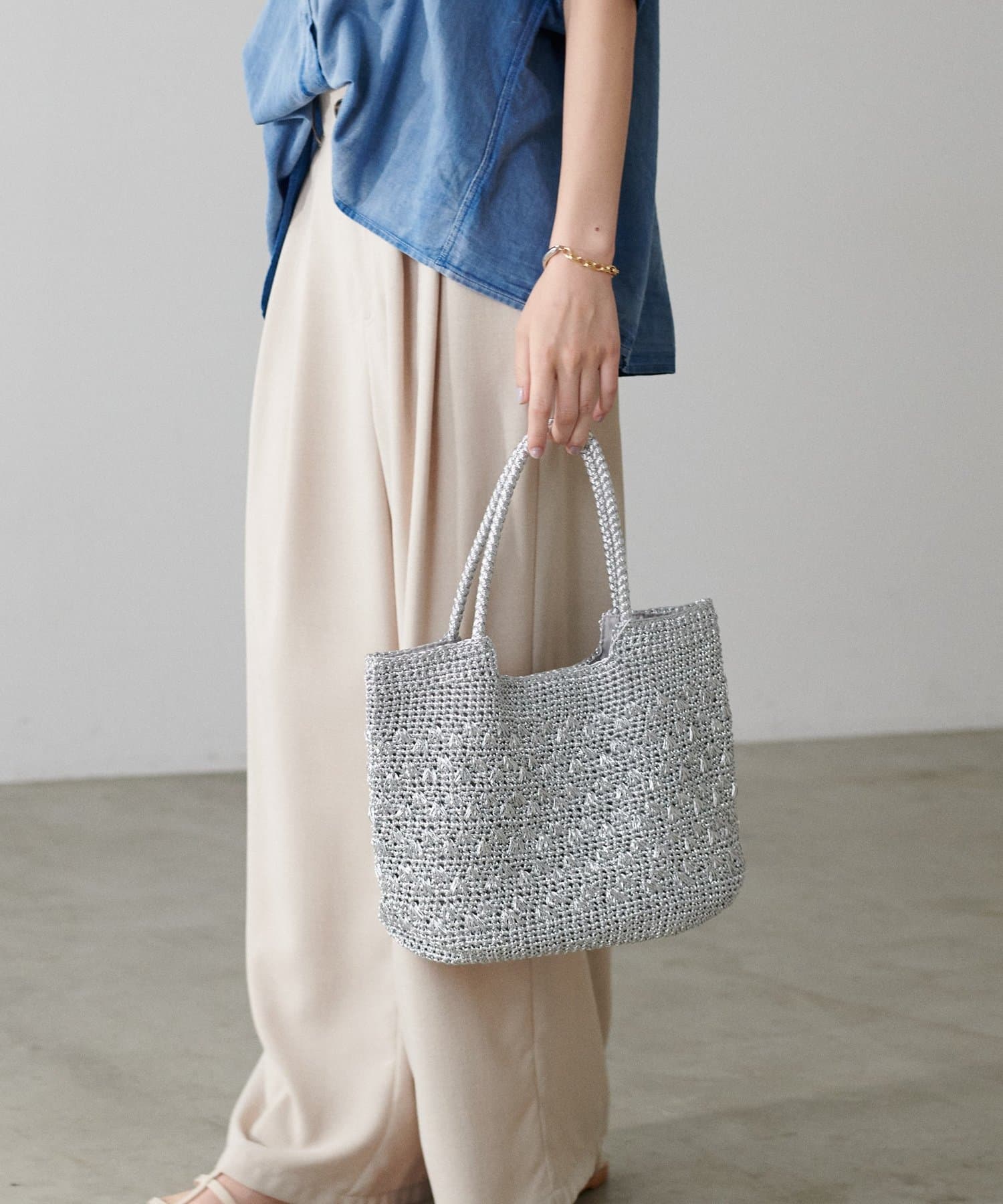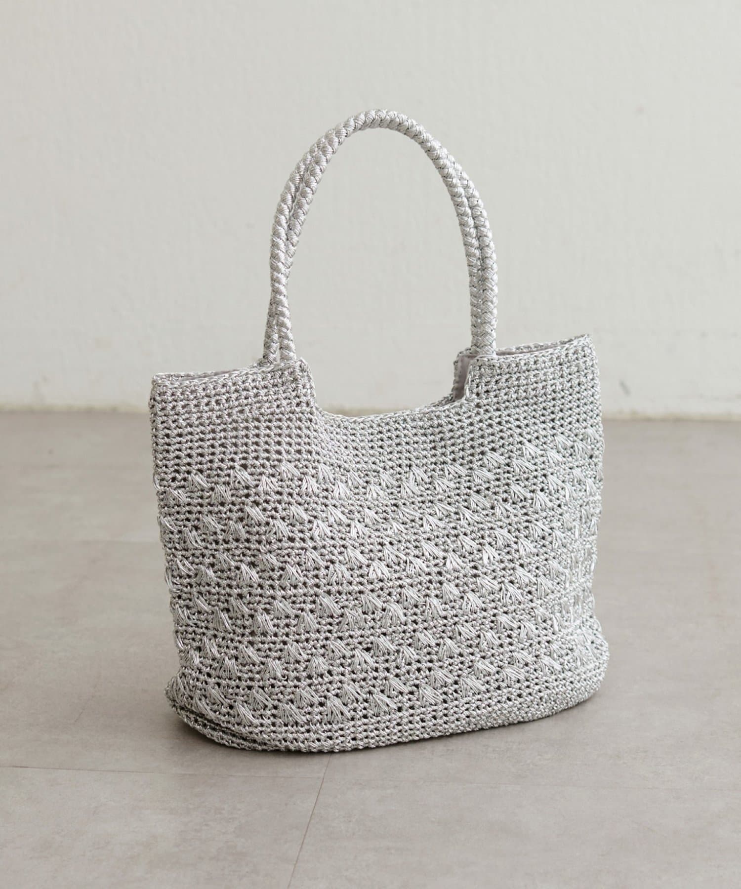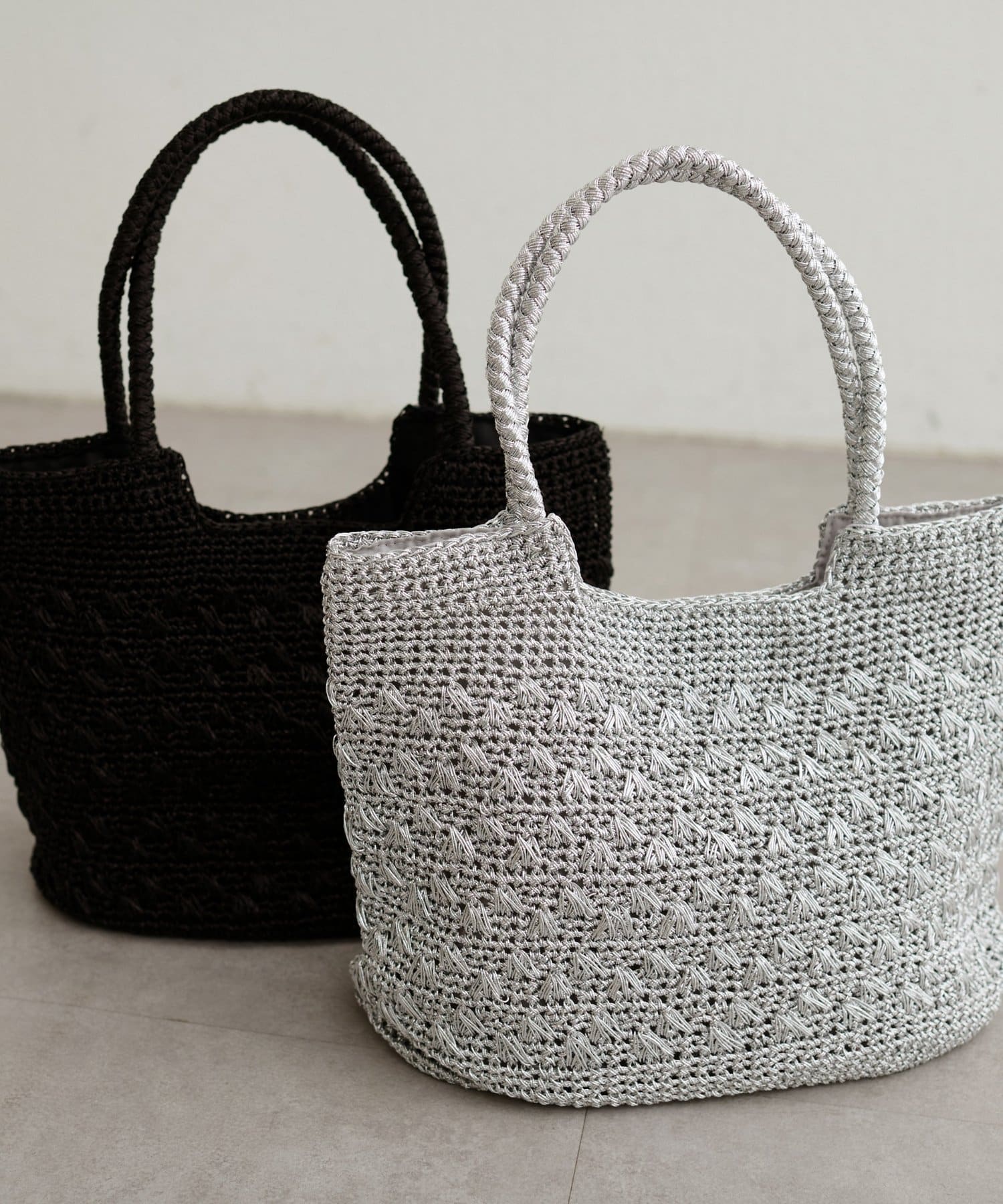 細やかな編み模様とメタリックな光沢が目を惹くコード編みトート。