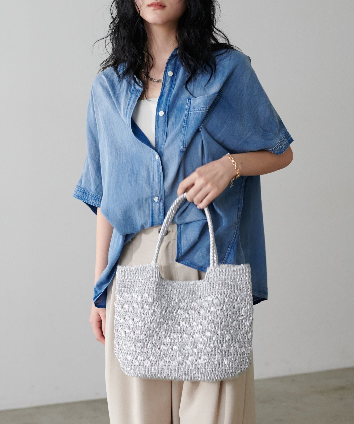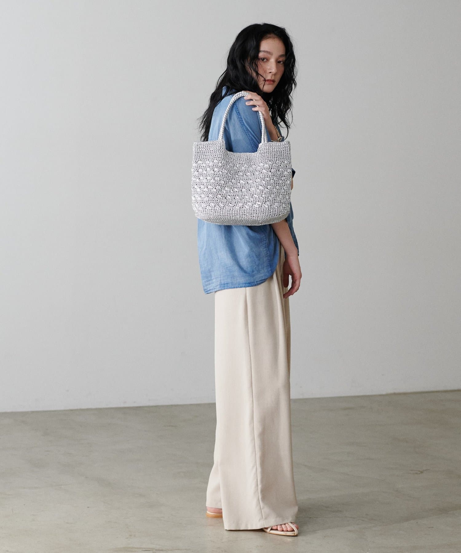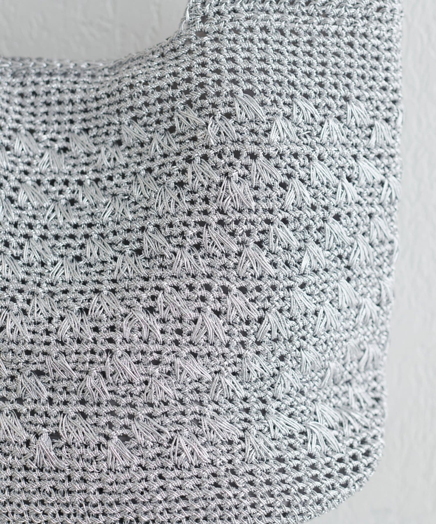 細やかな編み模様とメタリックな光沢が目を惹くコード編みトート。