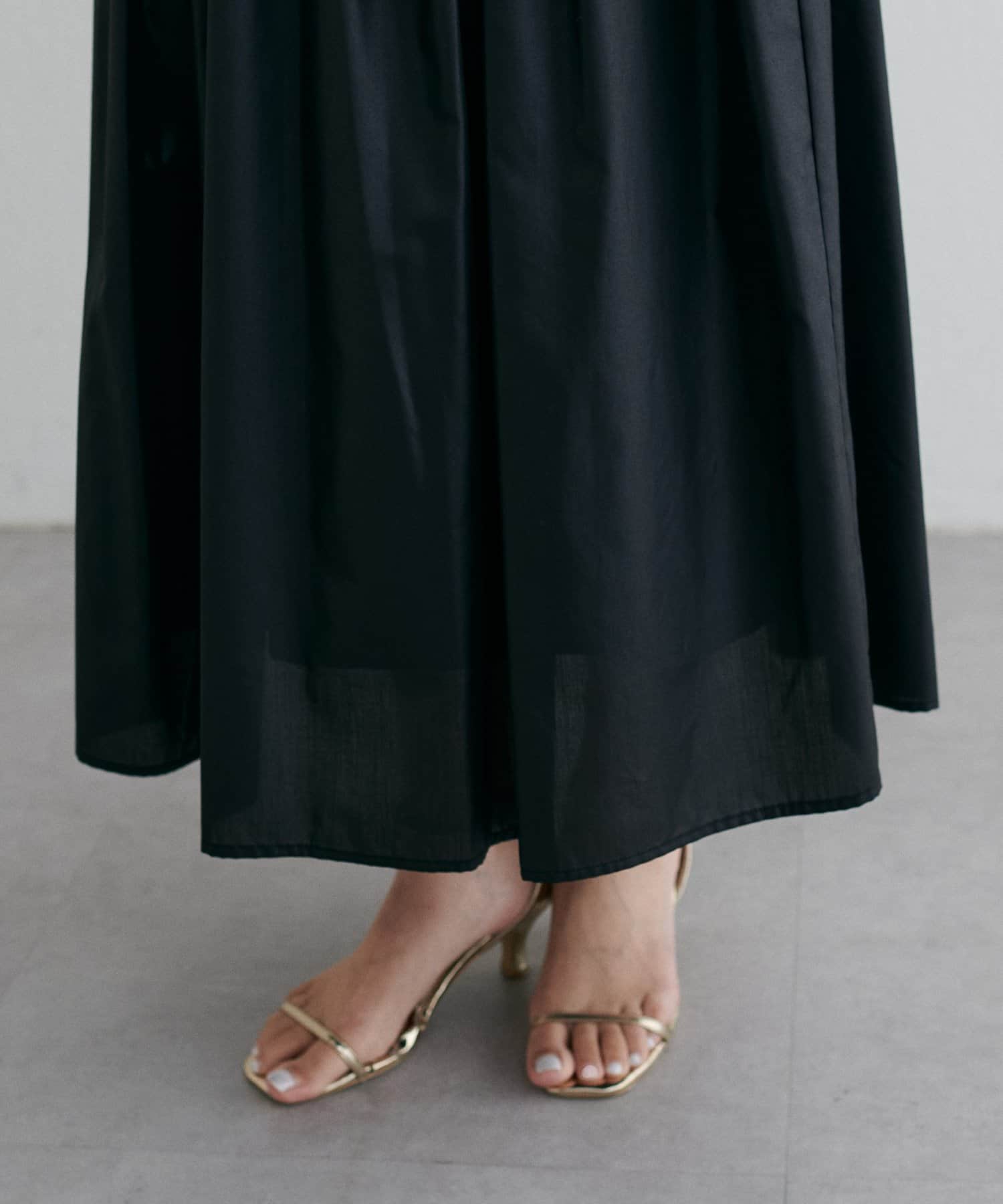 生地に艶感があり。黒でも単調にならず動くたび光の反射でギャザーが揺れ発色が綺麗です。そのせいでスタイルアップして見えると思います。
