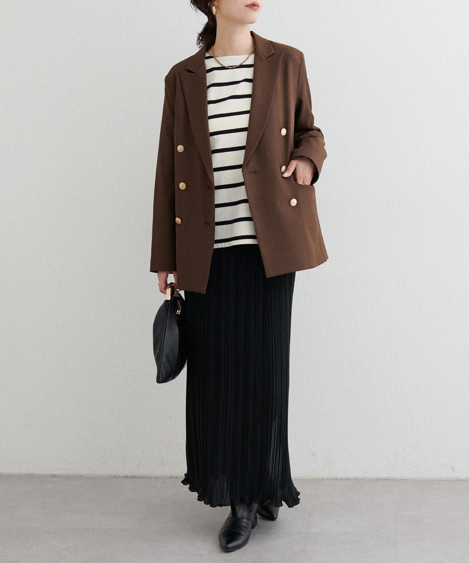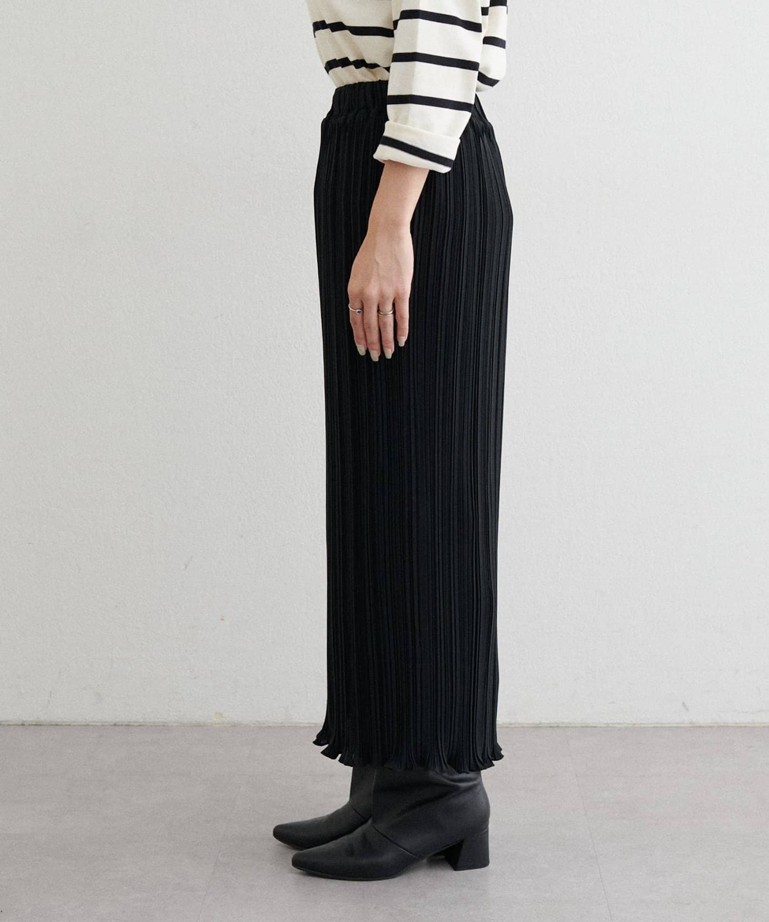 縦のラインを強調するプリーツがスタイルアップを叶え、