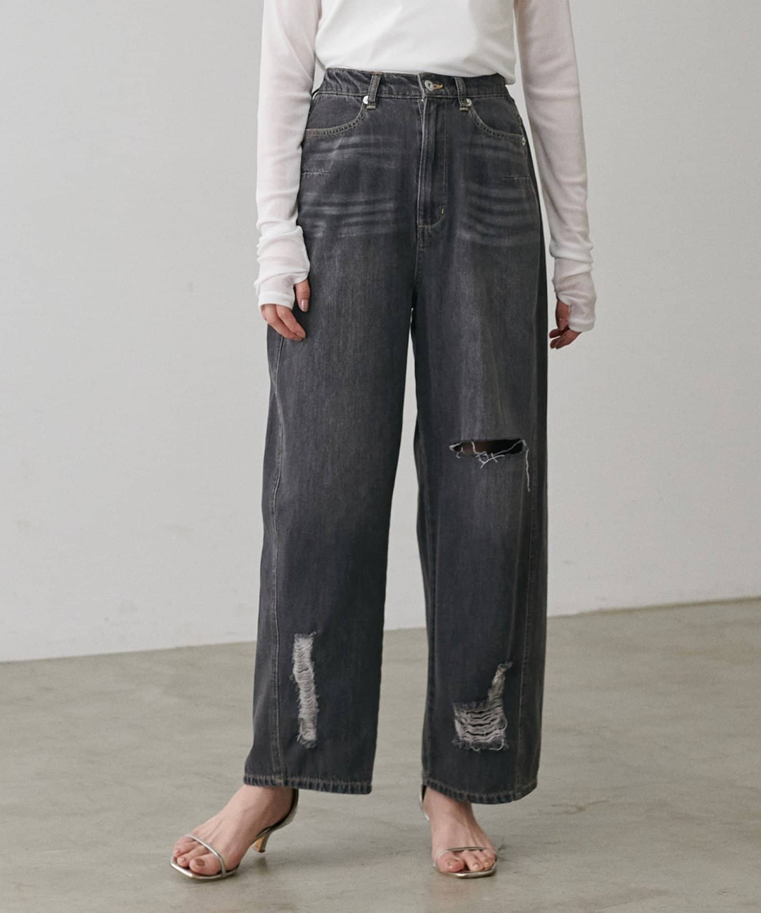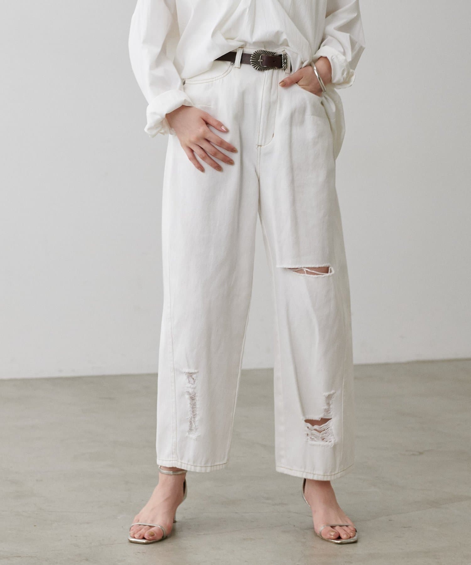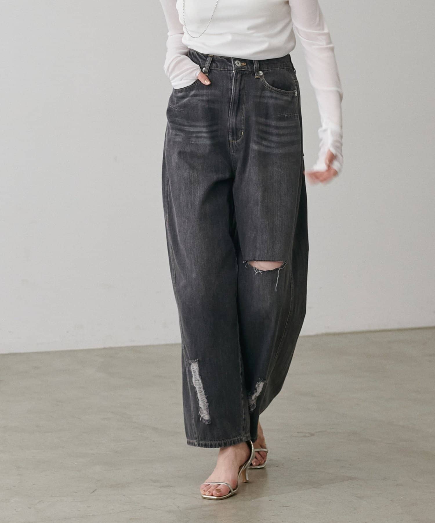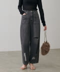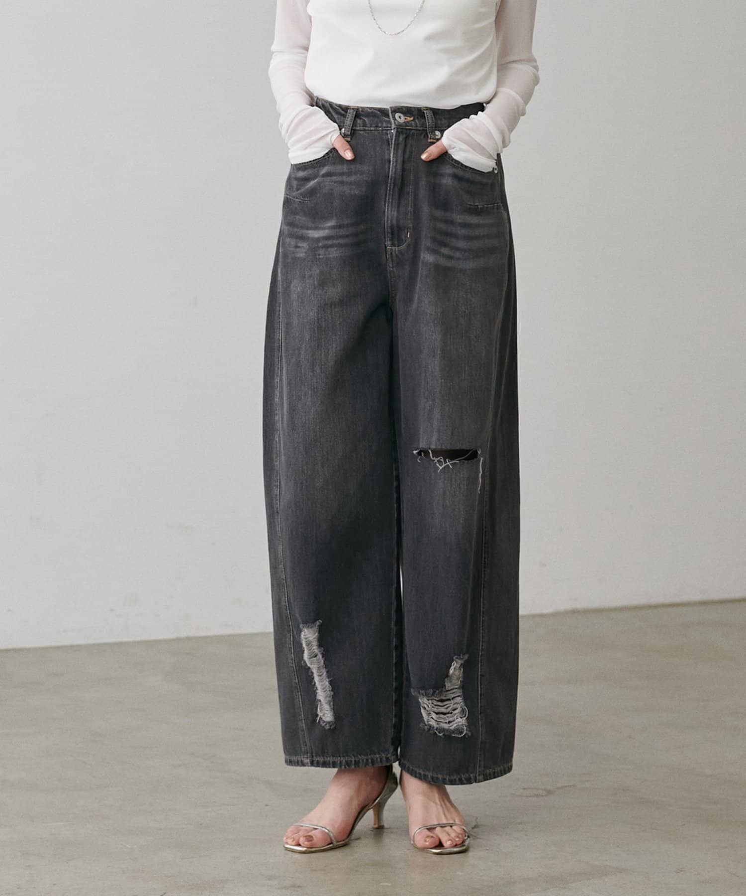 目を引く大胆なクラッシュ加工が、エッジの効いたアクセントになったデニム。