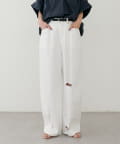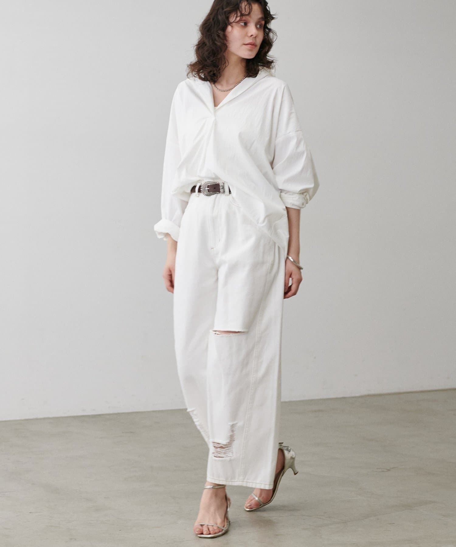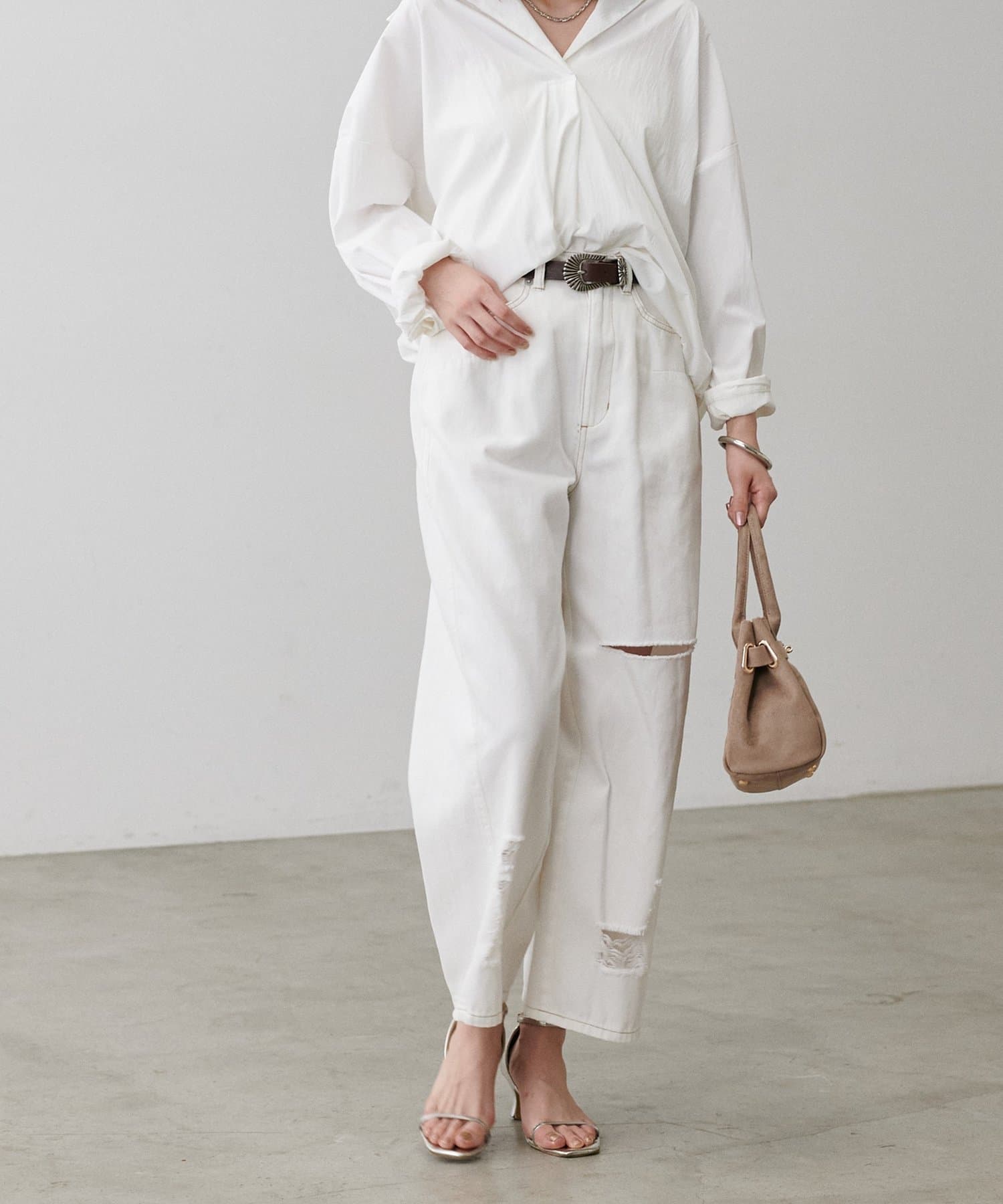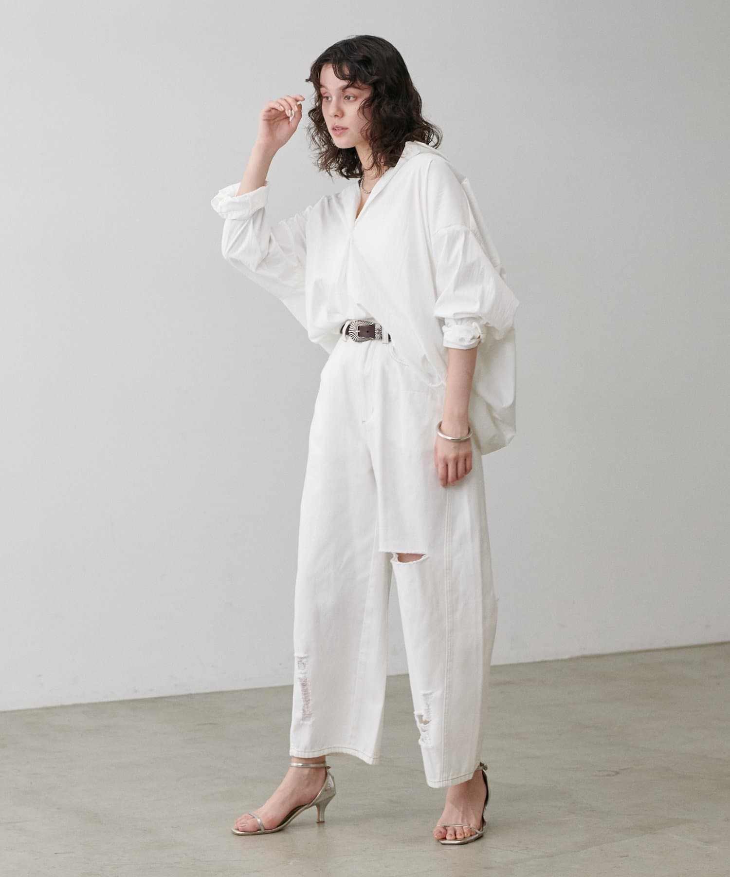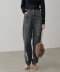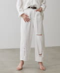 目を引く大胆なクラッシュ加工が、エッジの効いたアクセントになったデニム。