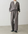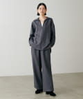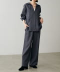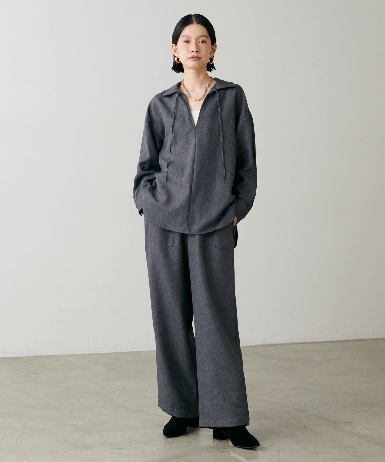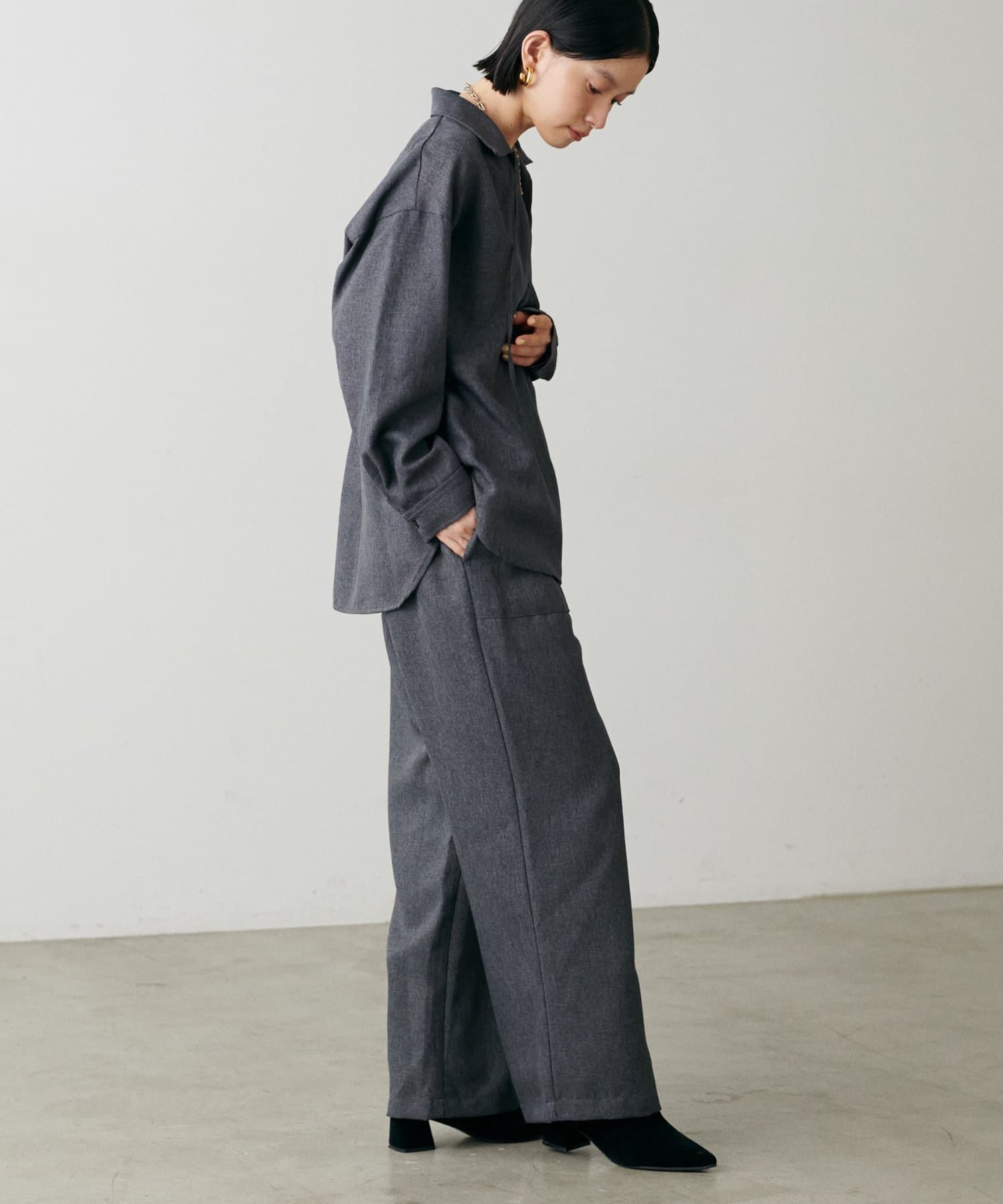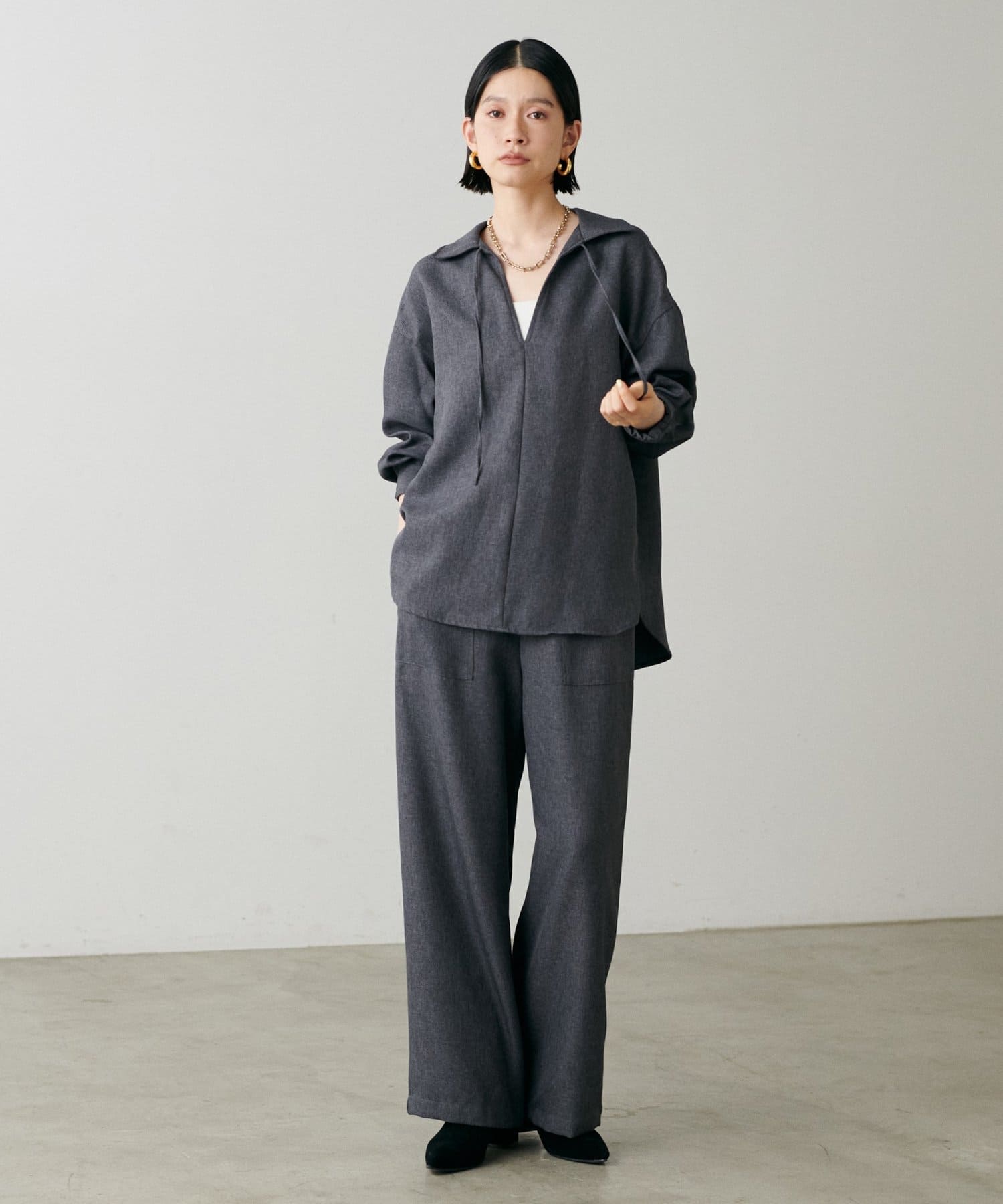 同素材のスキッパーシャツと合わせてセットアップ風に着こなせば、モード感のあるスタイルに。