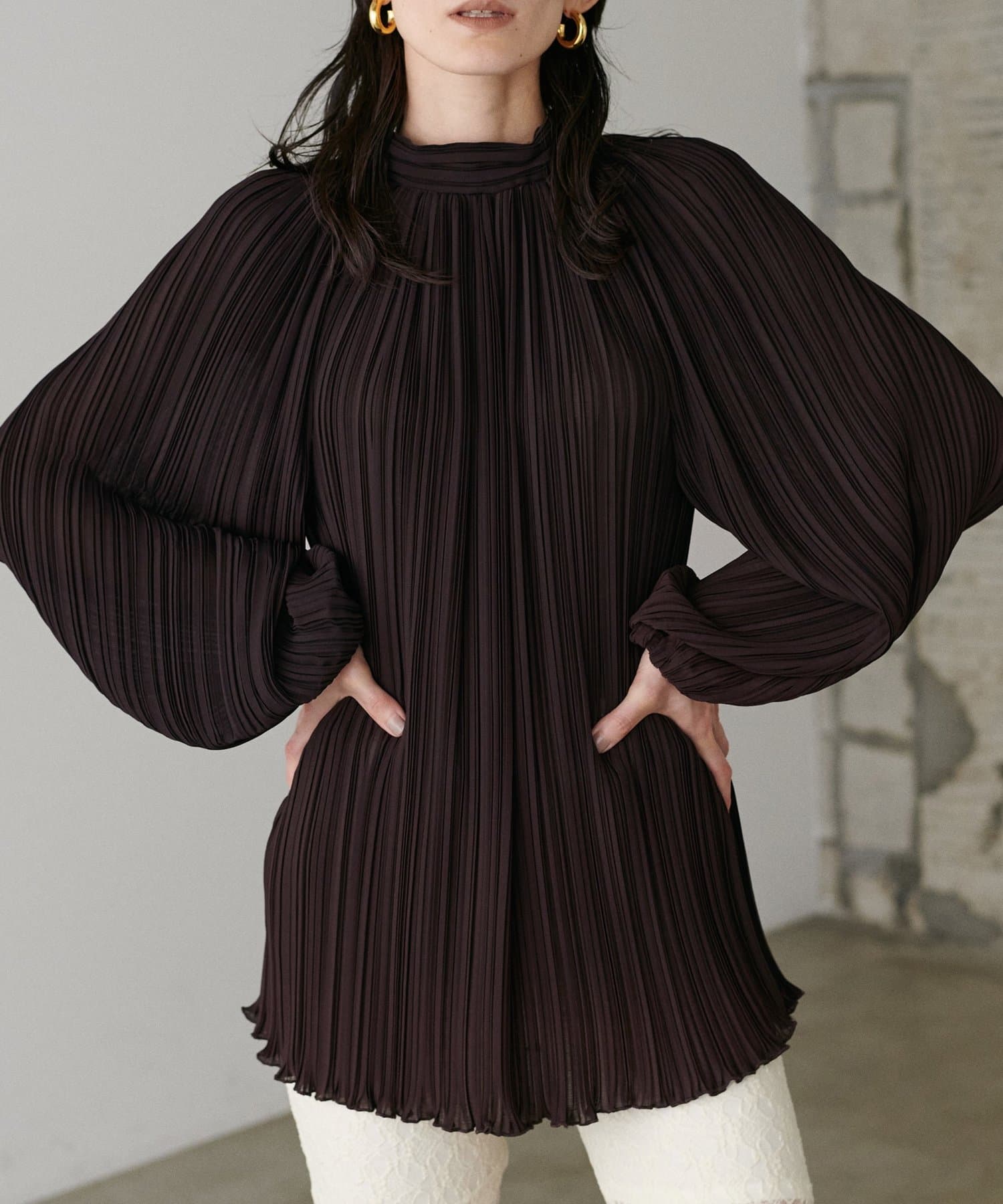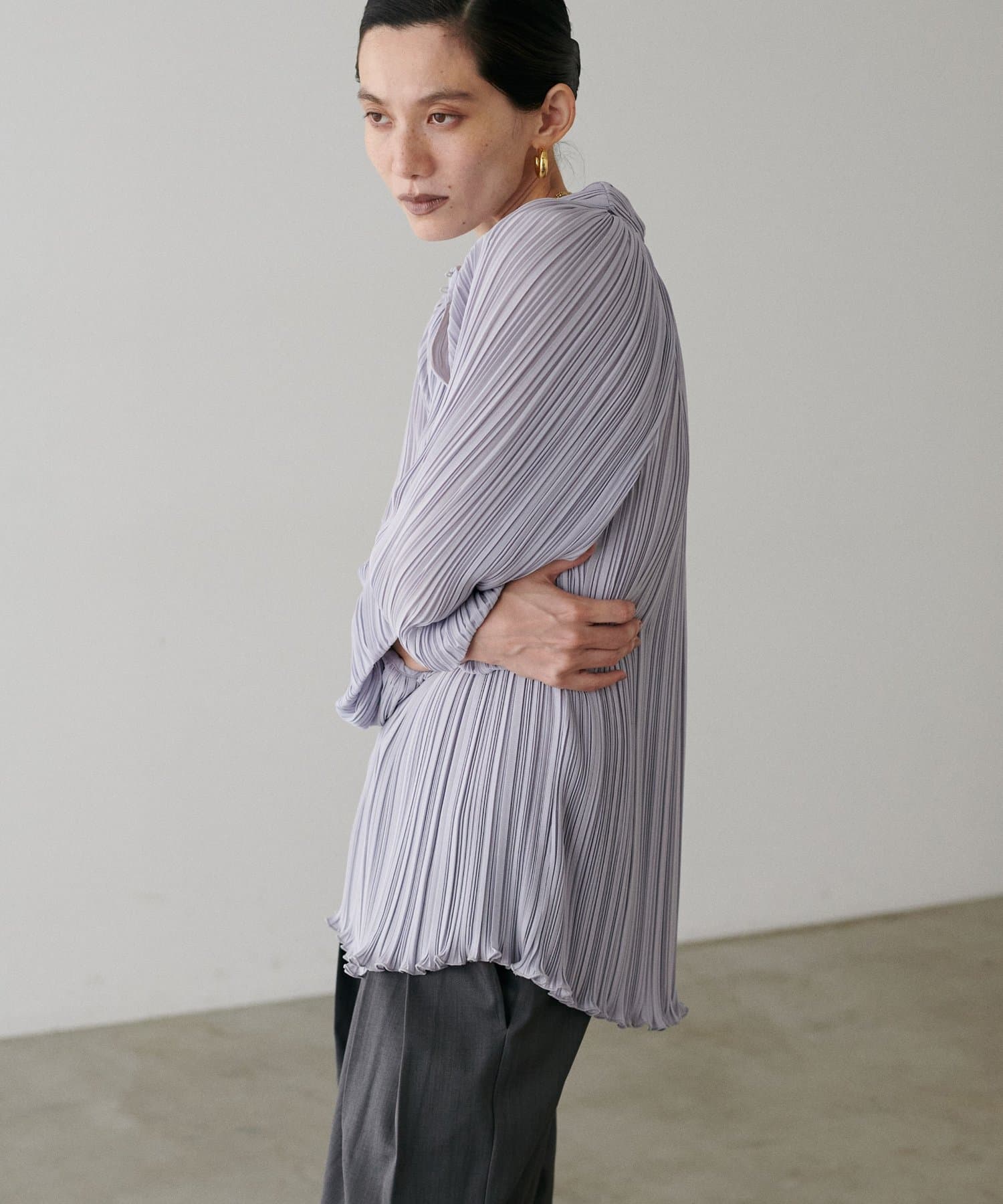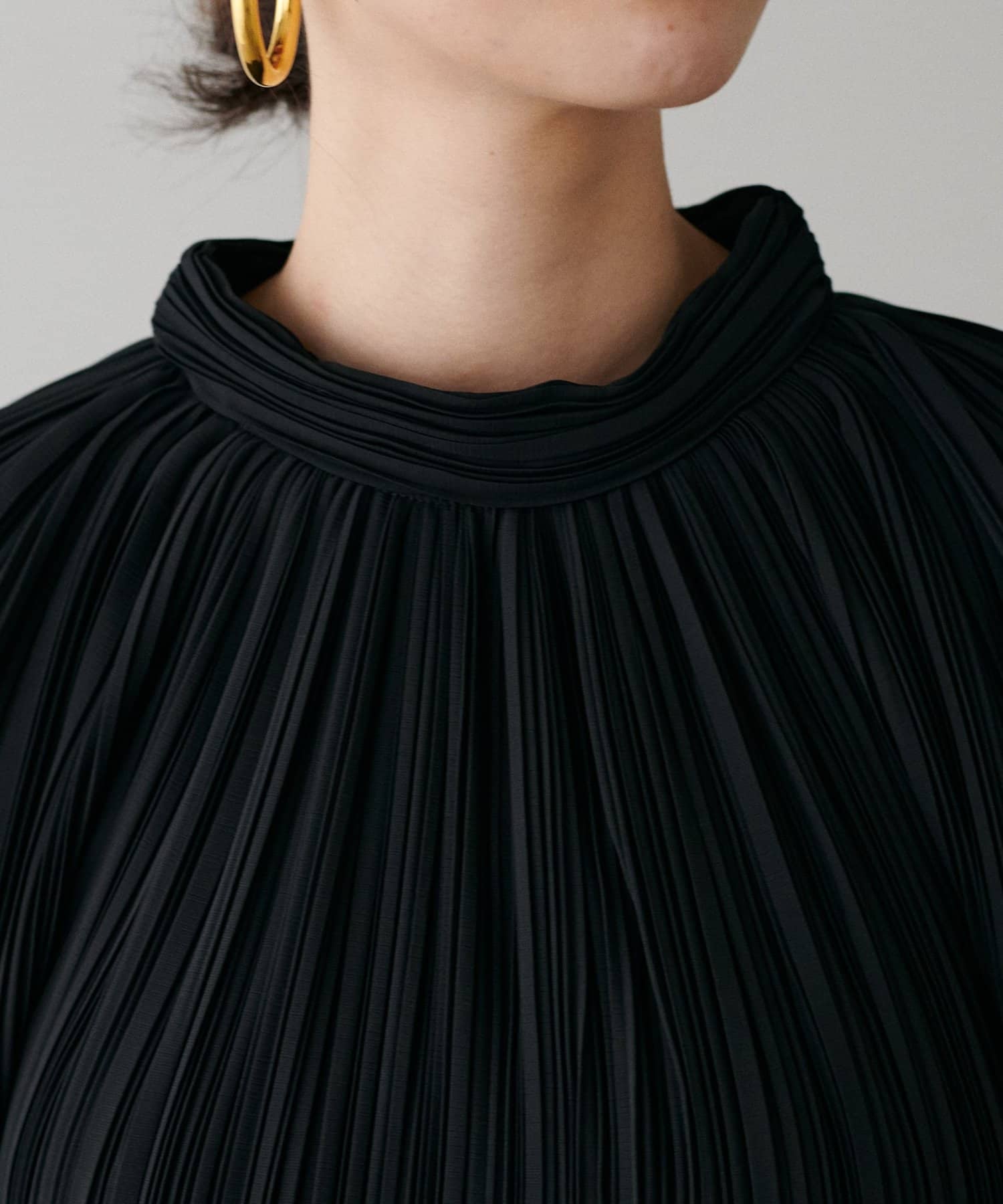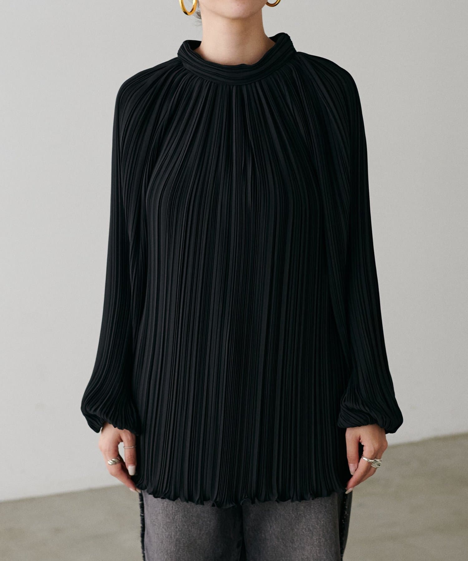 モックネックと開きのあるネックラインの前後2WAY仕様で楽しめる、プリーツ素材のブラウス。