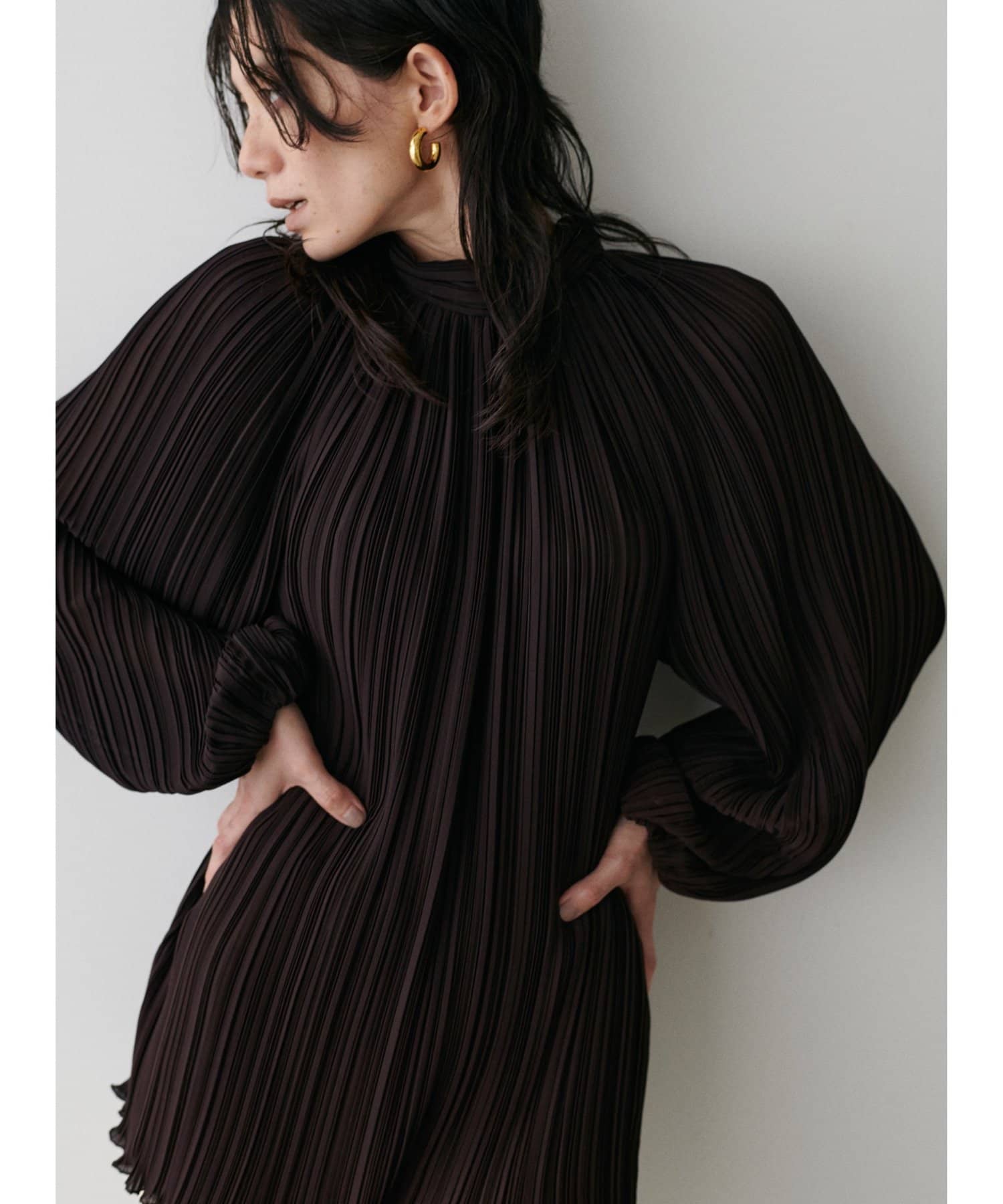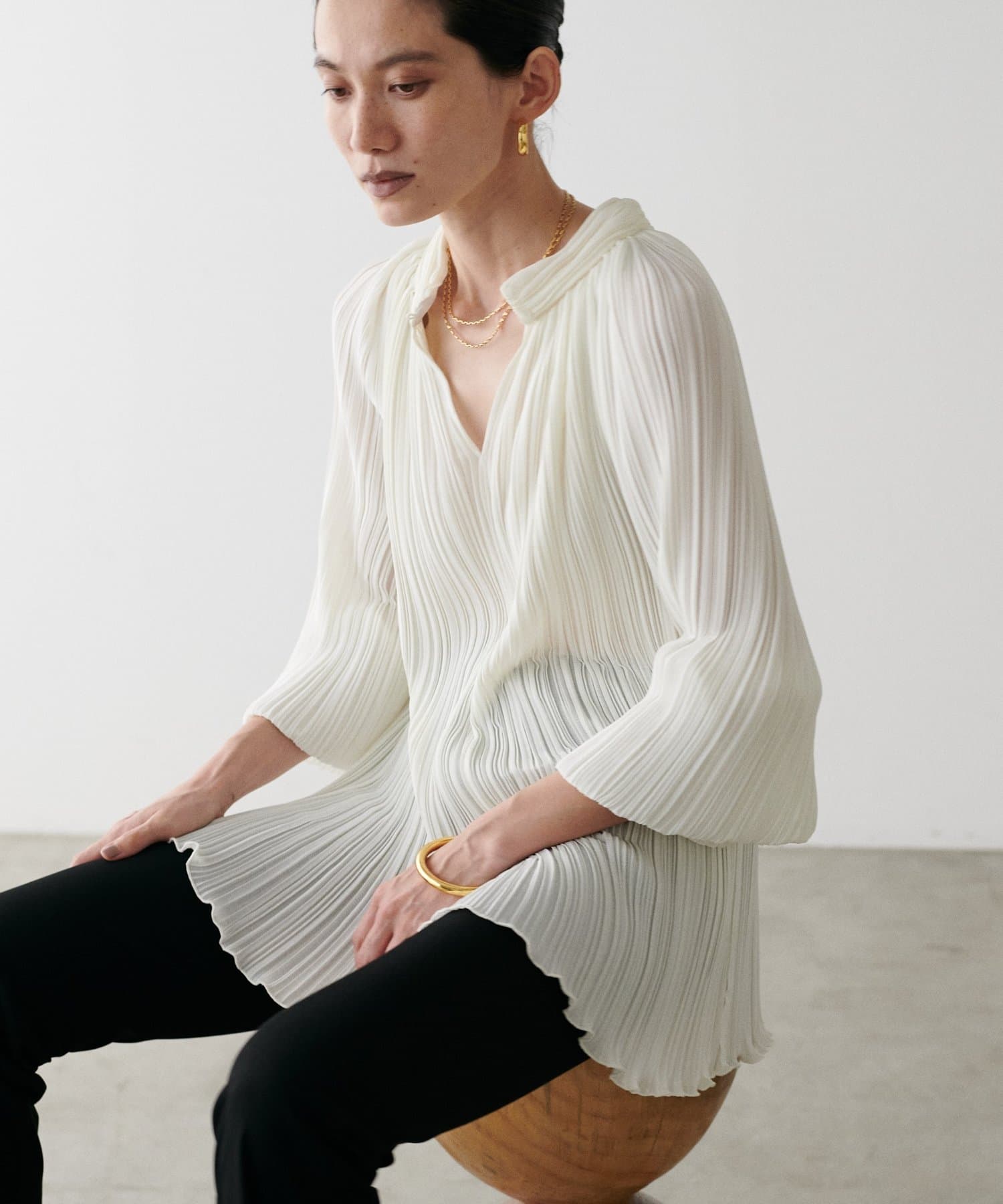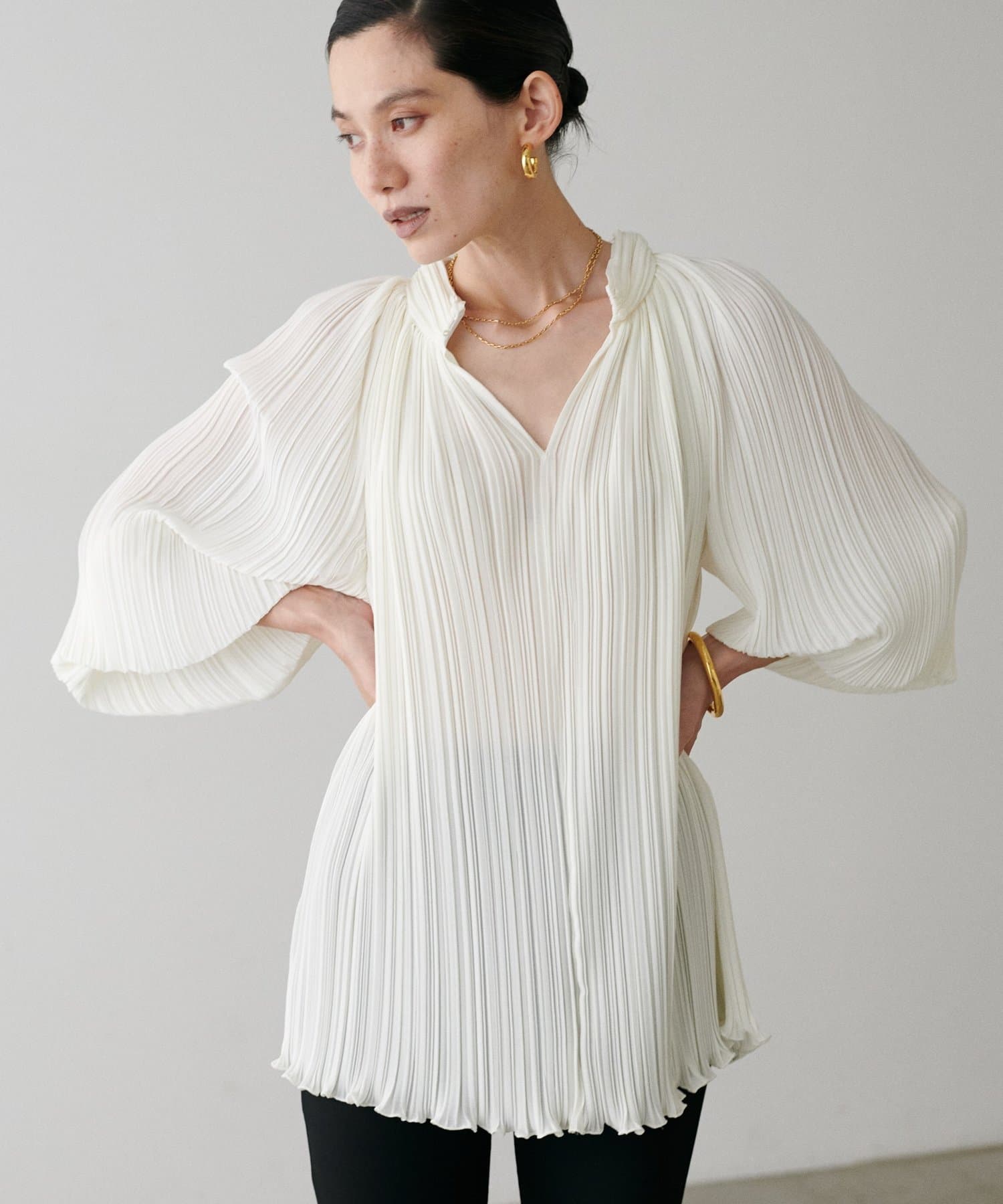 モックネックと開きのあるネックラインの前後2WAY仕様で楽しめる、プリーツ素材のブラウス。
