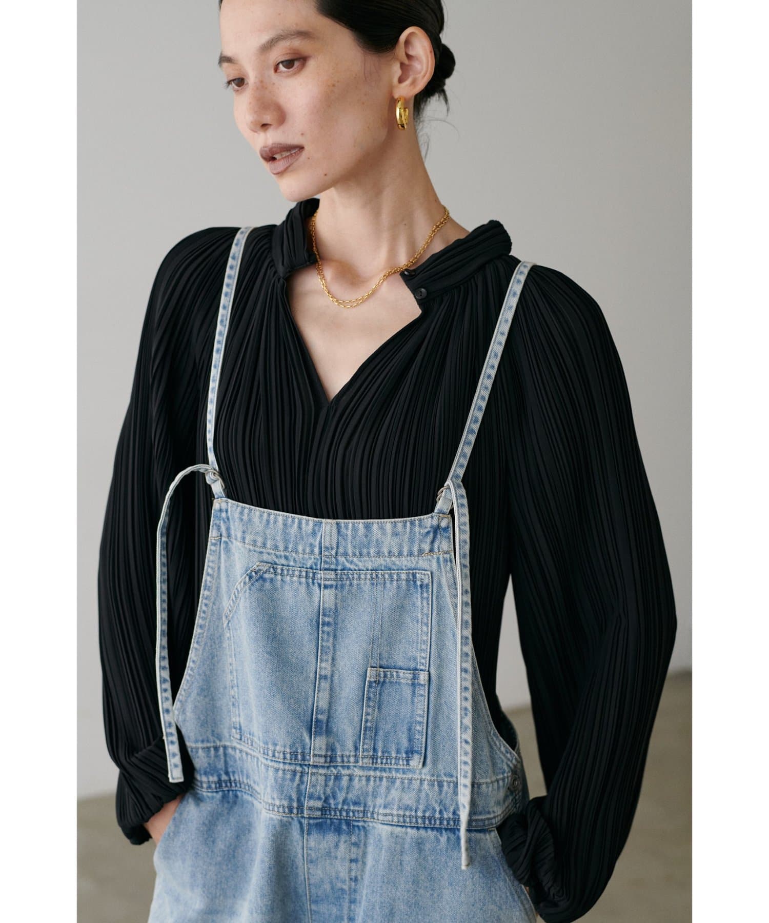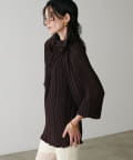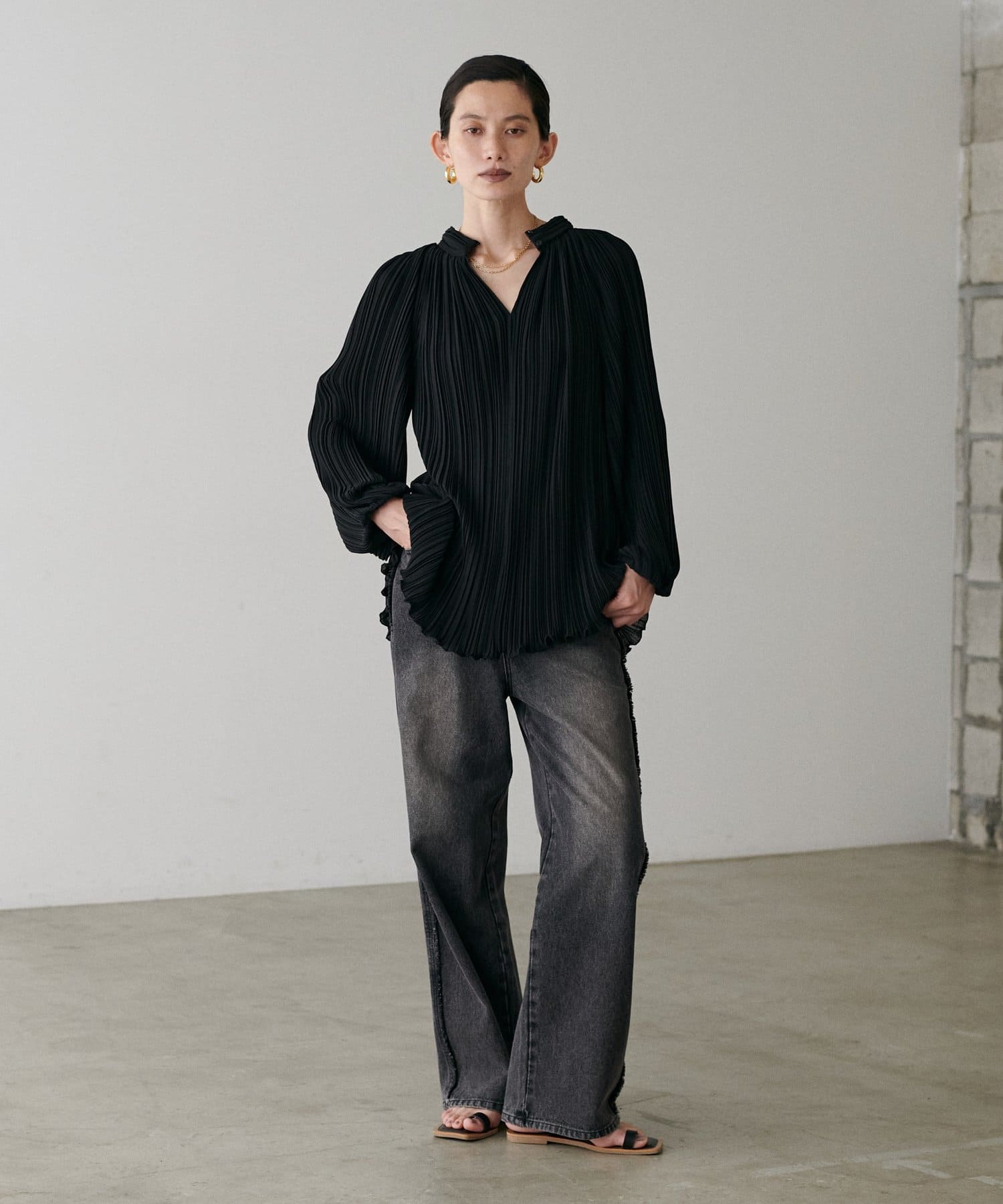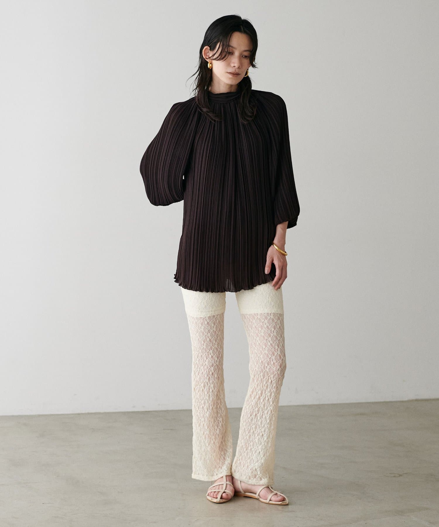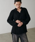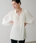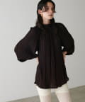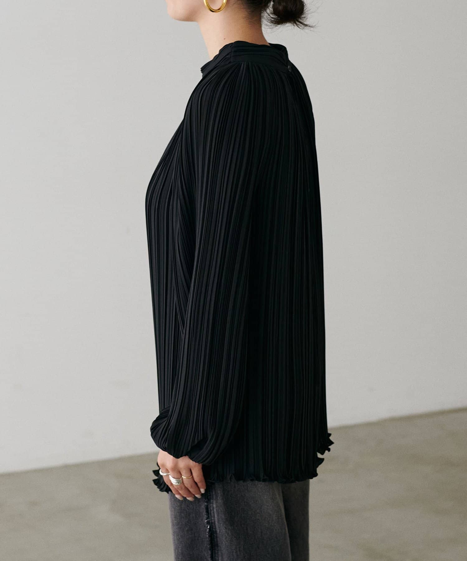 モックネックと開きのあるネックラインの前後2WAY仕様で楽しめる、プリーツ素材のブラウス。