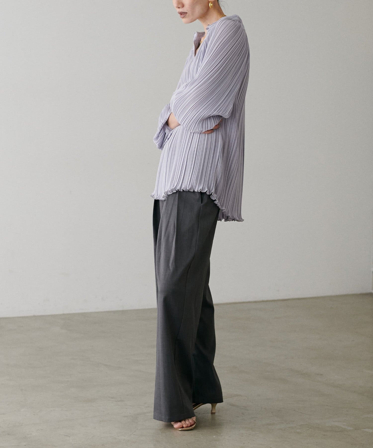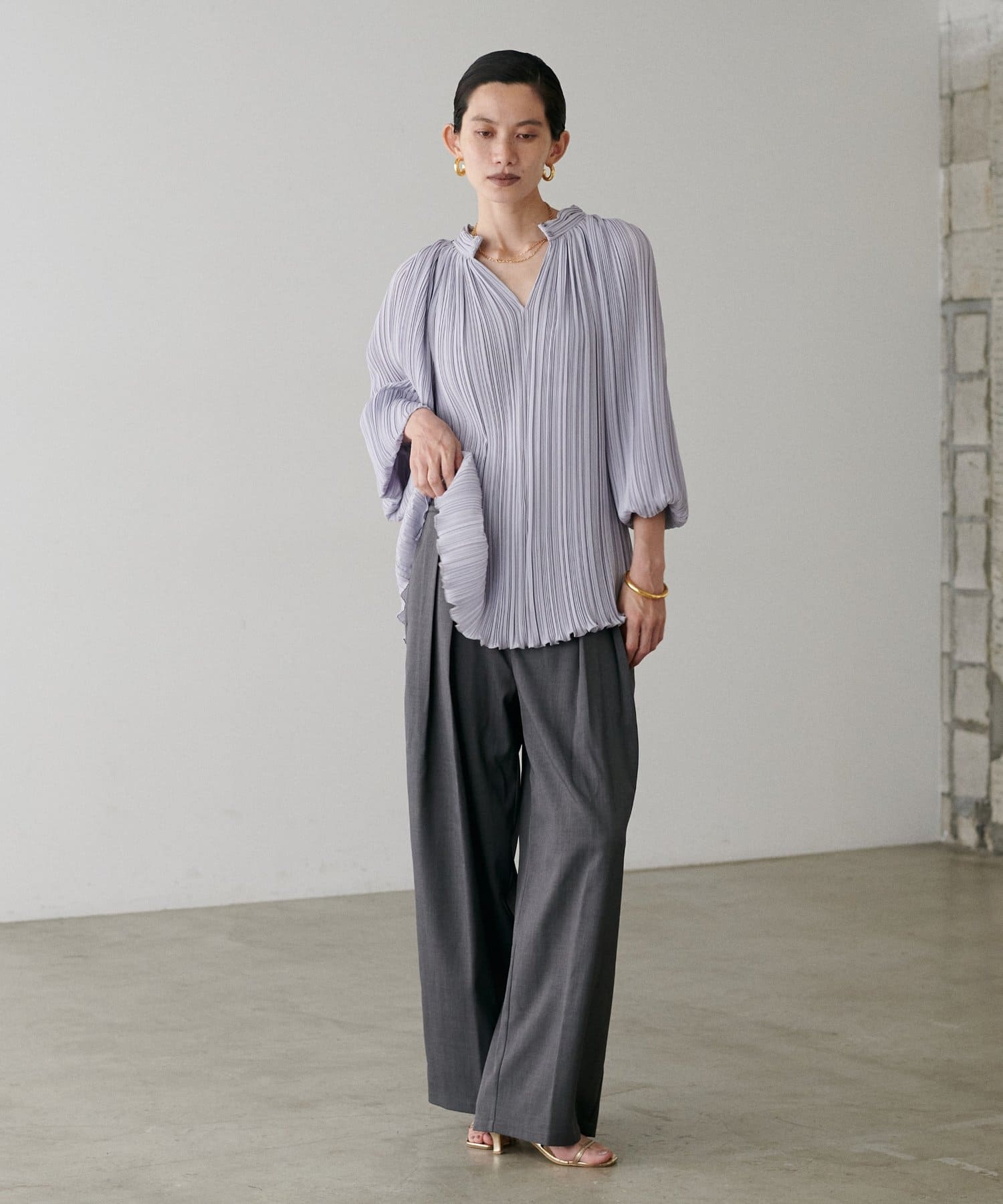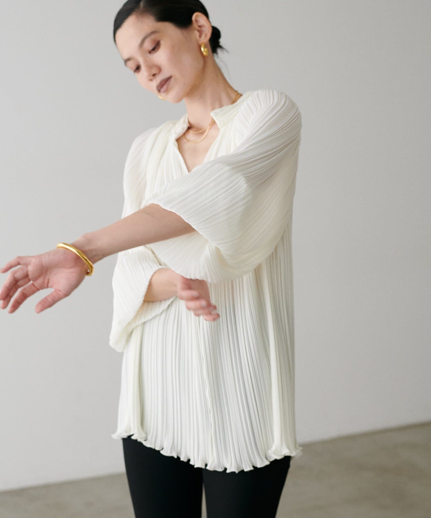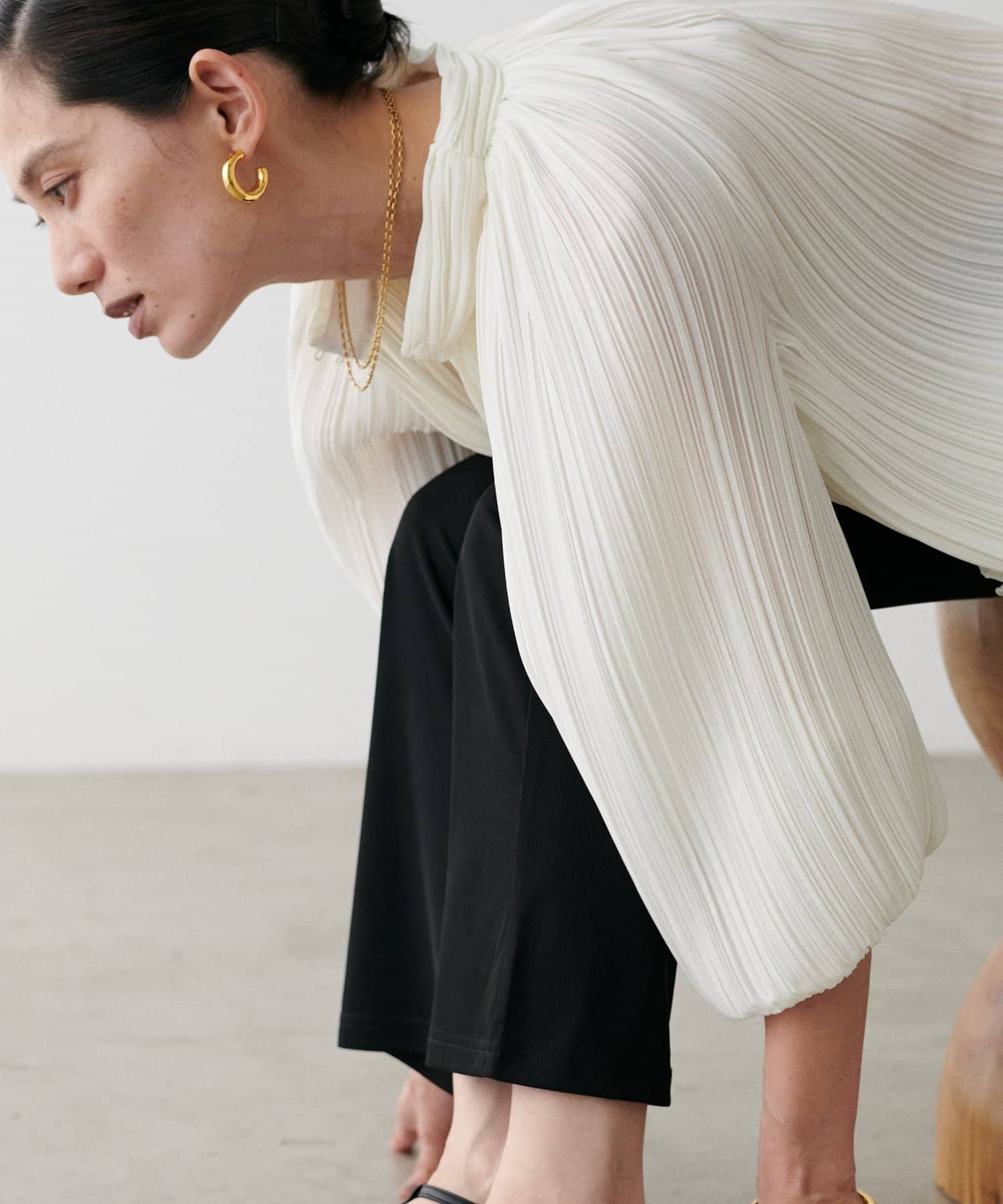 柔らかな落ち感のある素材に細かいプリーツを施し、軽やかさと上品さを兼ね備えた質感。