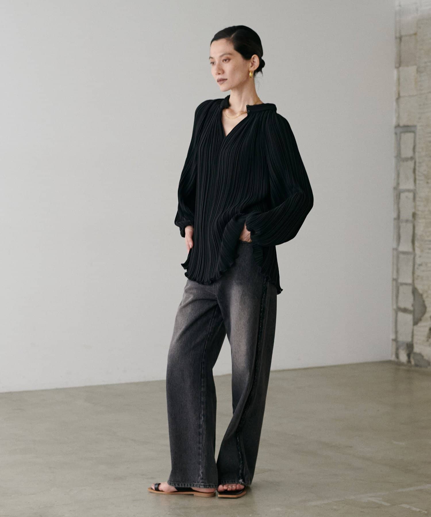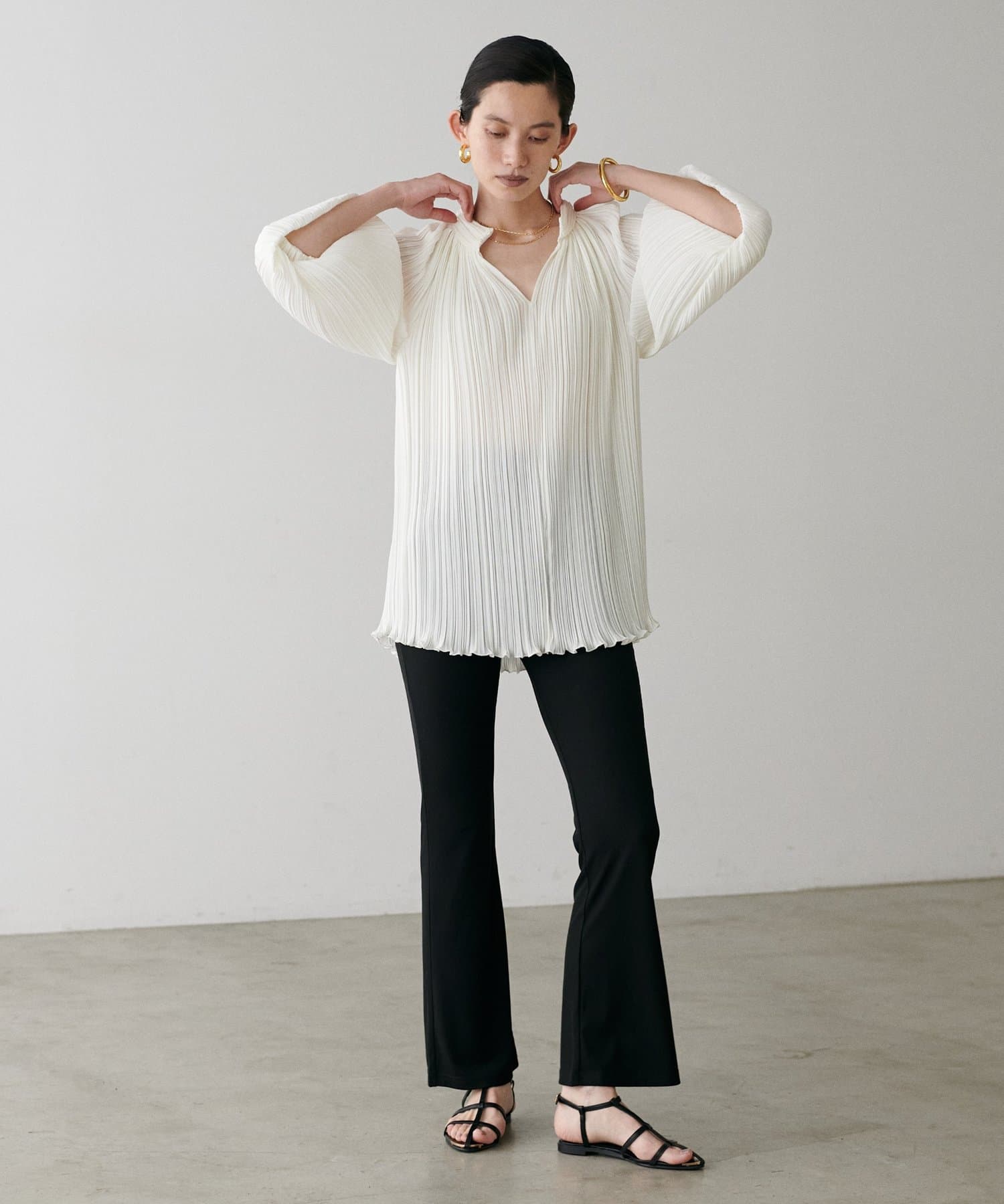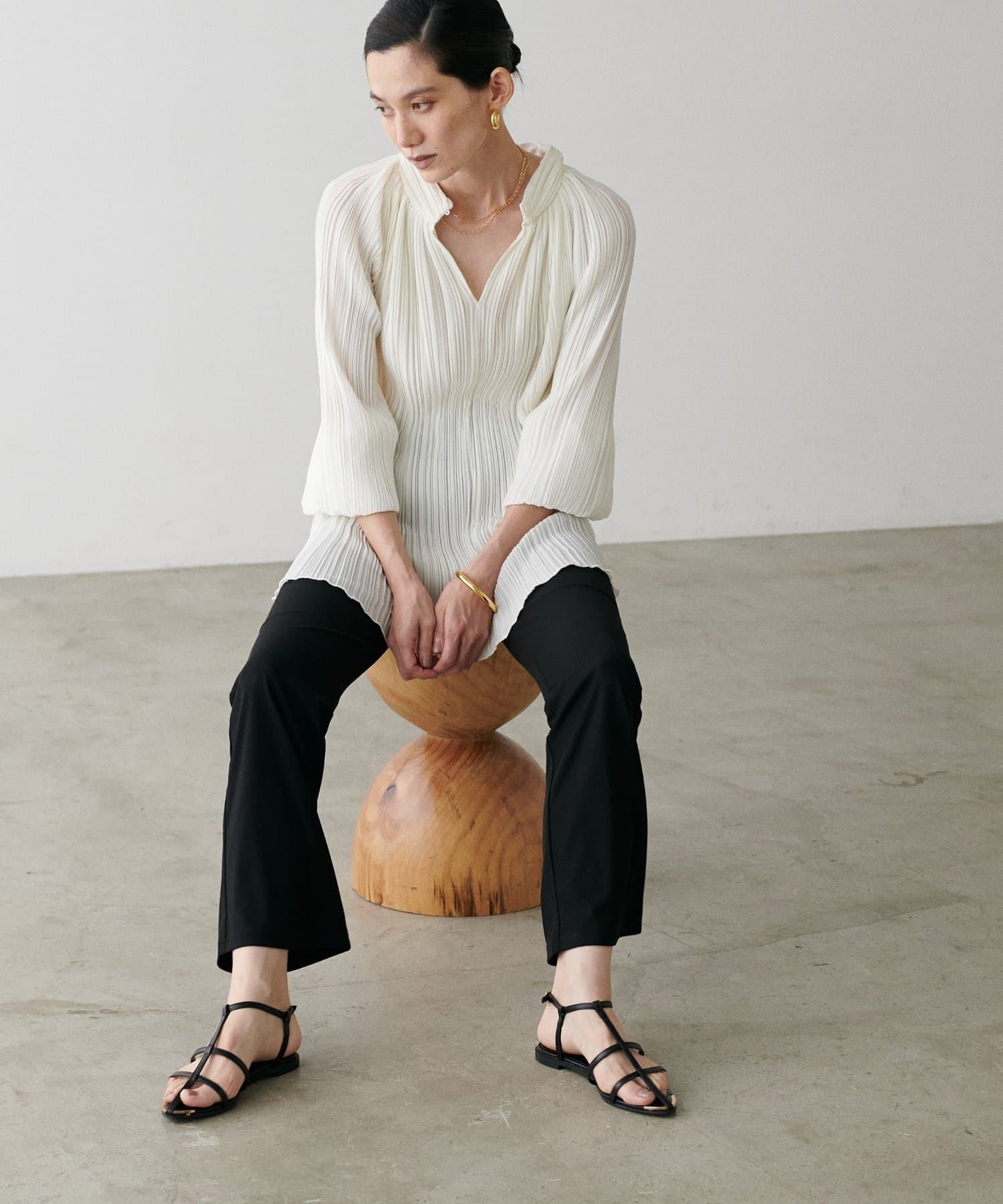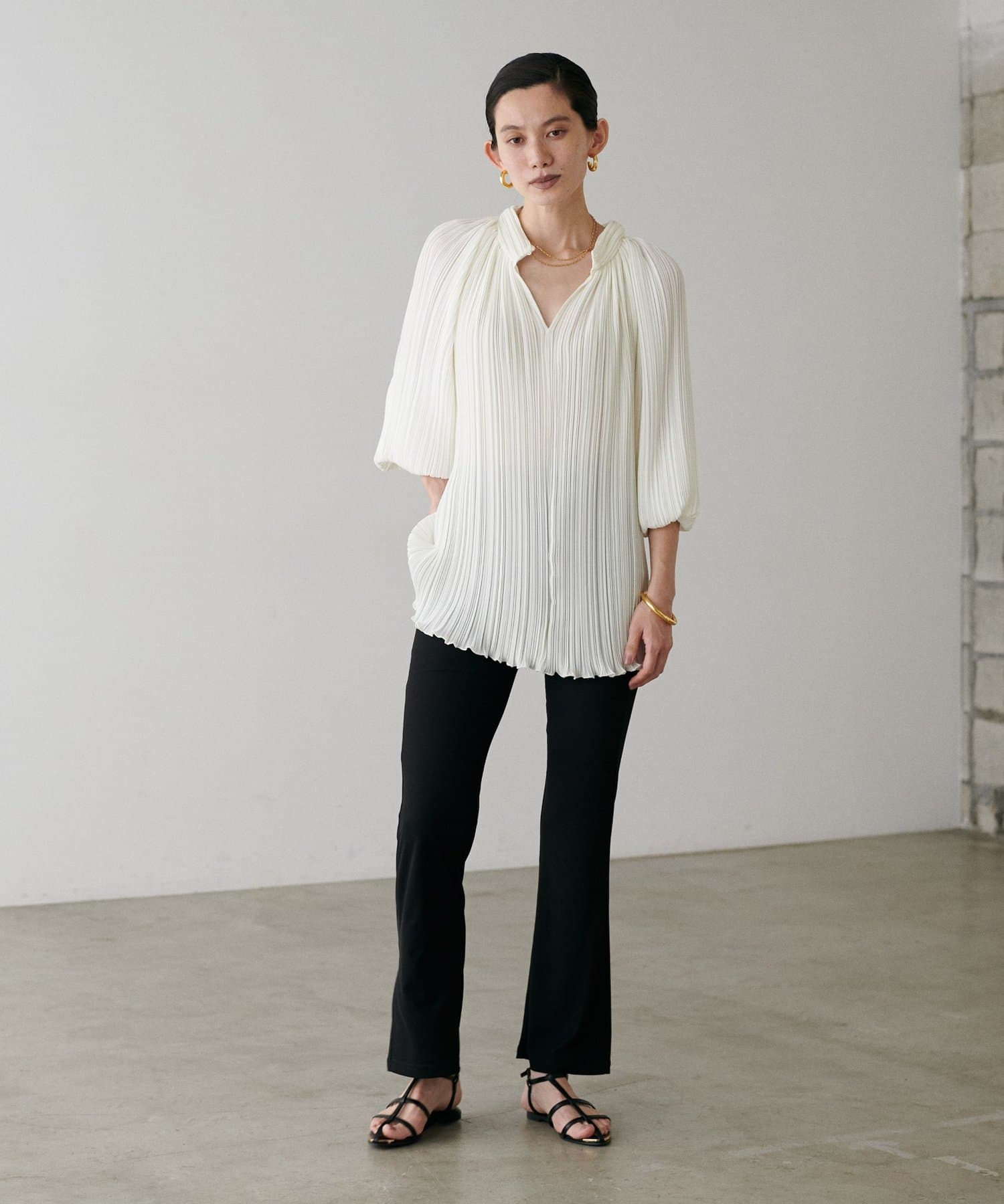 柔らかな落ち感のある素材に細かいプリーツを施し、軽やかさと上品さを兼ね備えた質感。