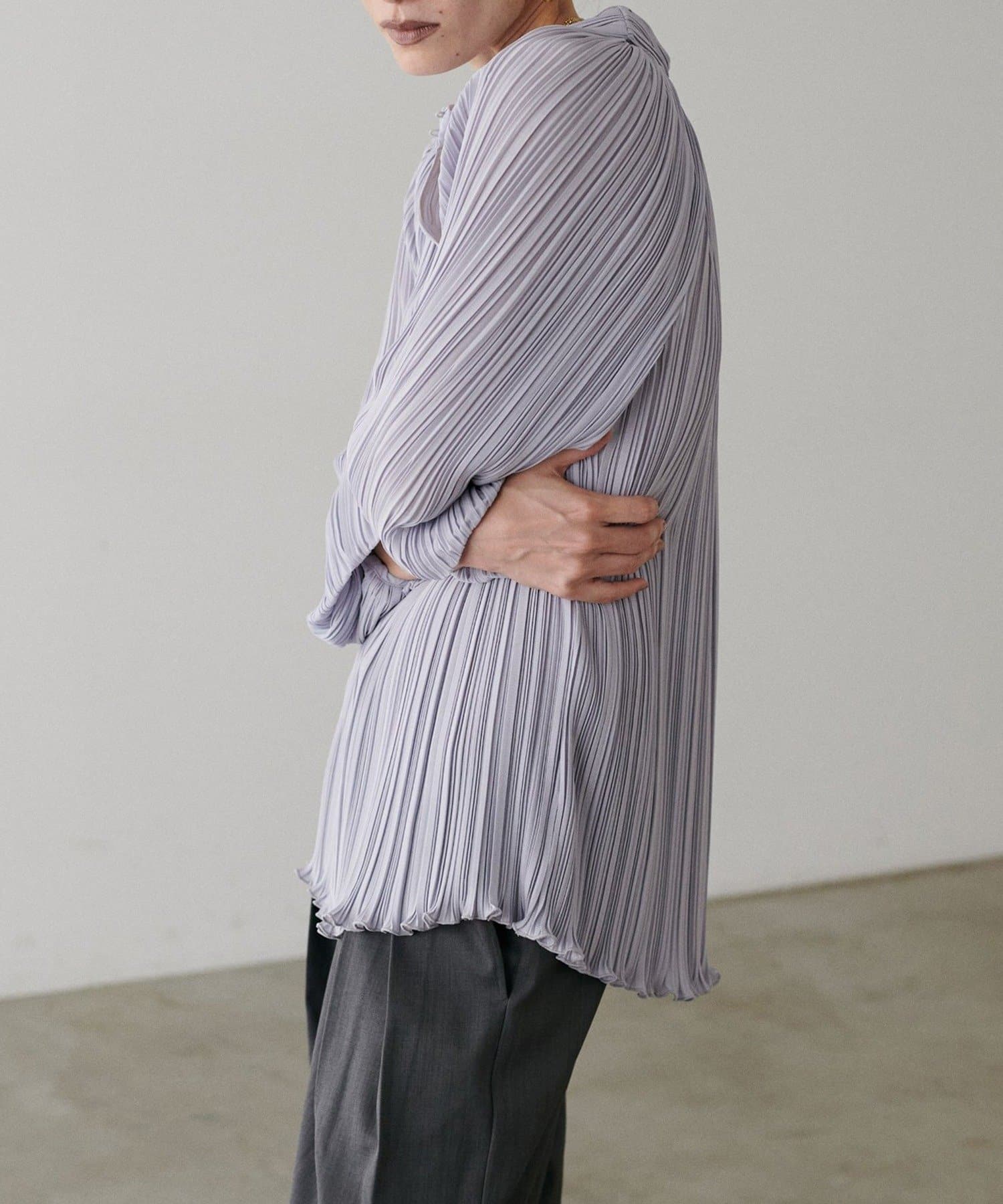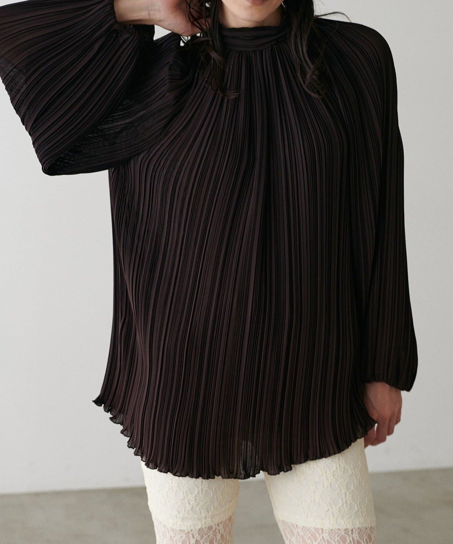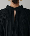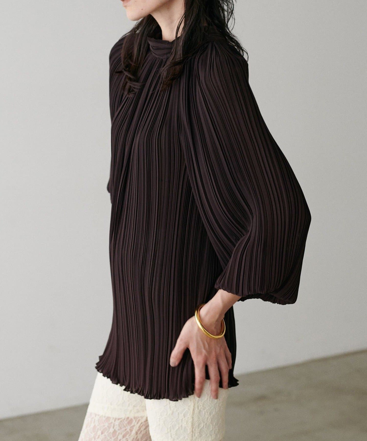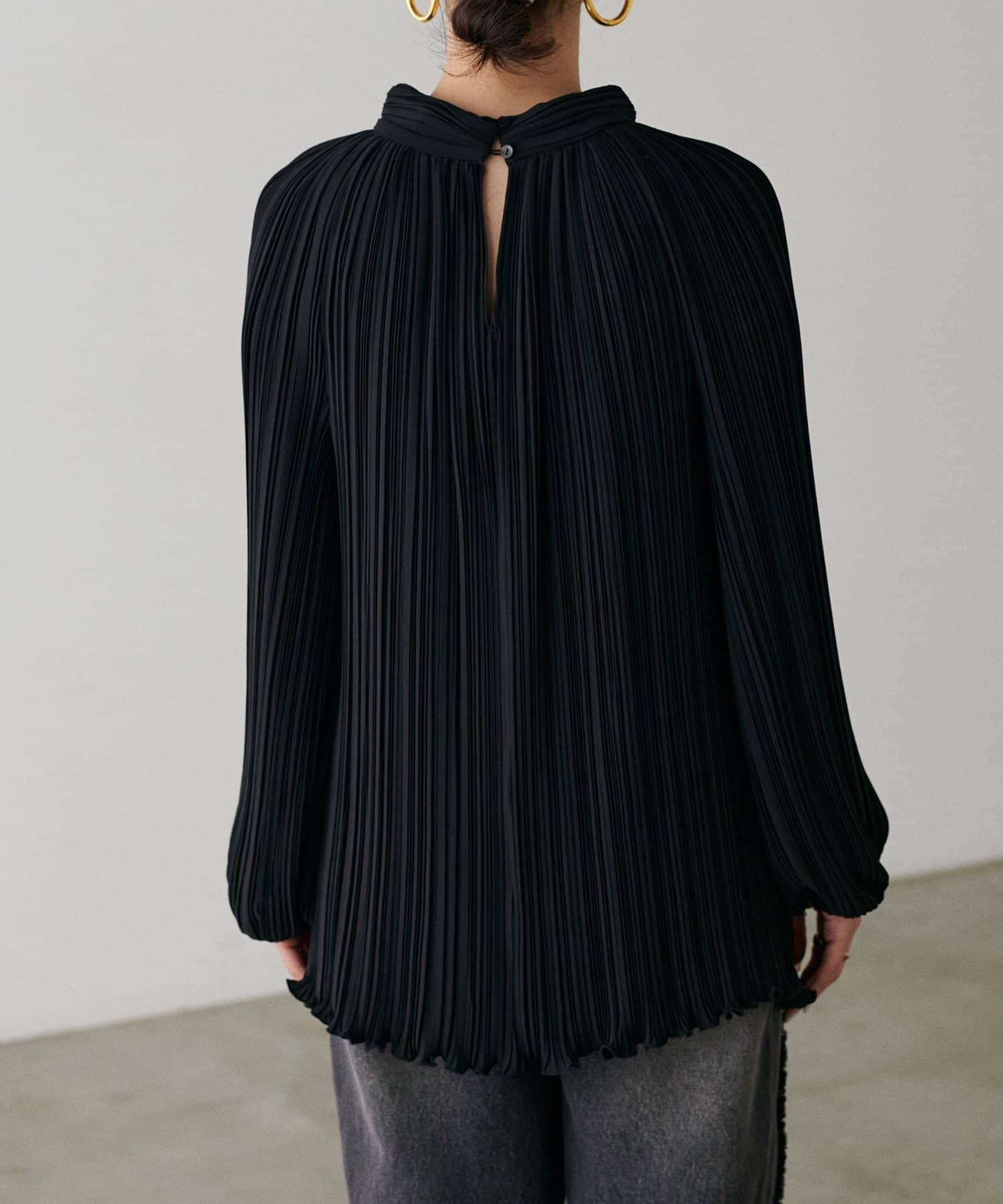 モックネックと開きのあるネックラインの前後2WAY仕様で楽しめる、プリーツ素材のブラウス。