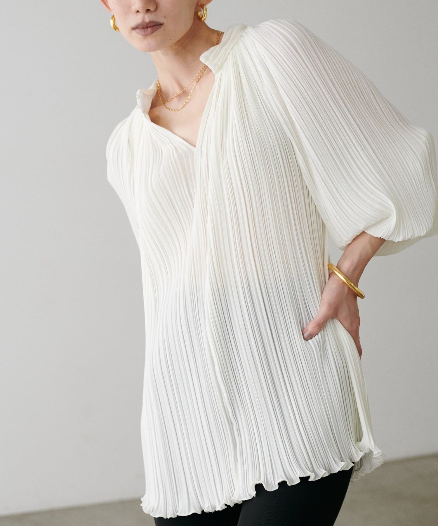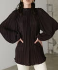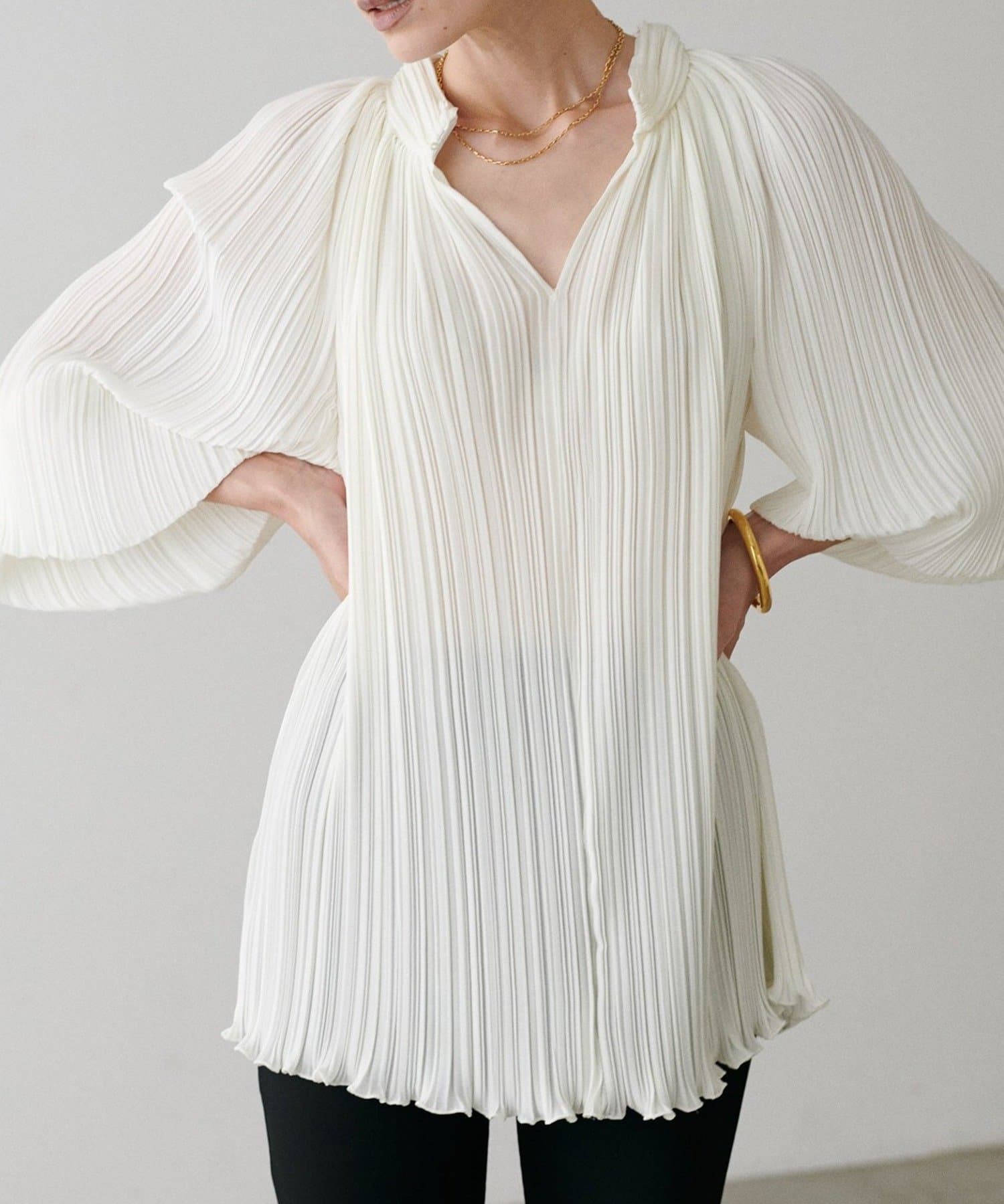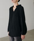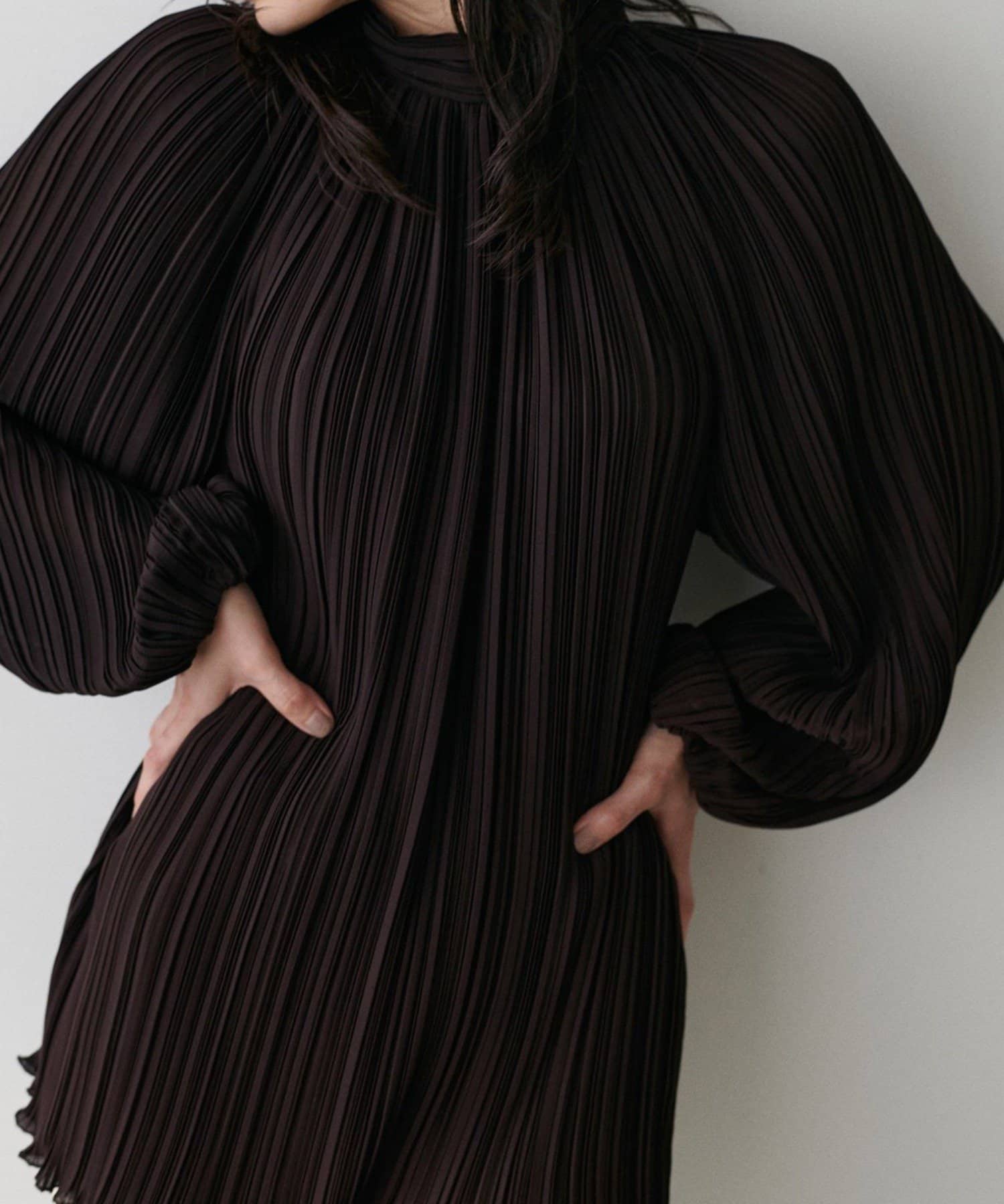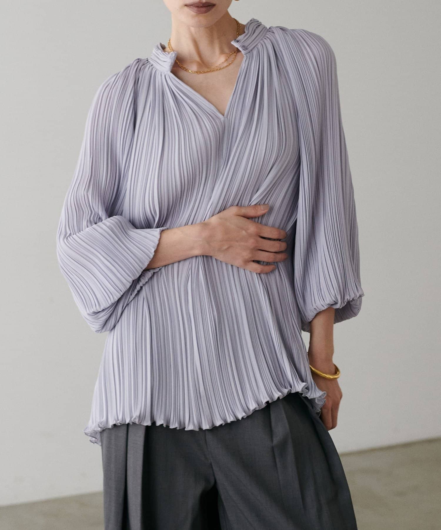 モックネックと開きのあるネックラインの前後2WAY仕様で楽しめる、プリーツ素材のブラウス。