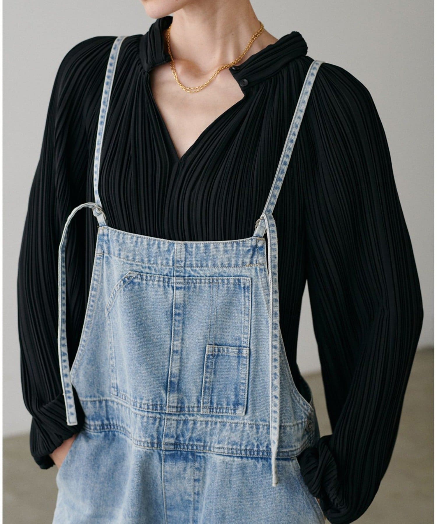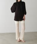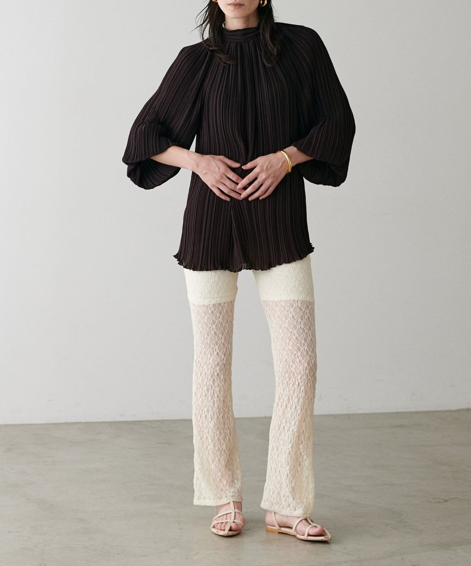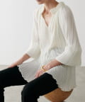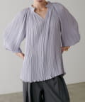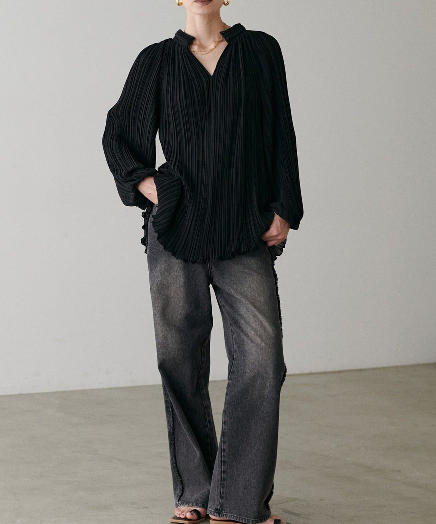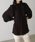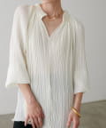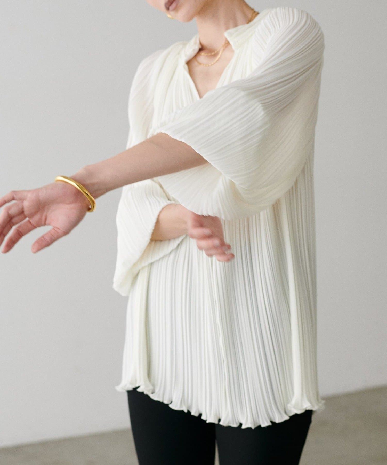 モックネックと開きのあるネックラインの前後2WAY仕様で楽しめる、プリーツ素材のブラウス。