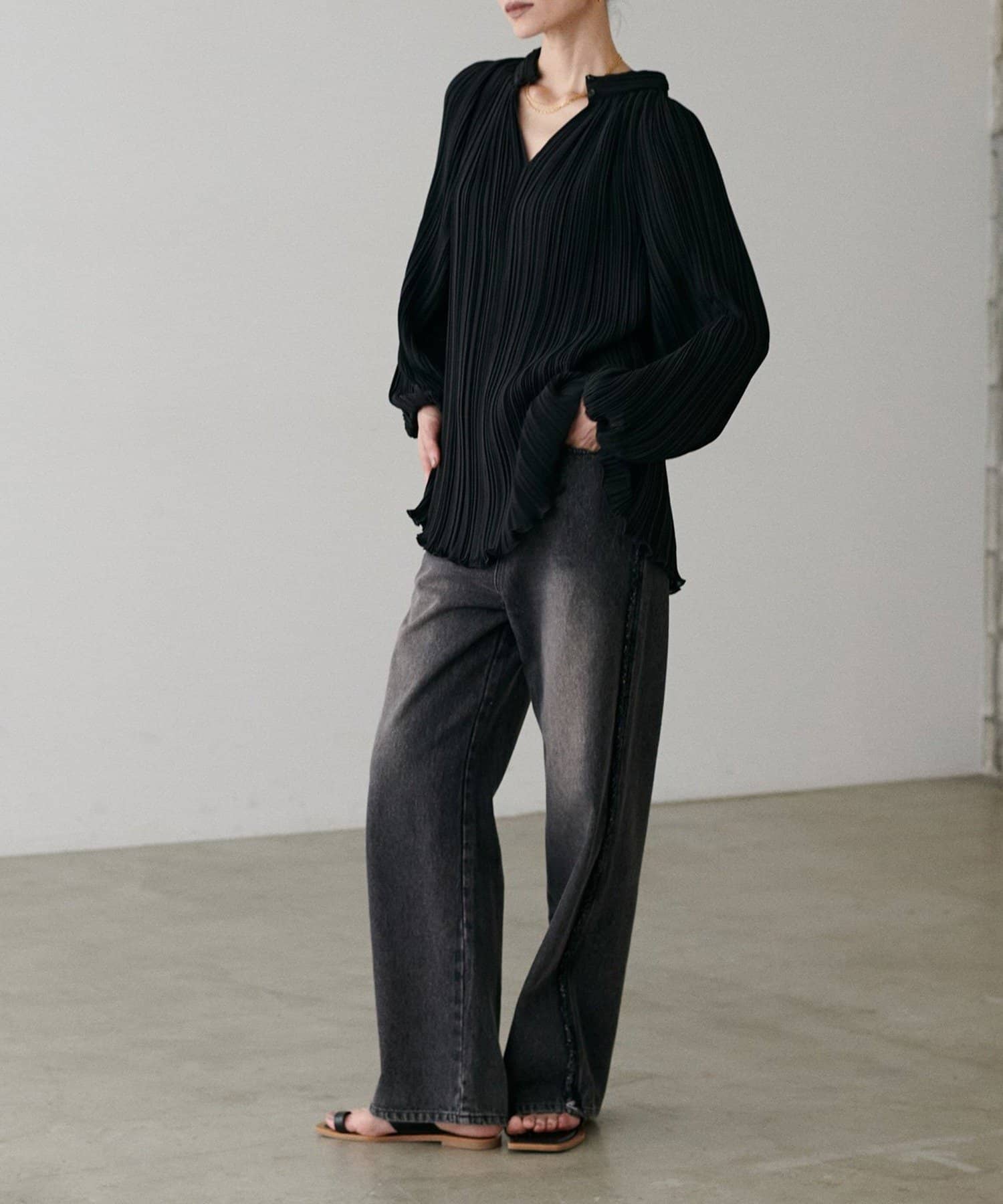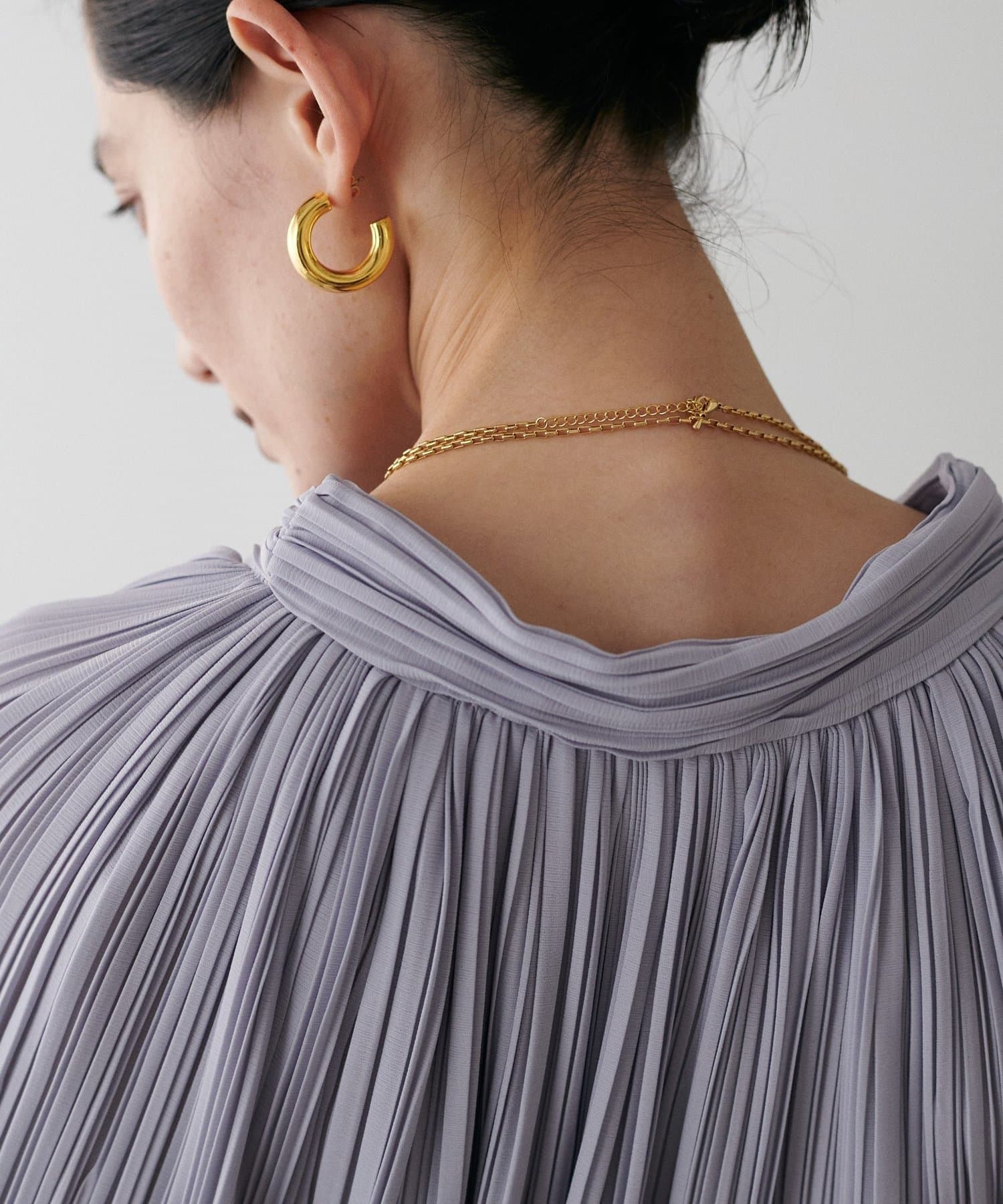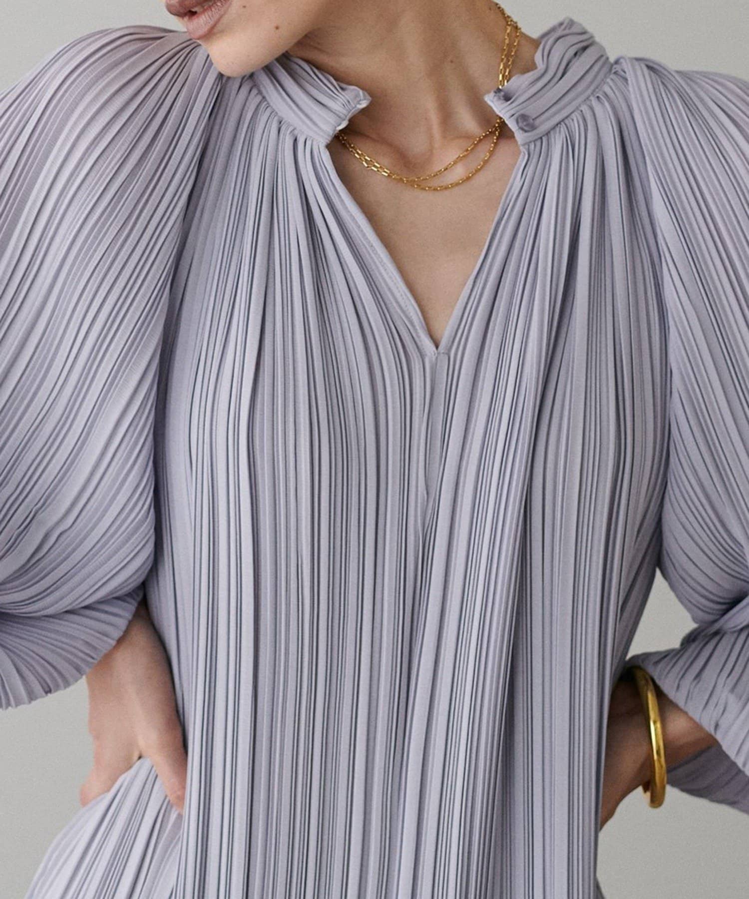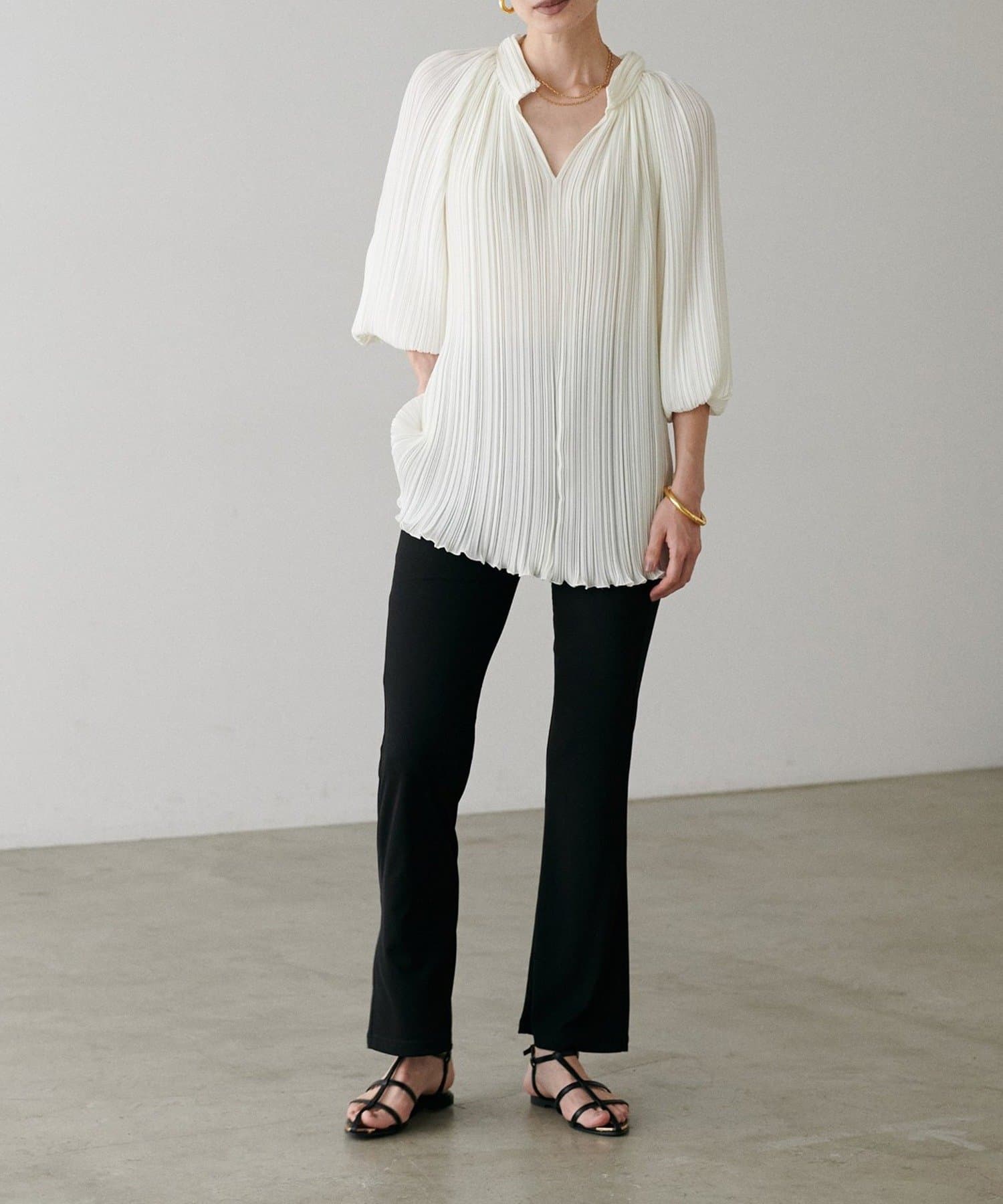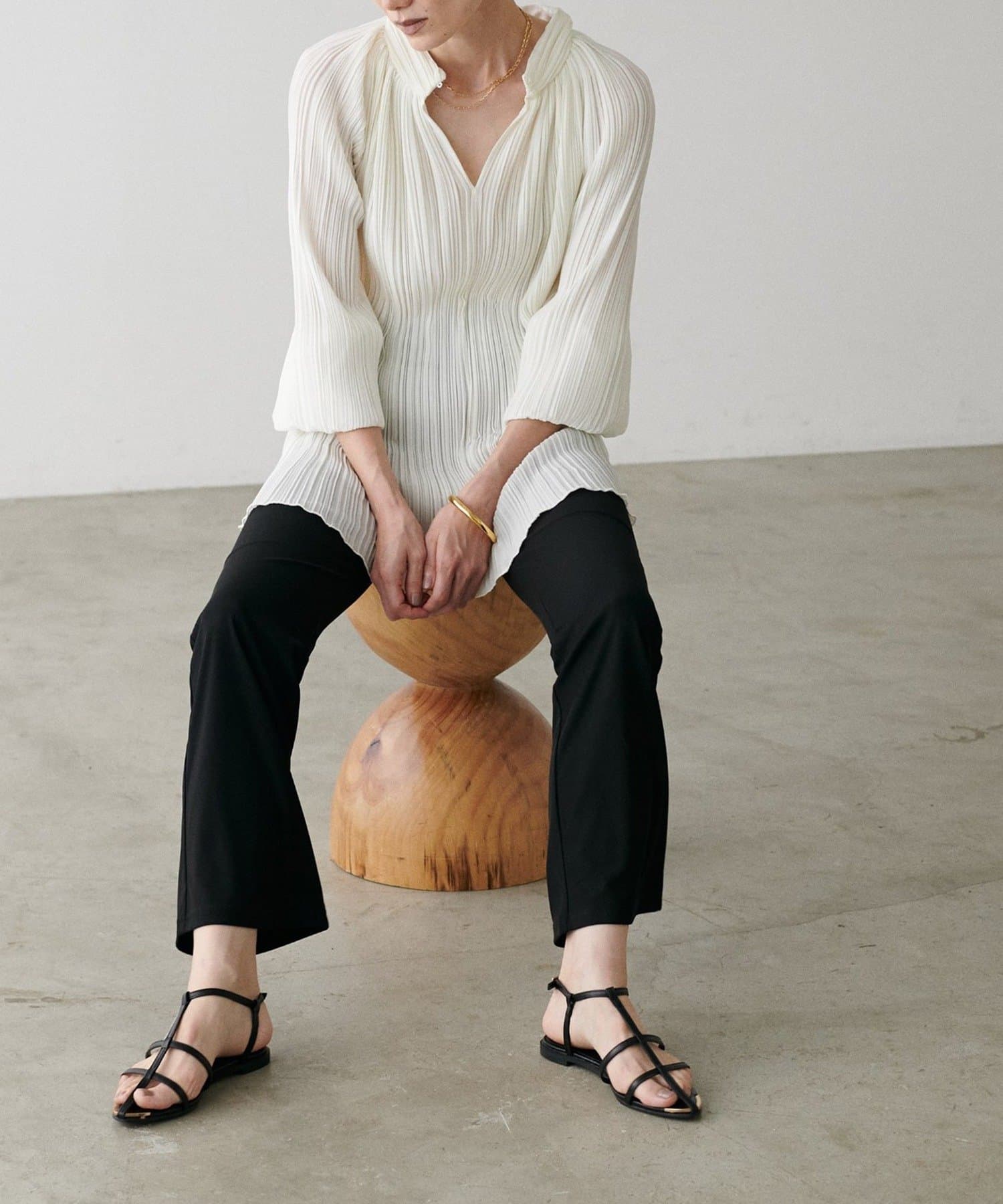 柔らかな落ち感のある素材に細かいプリーツを施し、軽やかさと上品さを兼ね備えた質感。