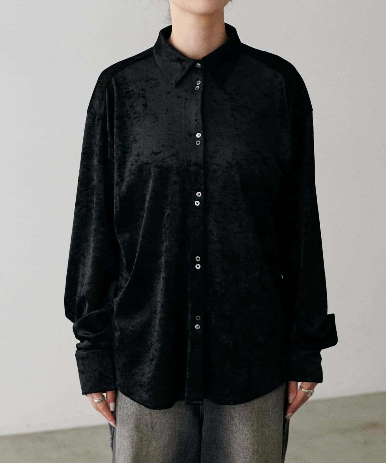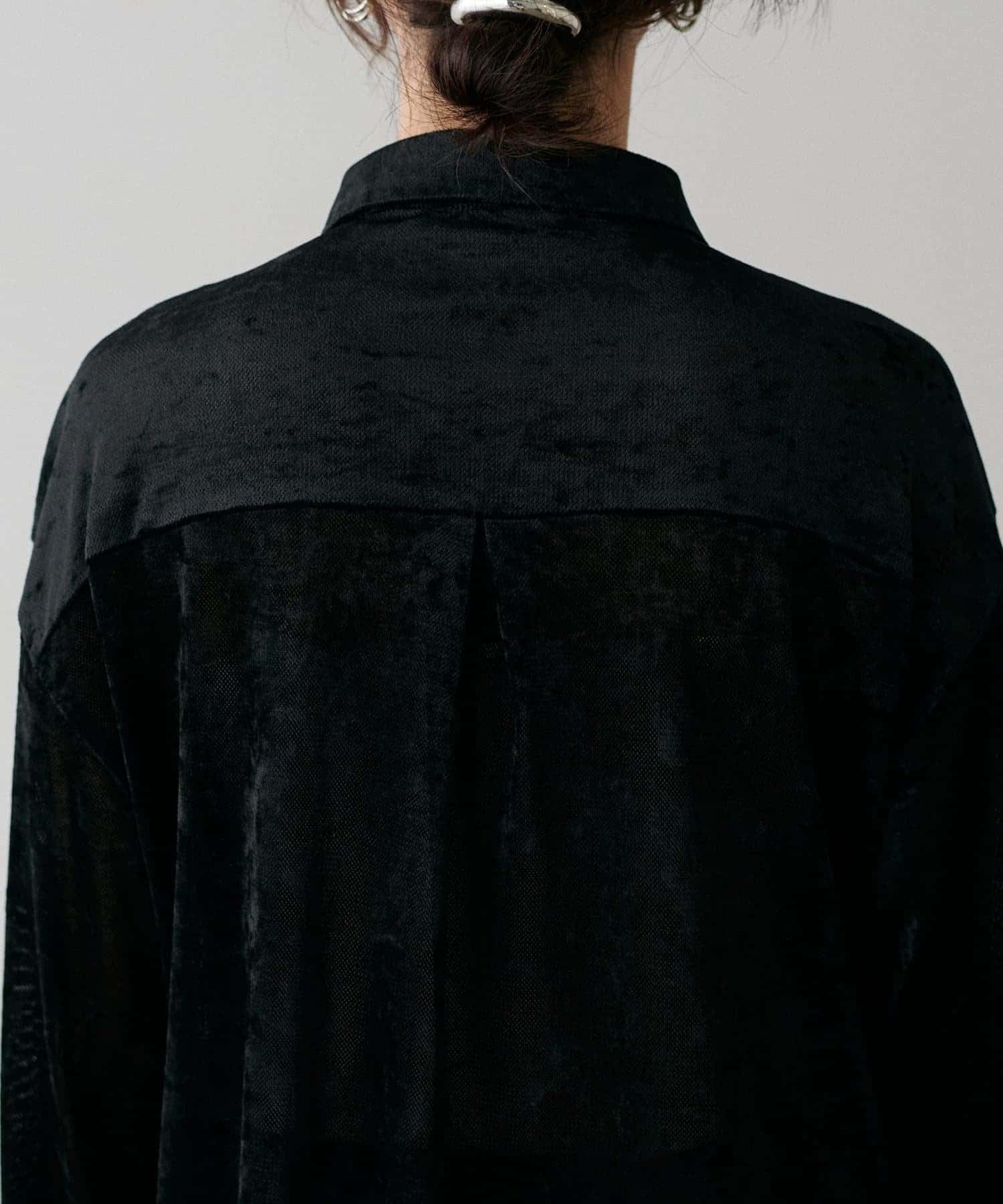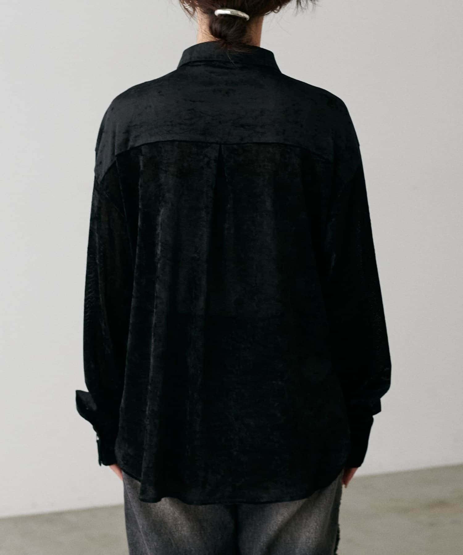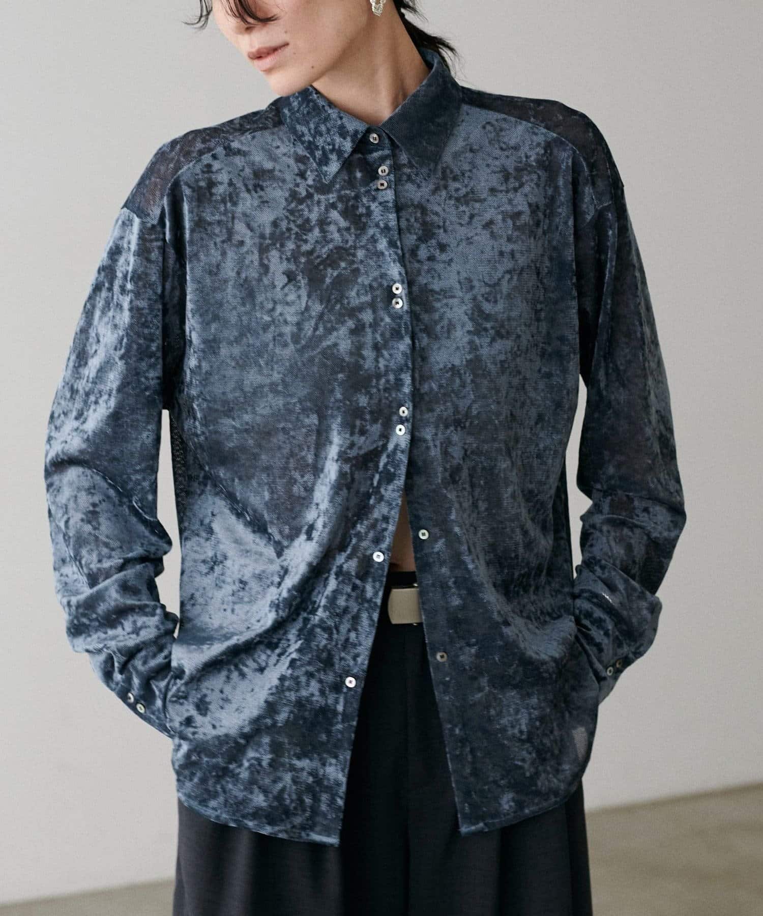 繊細な透け感が魅力のシアーメッシュ素材に、上品な光沢をまとわせたベロア調シャツ。