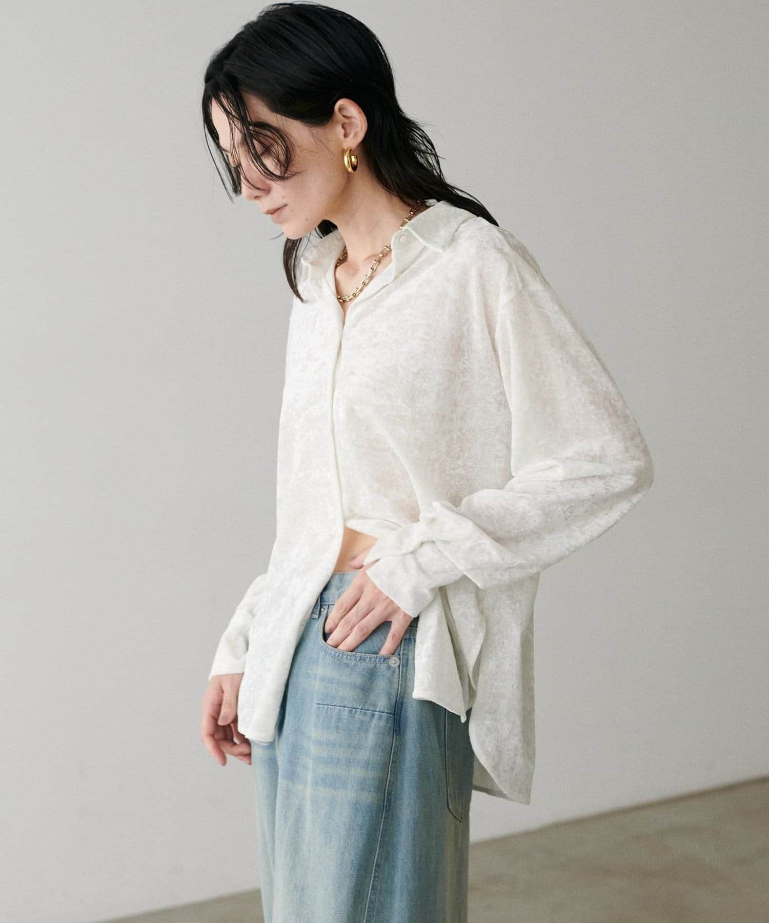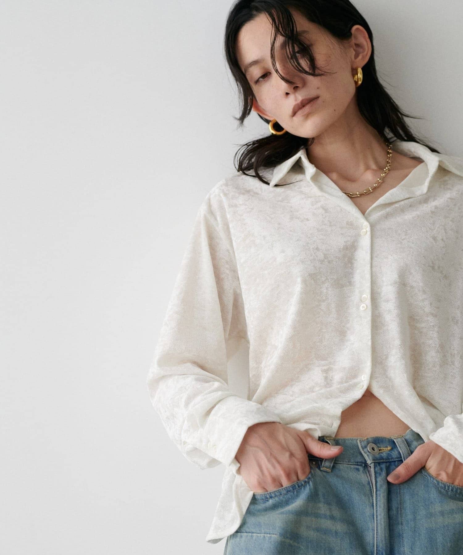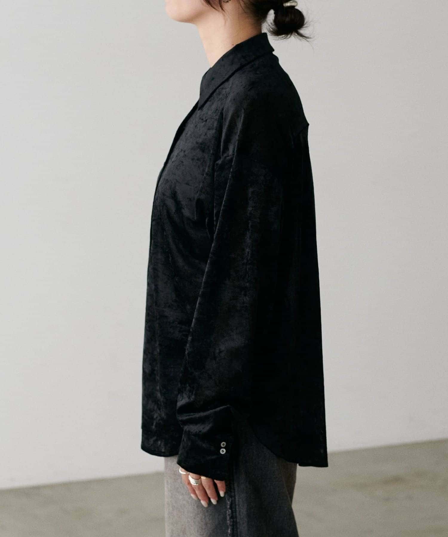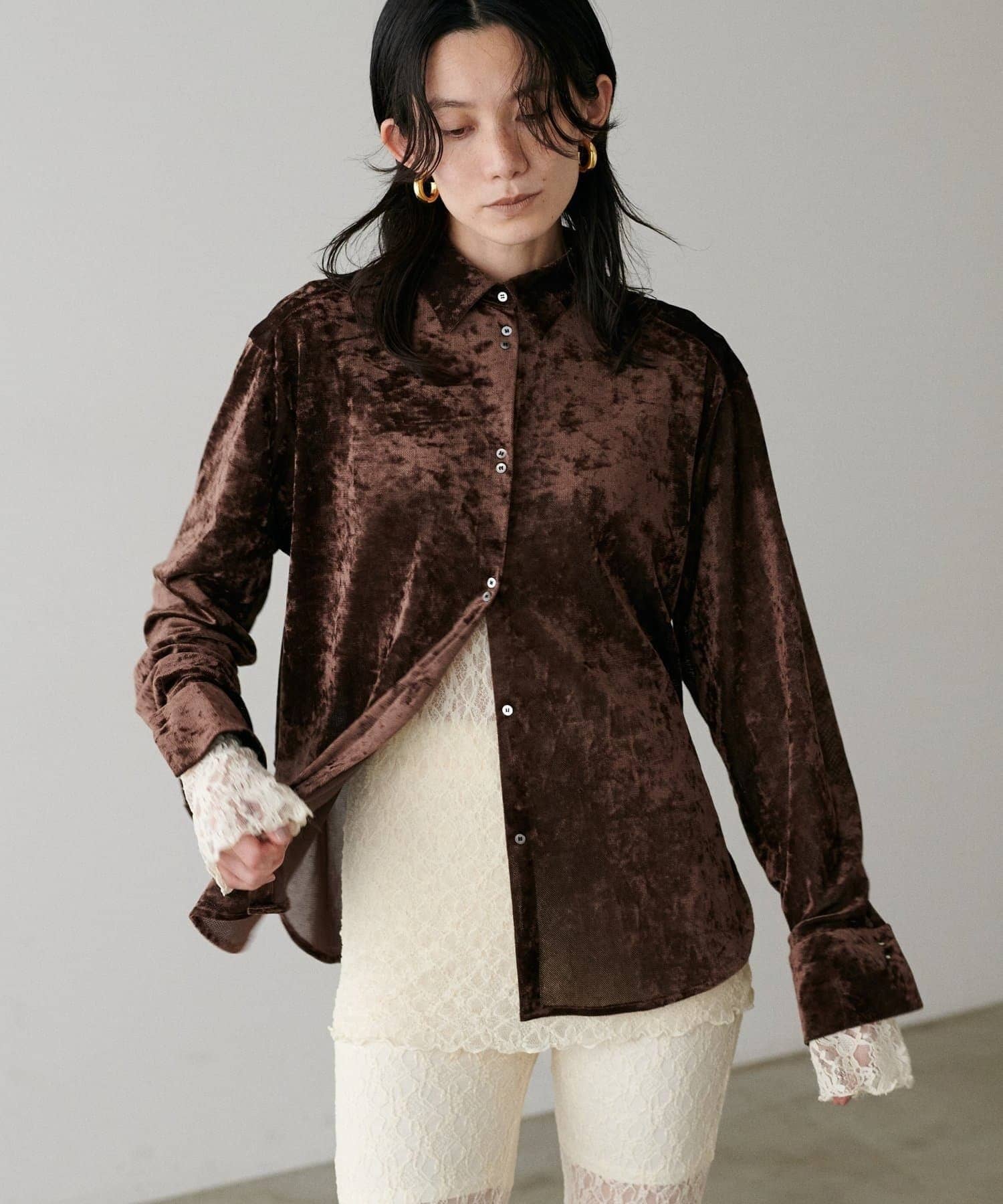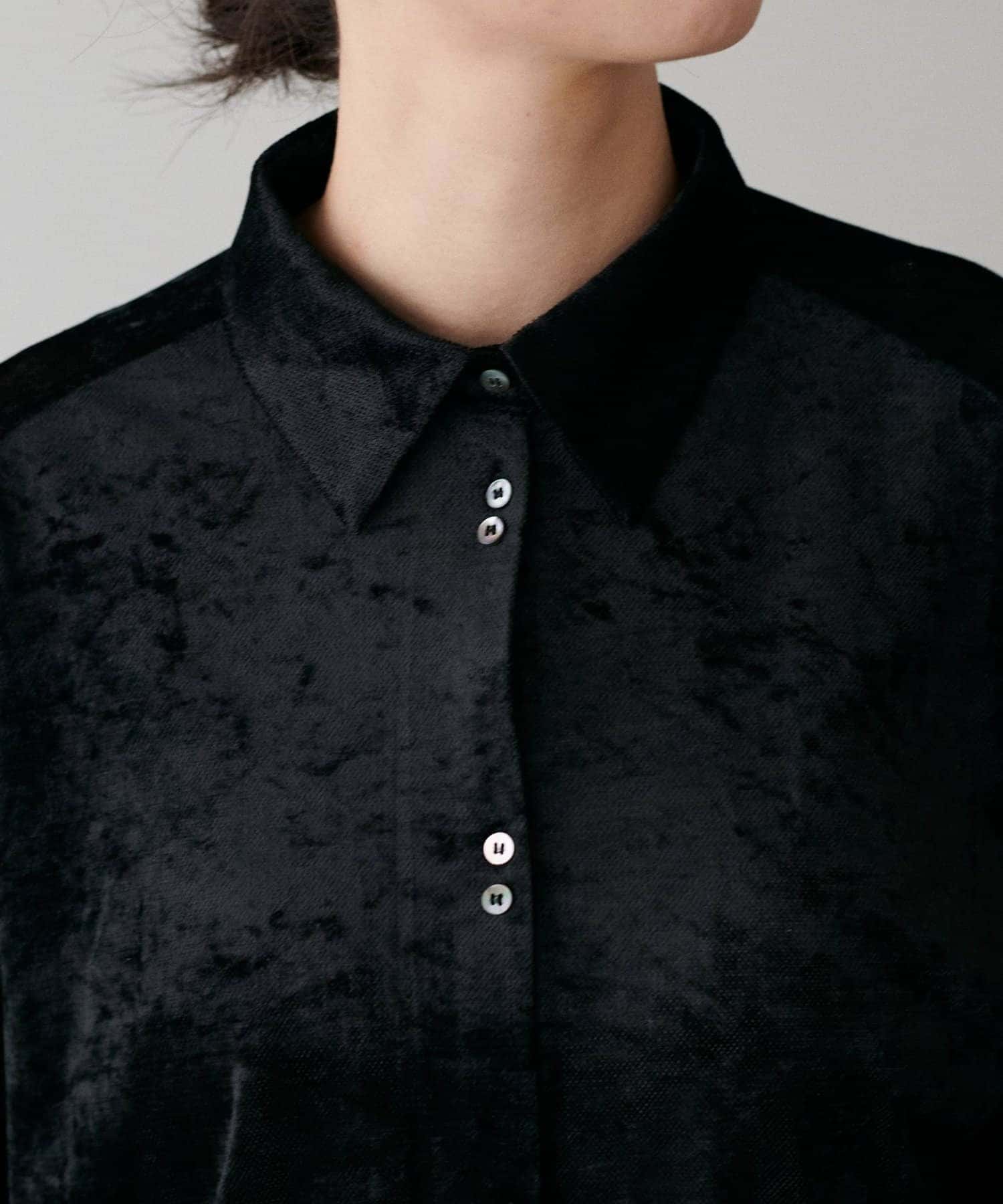 繊細な透け感が魅力のシアーメッシュ素材に、上品な光沢をまとわせたベロア調シャツ。