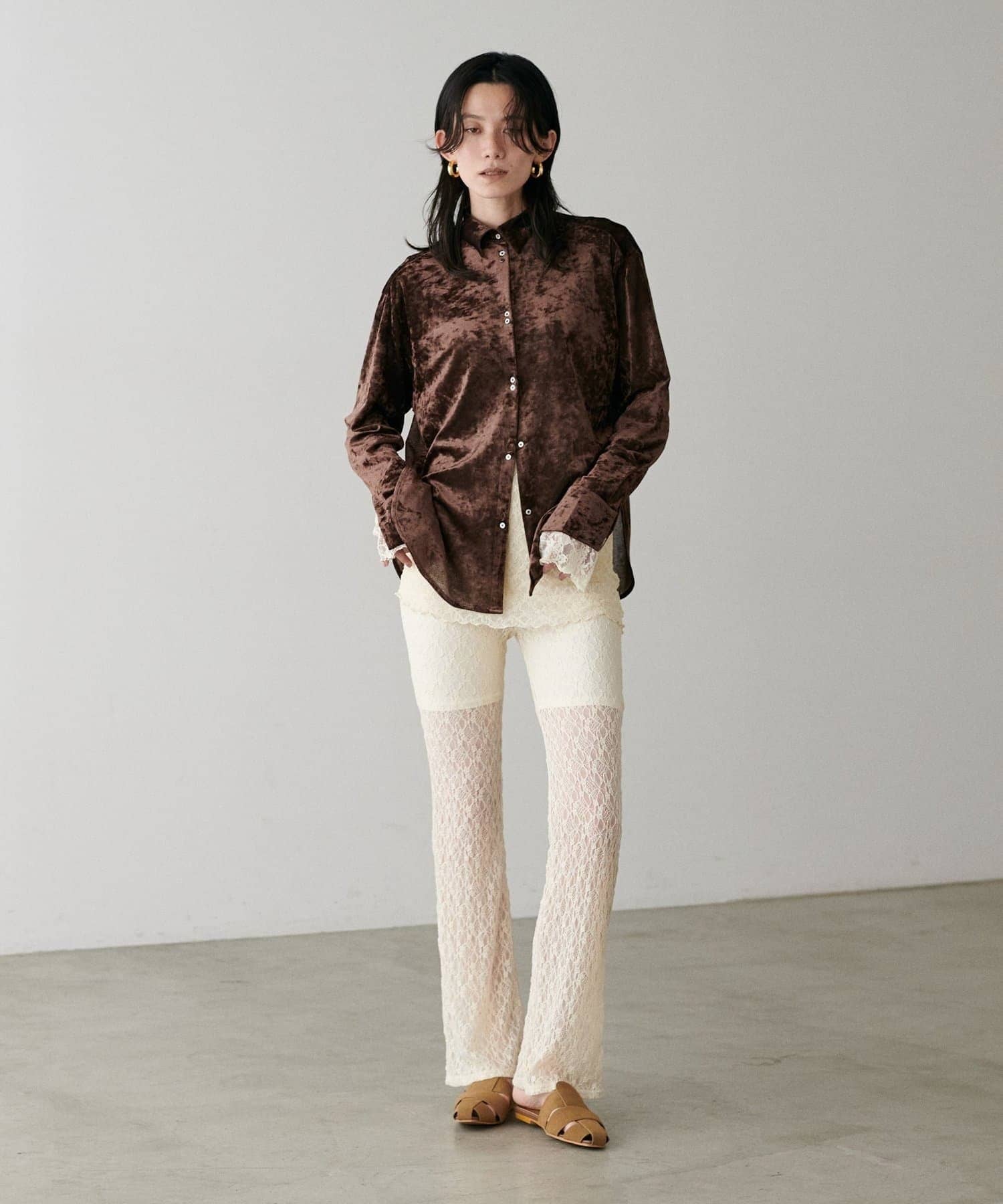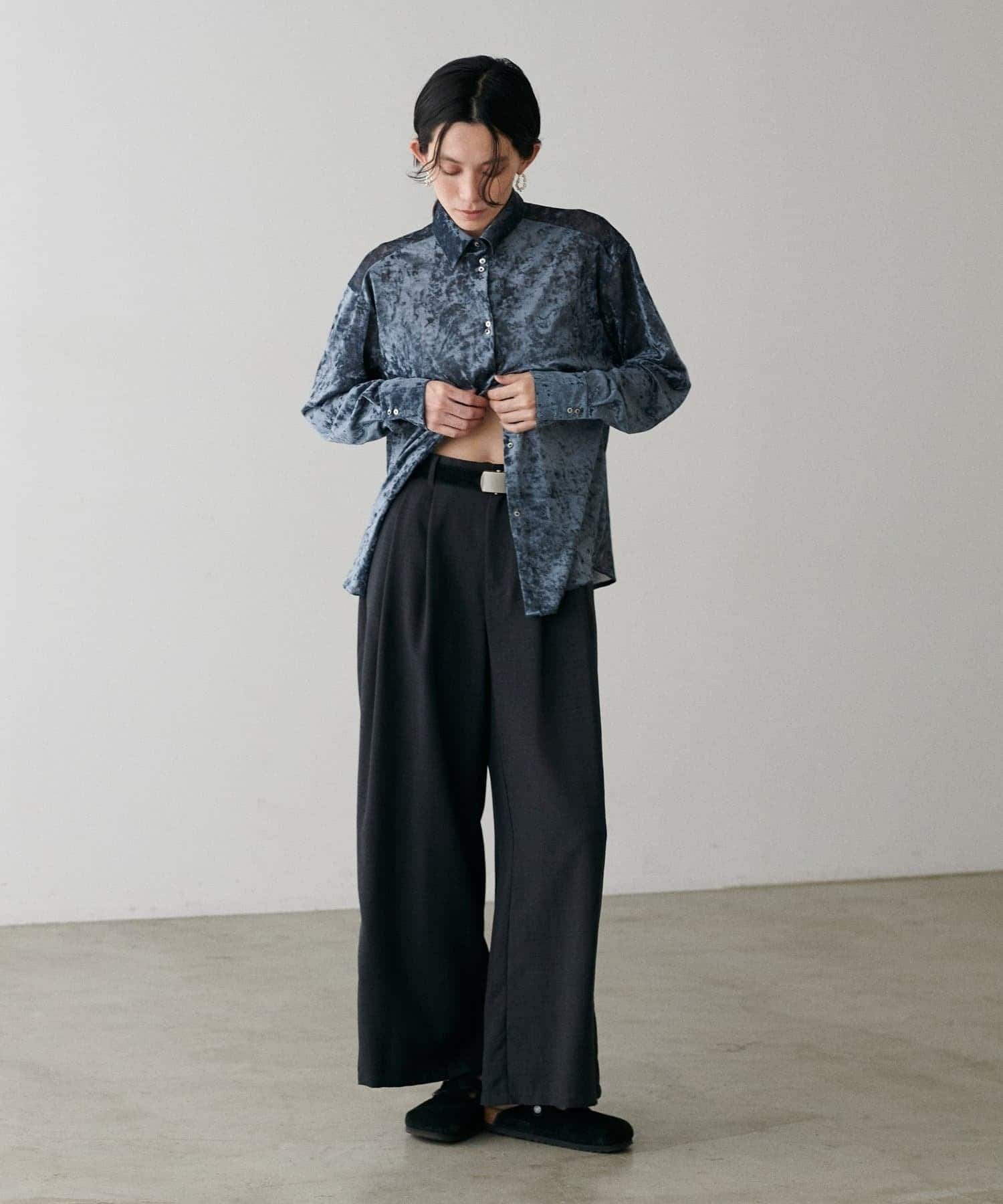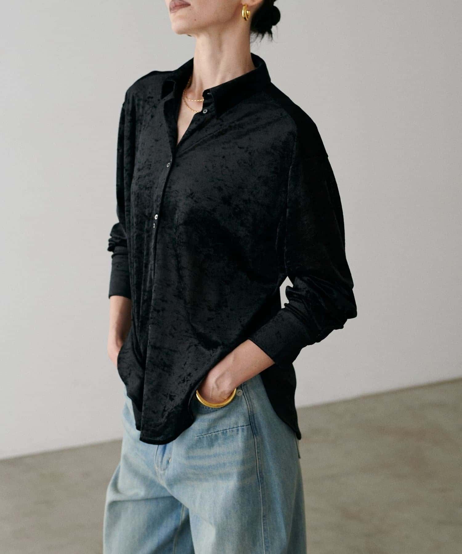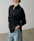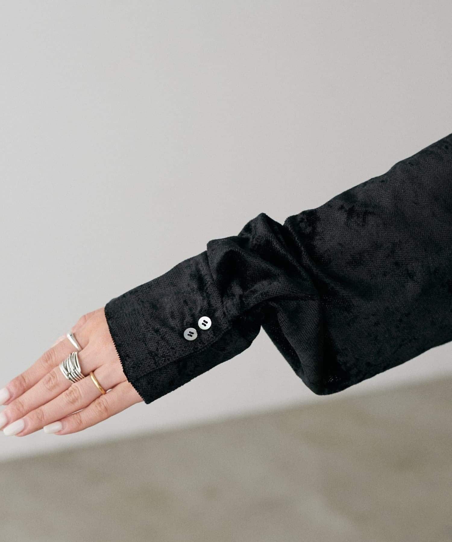 繊細な透け感が魅力のシアーメッシュ素材に、上品な光沢をまとわせたベロア調シャツ。