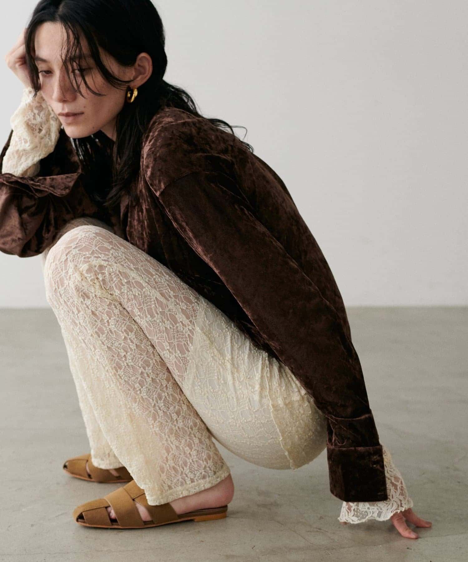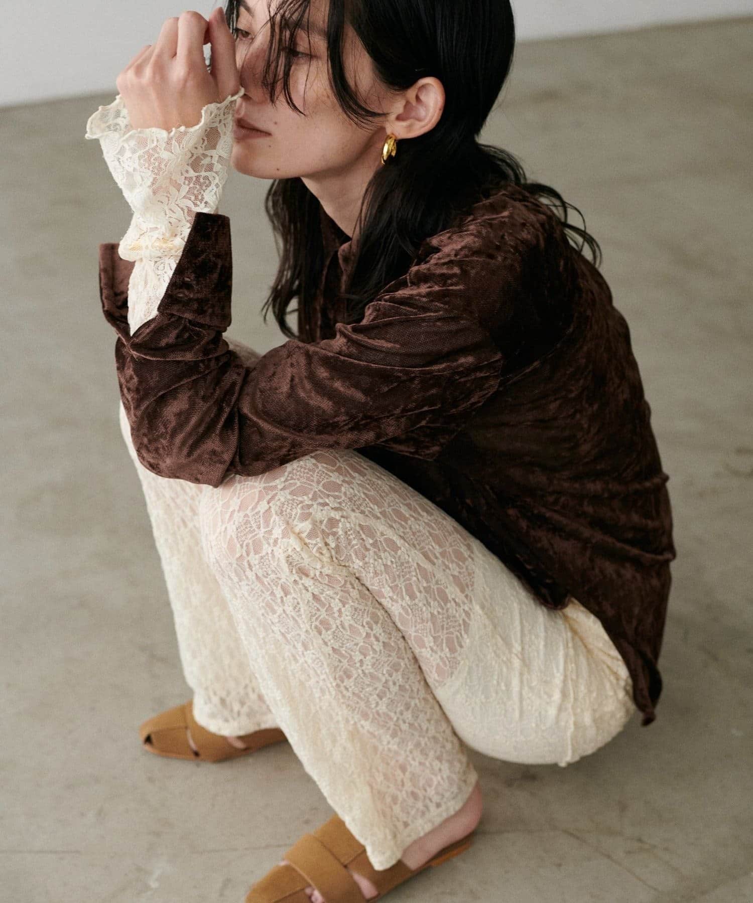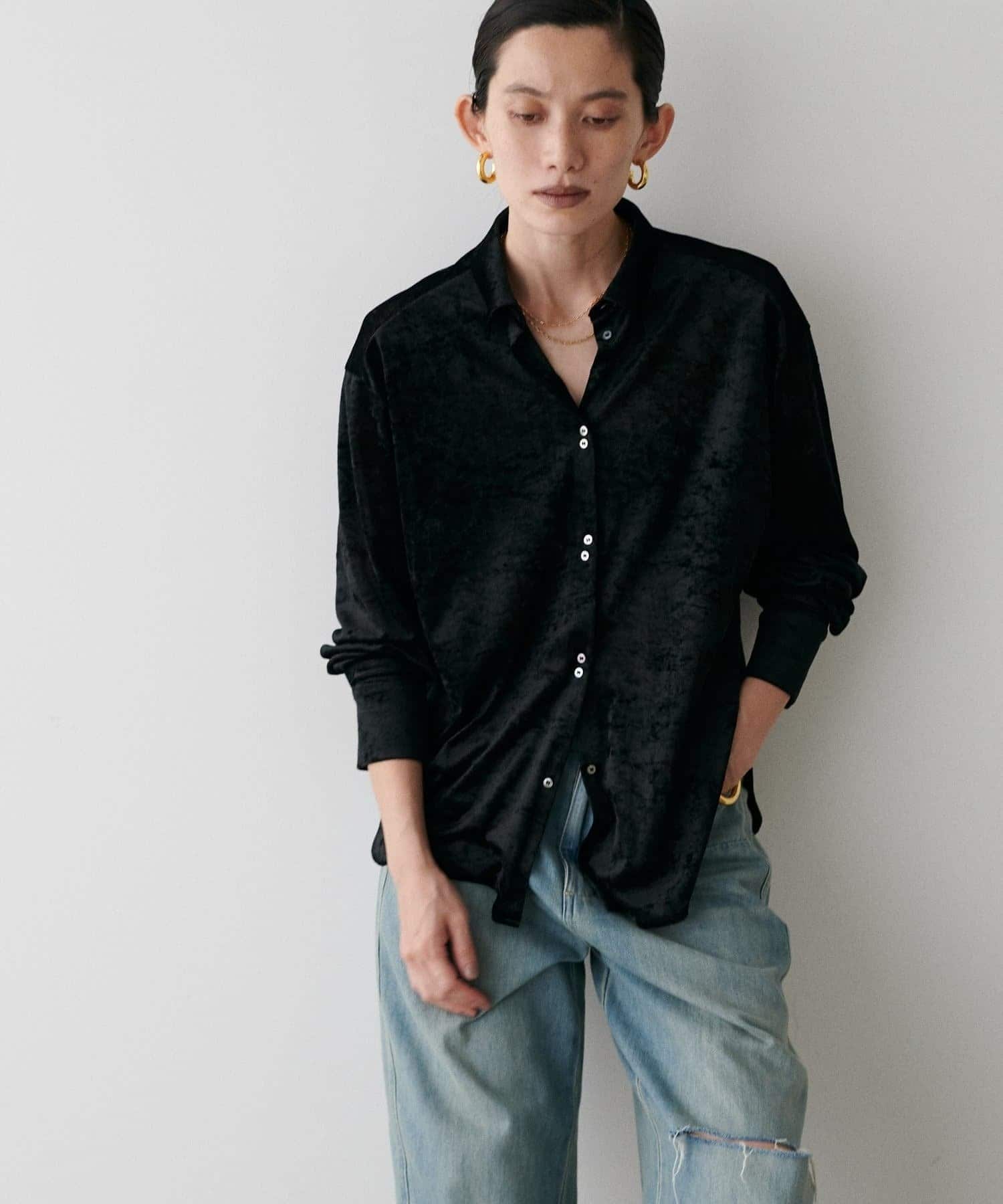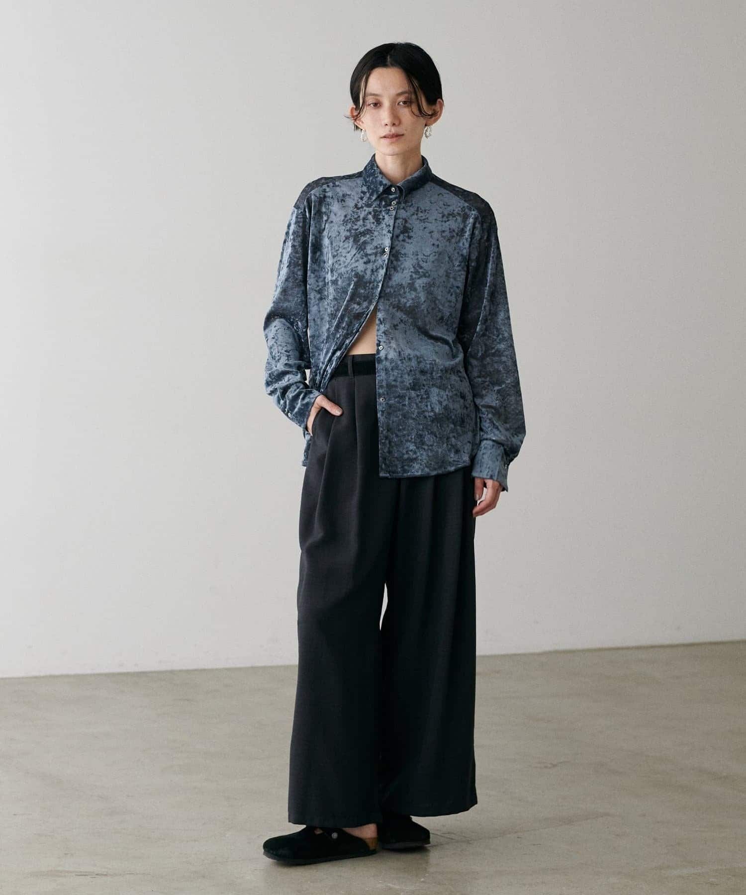 繊細な透け感が魅力のシアーメッシュ素材に、上品な光沢をまとわせたベロア調シャツ。