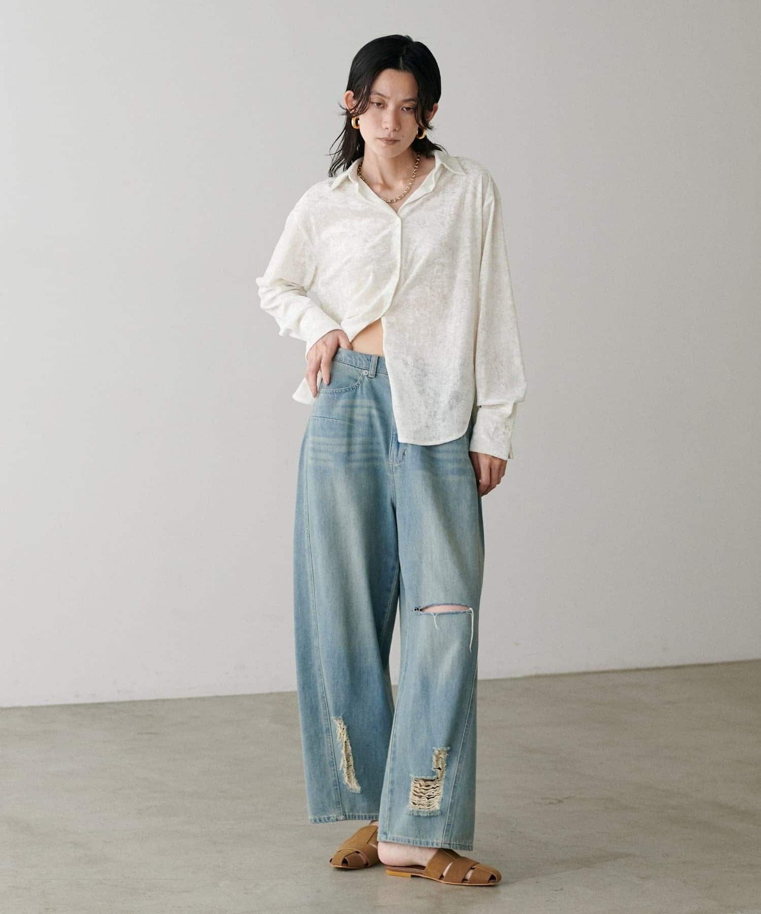 キャミソールやタンクトップの上からさらっと羽織って、素材感を主役にしたスタイルに。