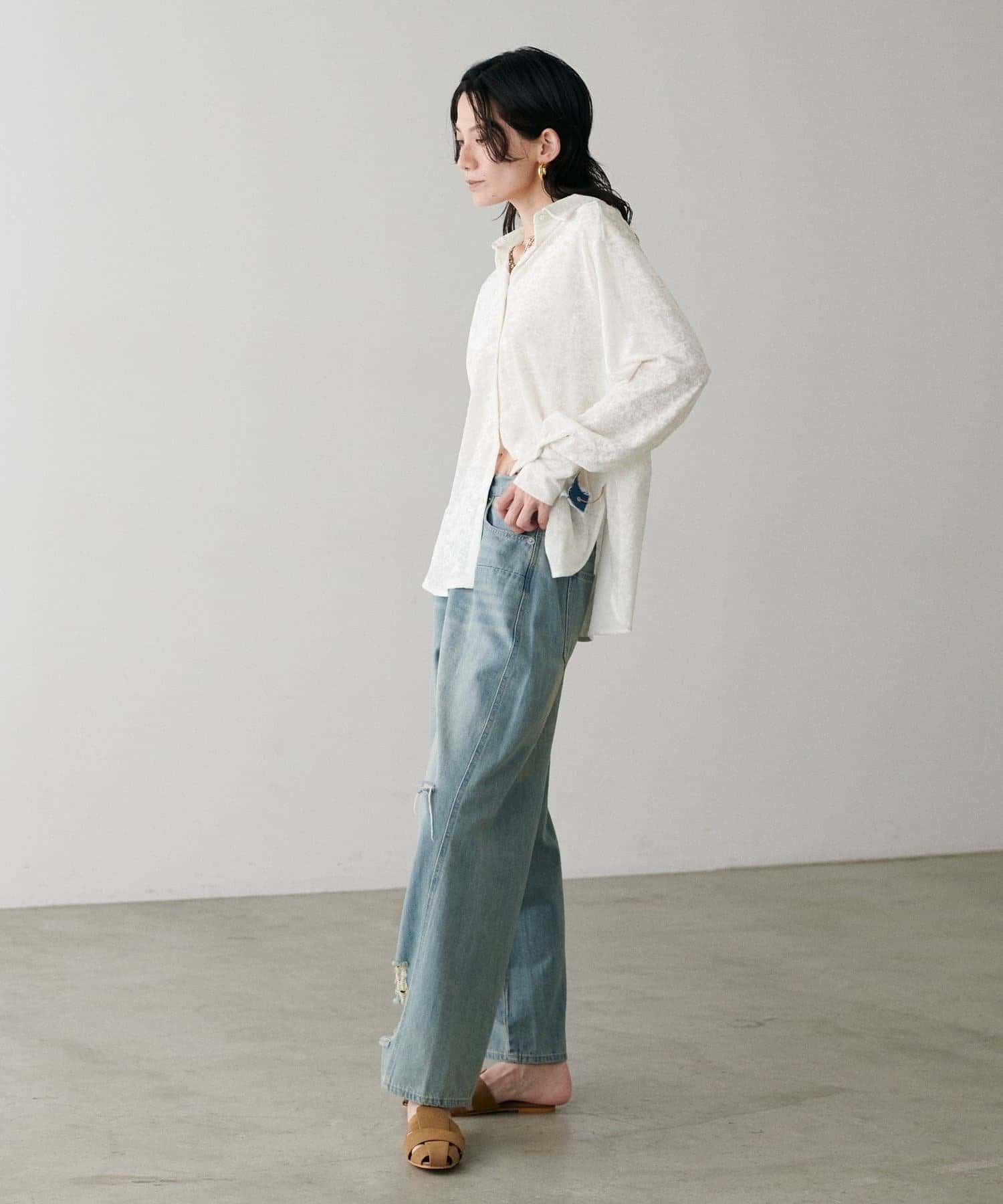 ややゆとりのあるシルエットと、シャツカラーのきちんと感が絶妙なバランスを保ち、