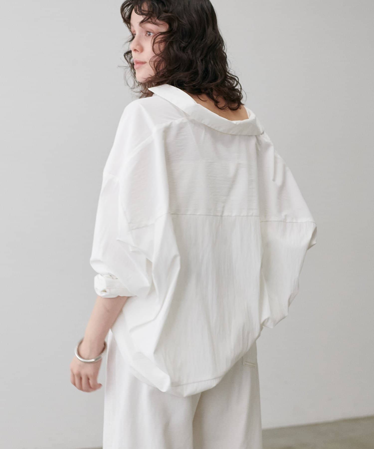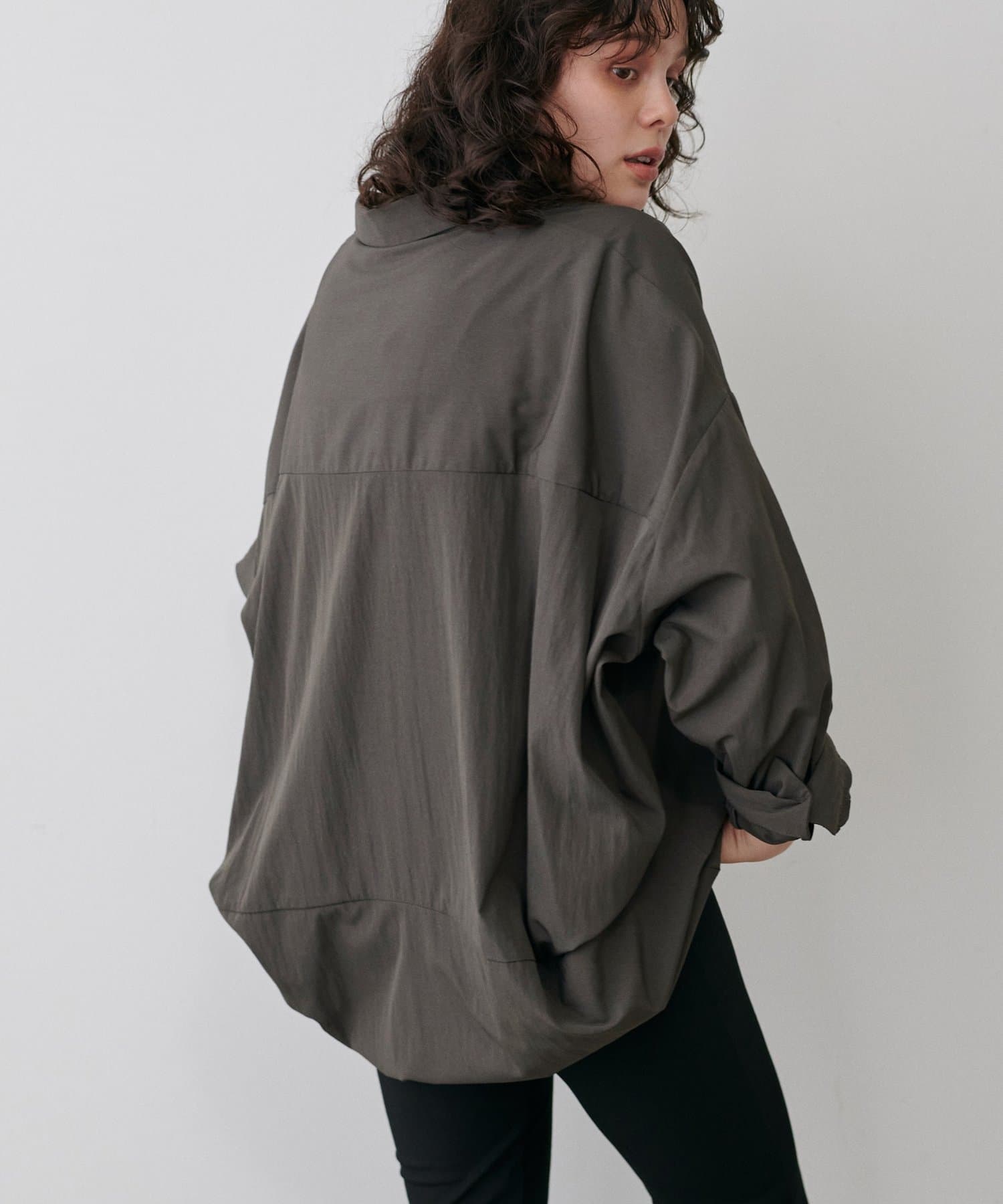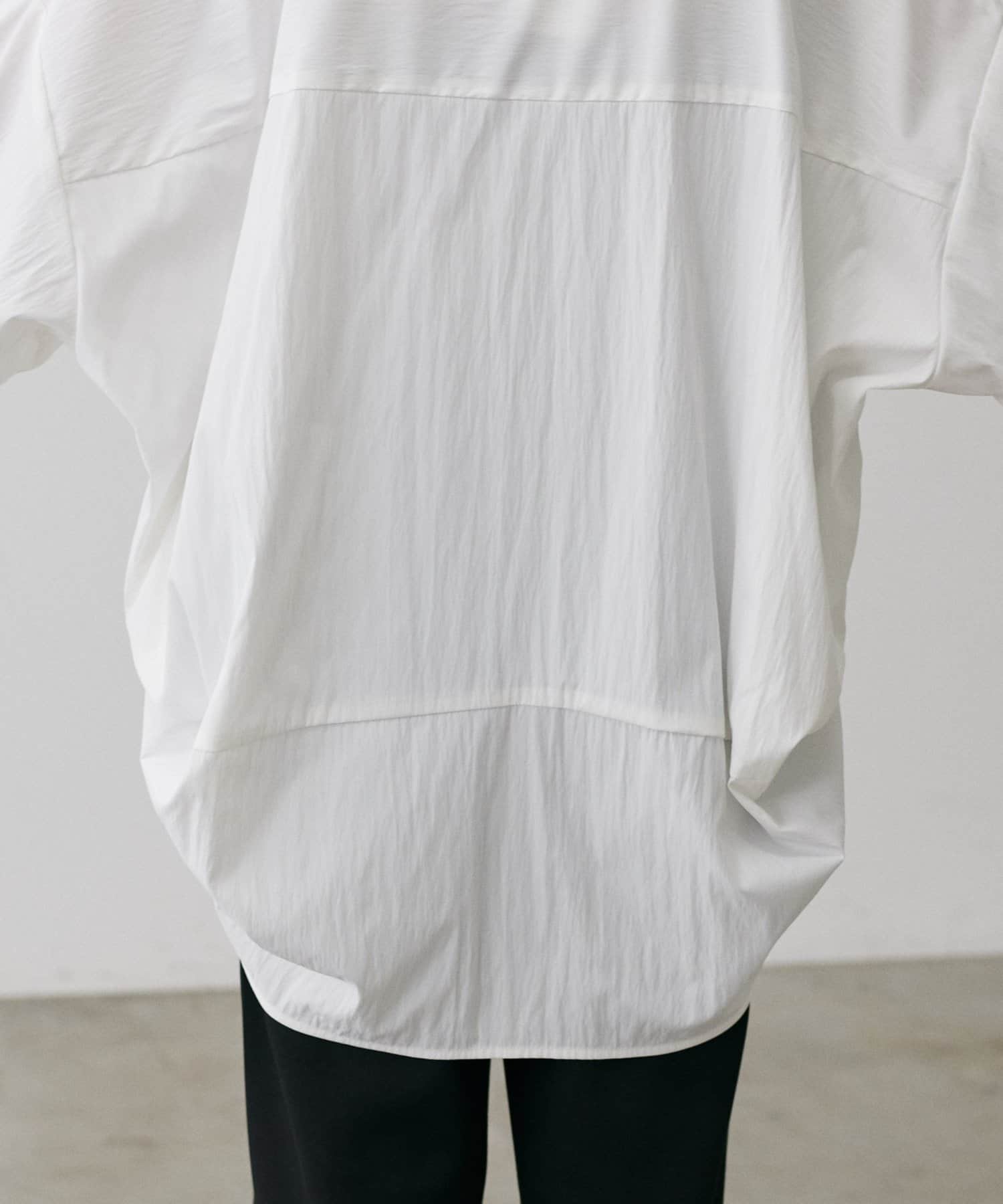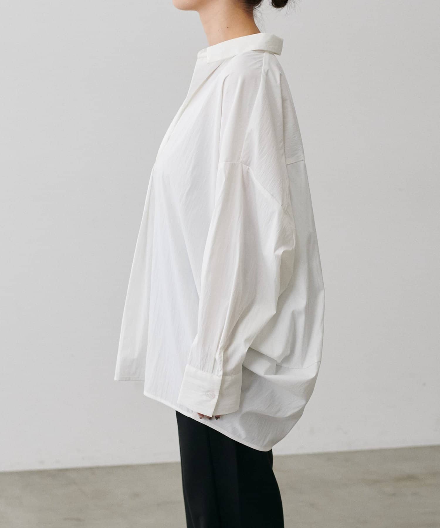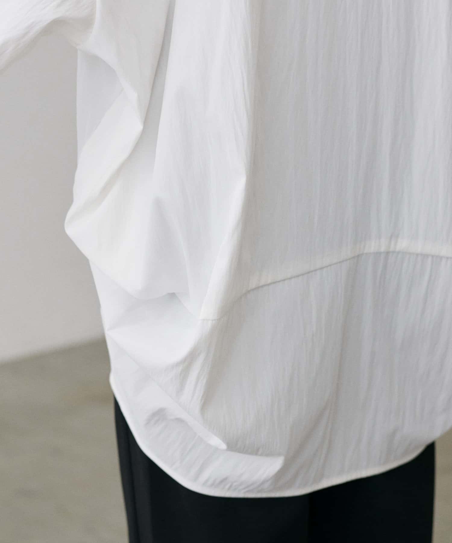ゆったりとしたオーバーサイズで、脇線後ろのタックにより立体的なコクーンシルエットに。