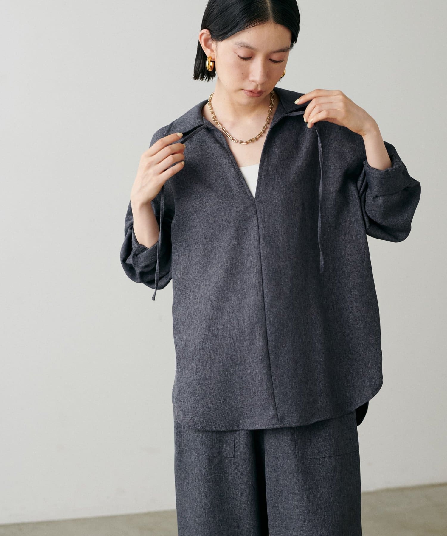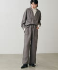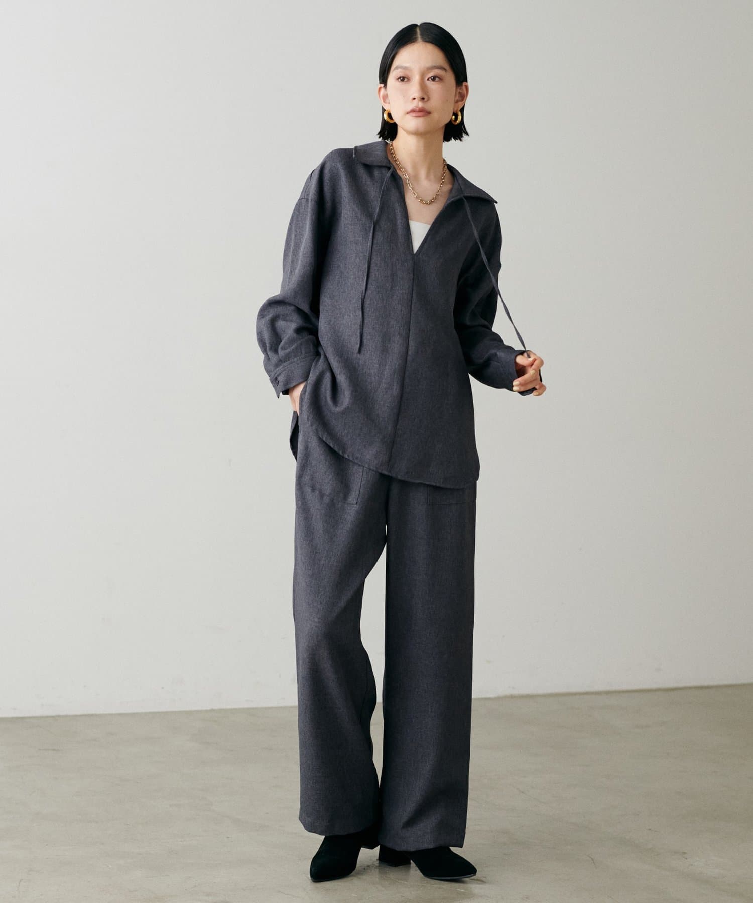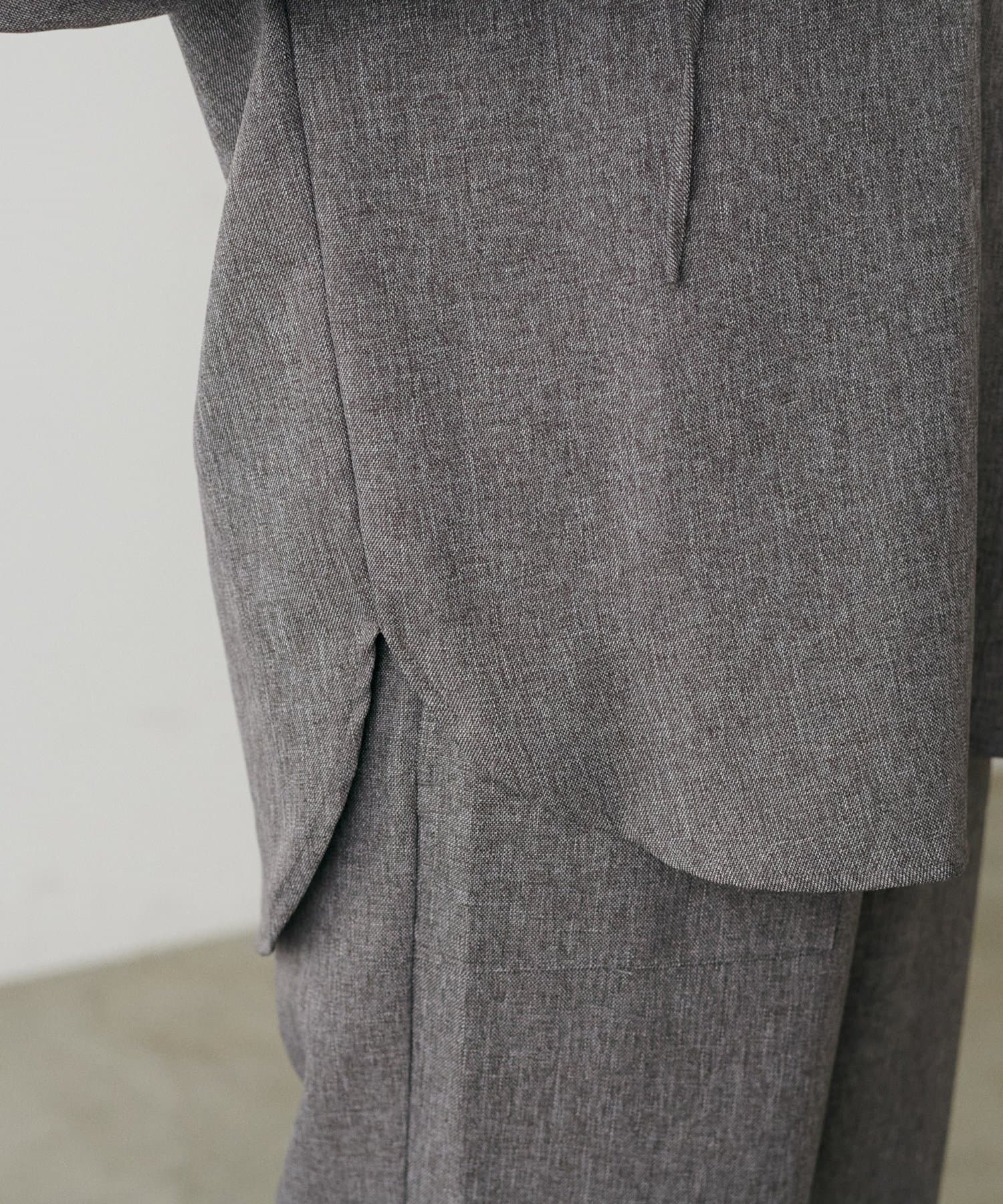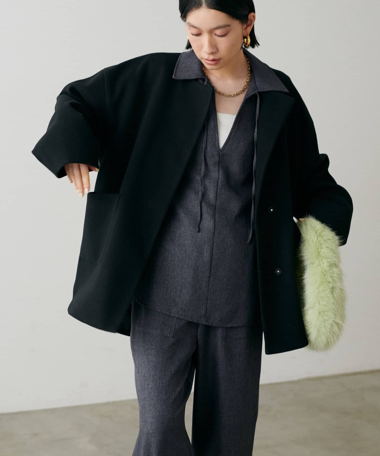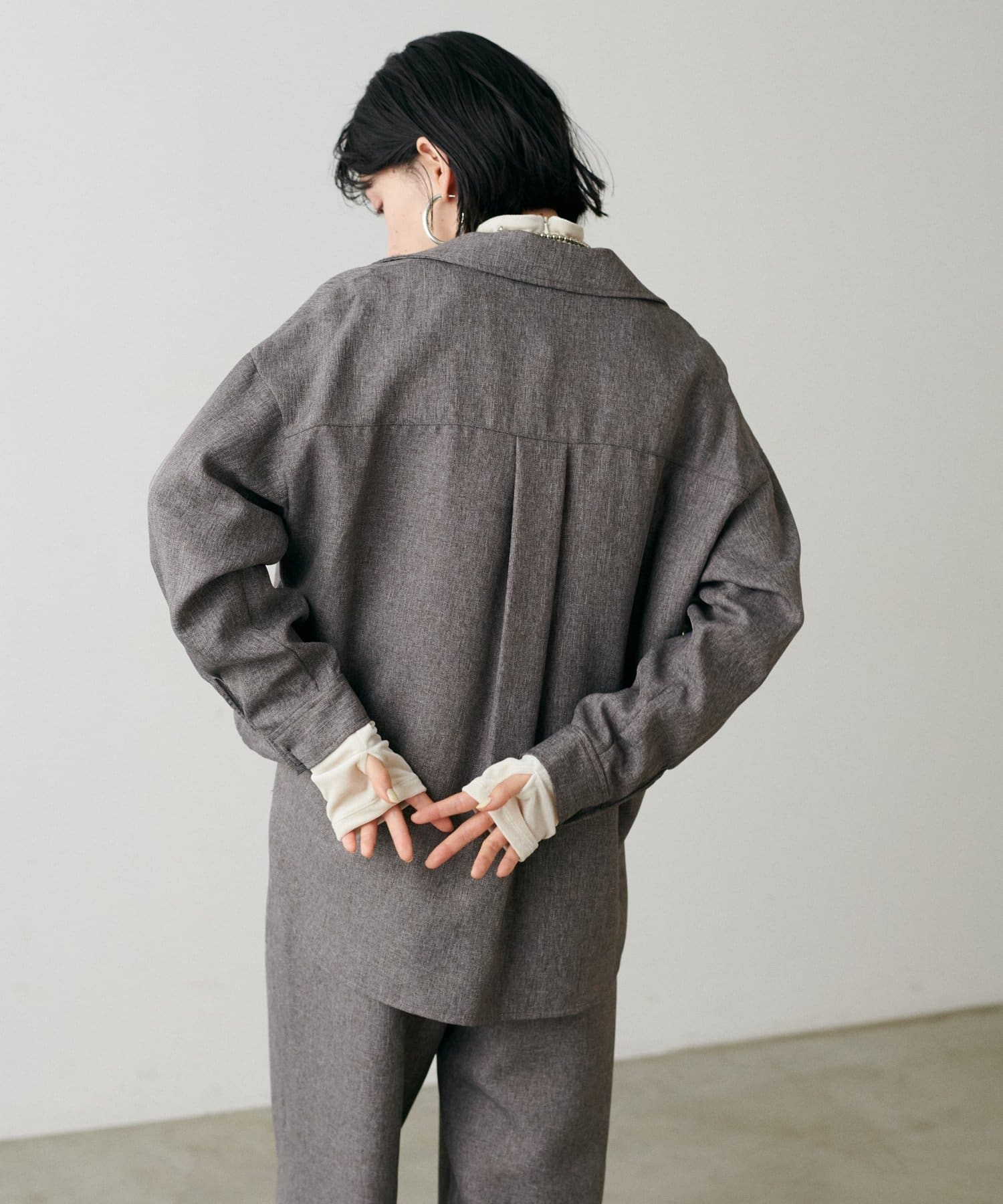 すっきりと開いた襟元が抜け感を演出し、マニッシュながらも女性らしい印象に仕上げています。
