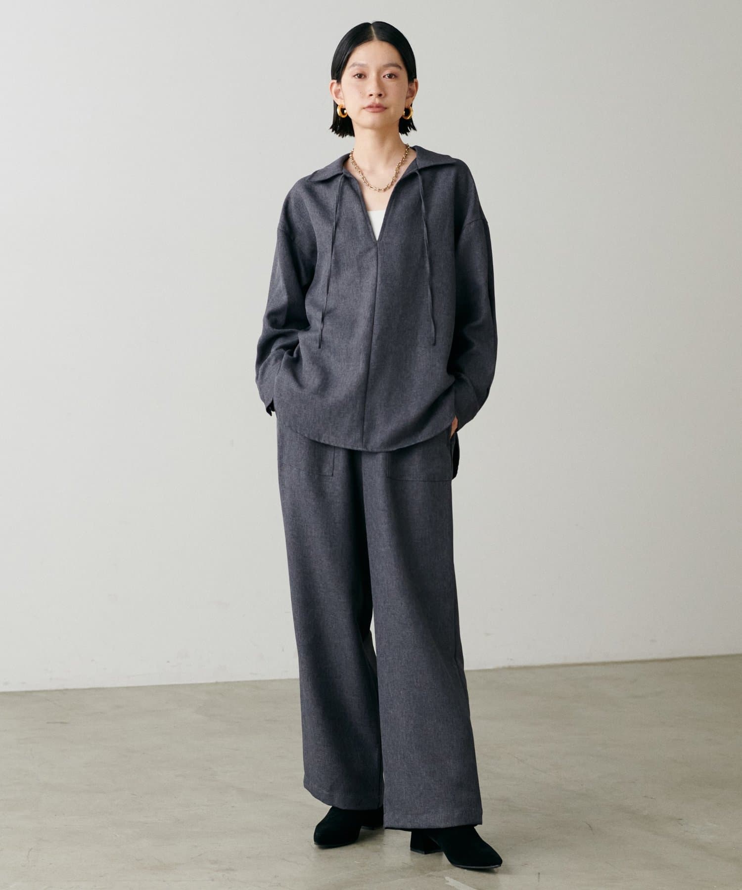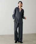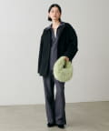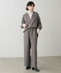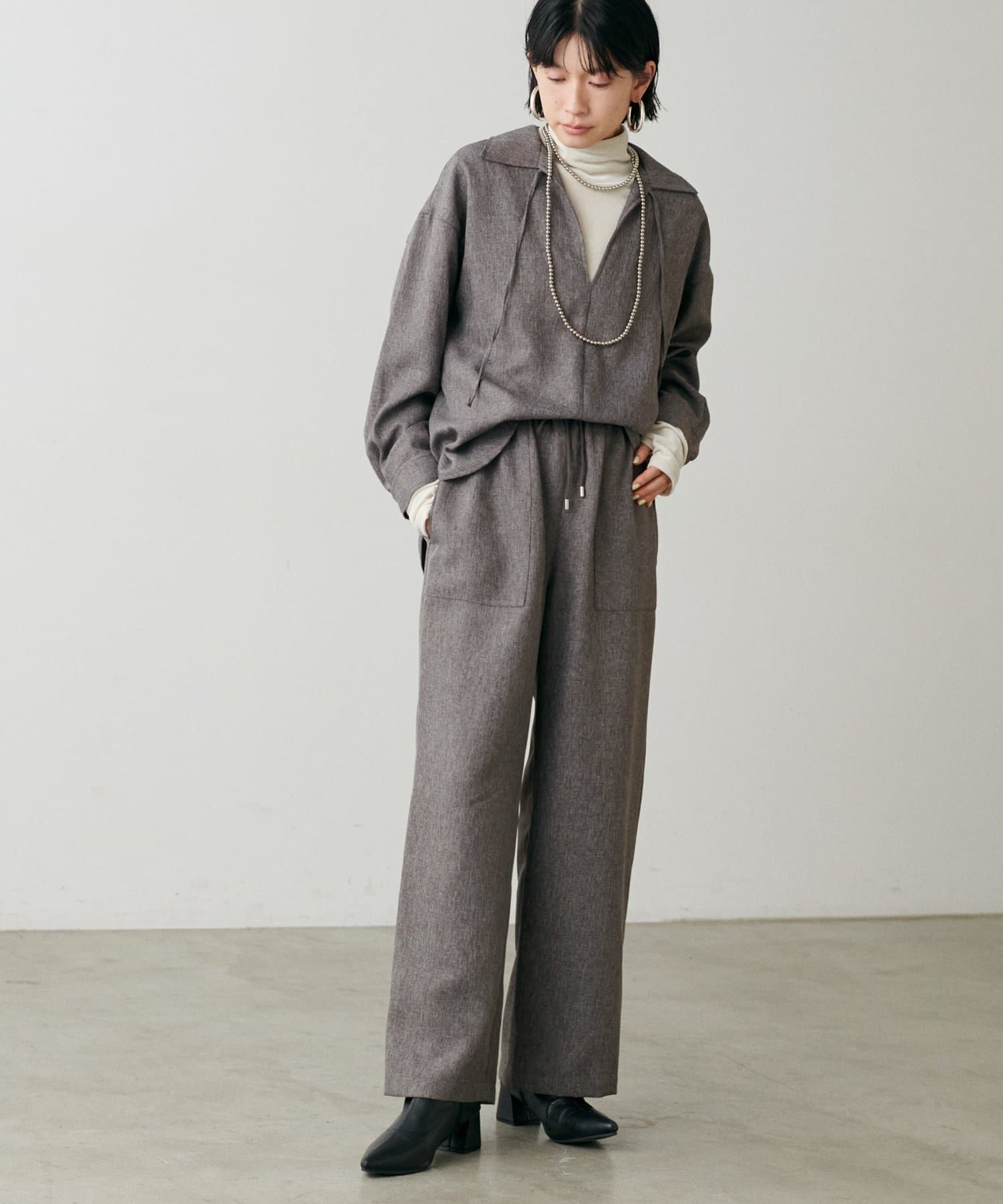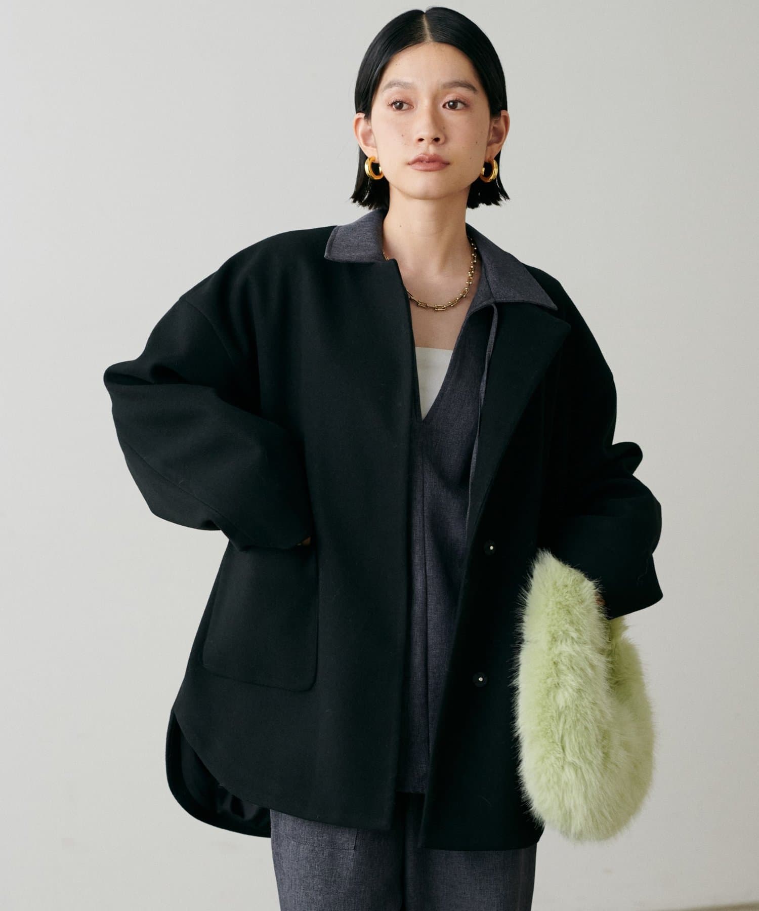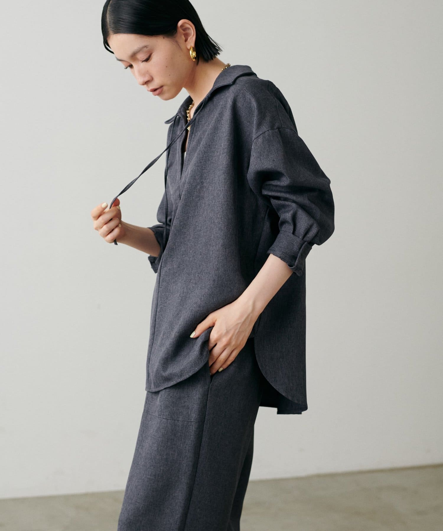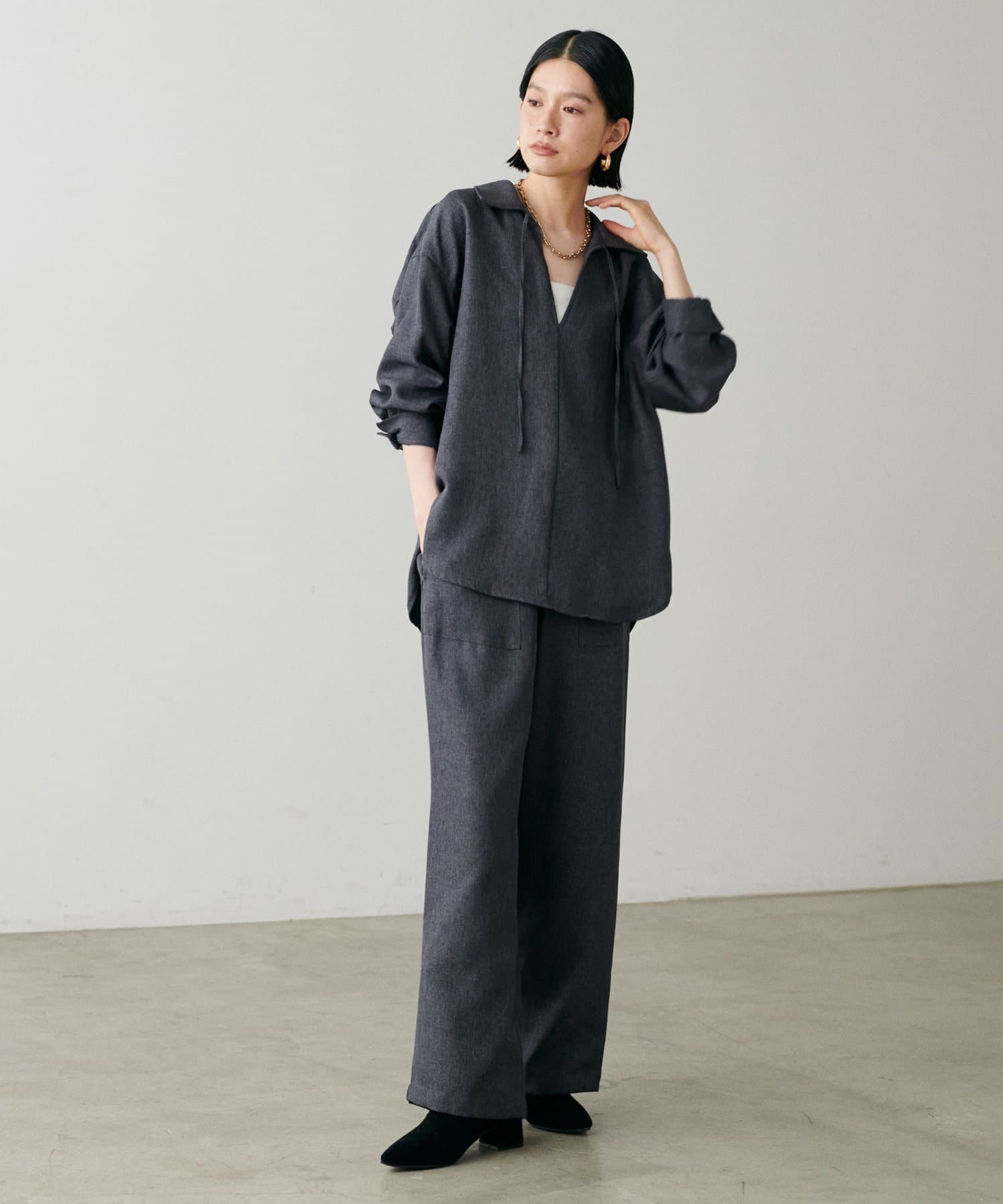 すっきりと開いた襟元が抜け感を演出し、マニッシュながらも女性らしい印象に仕上げています。