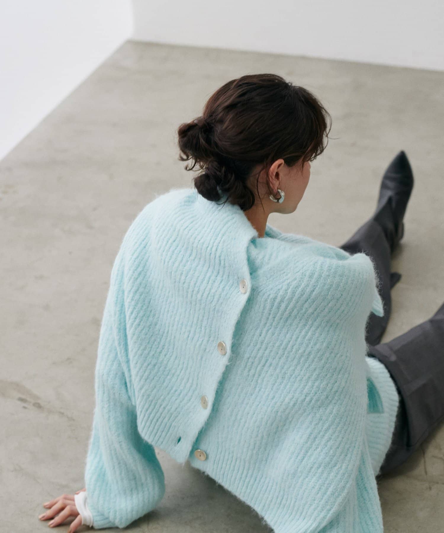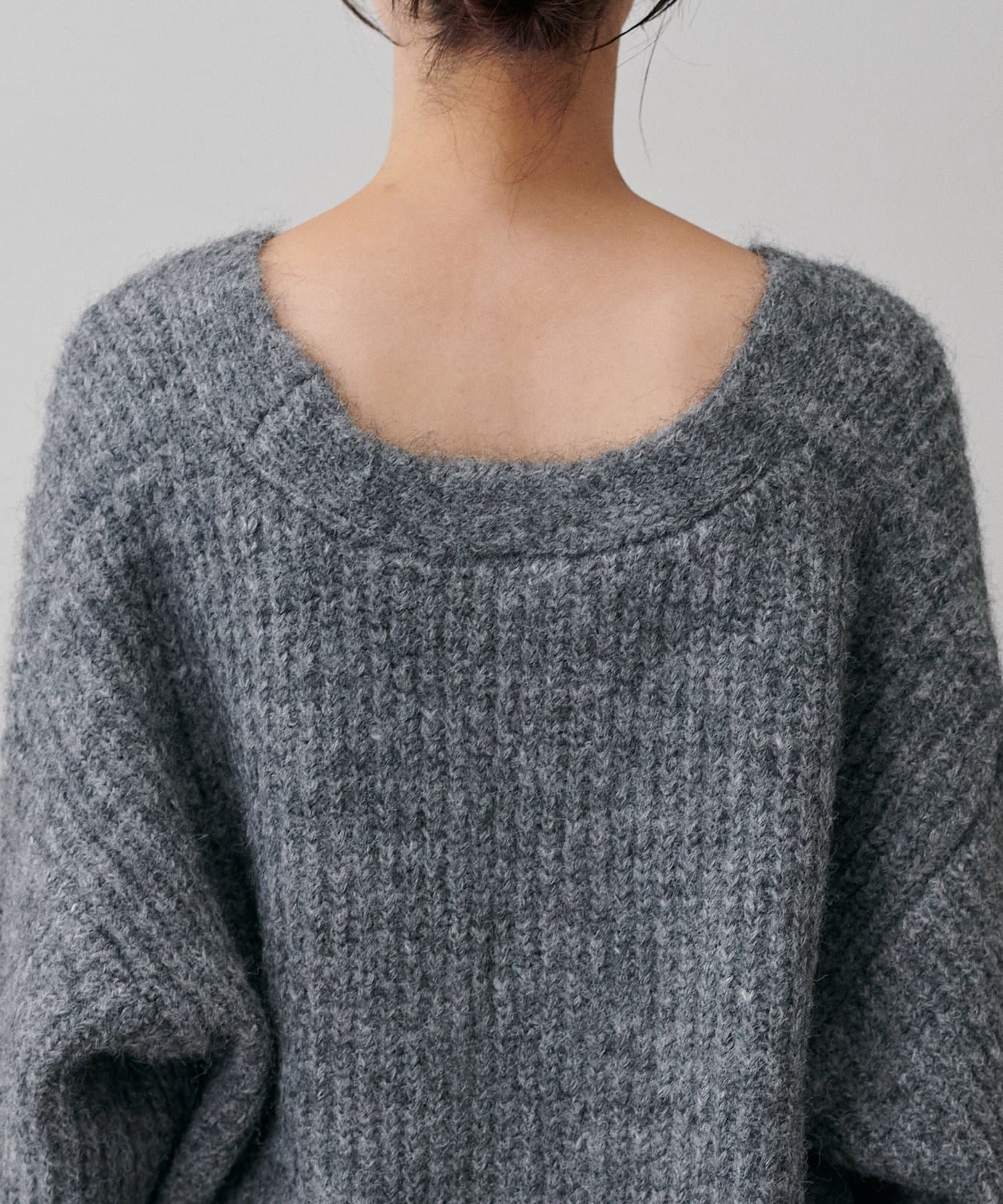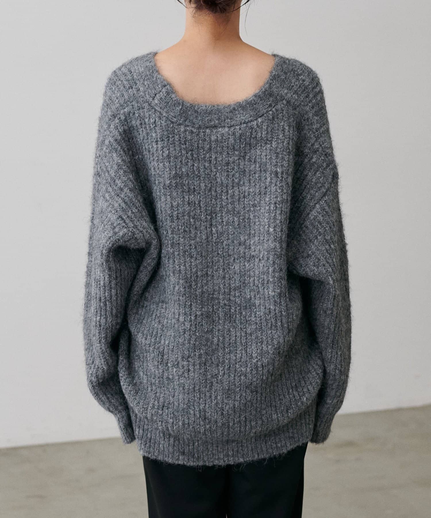 生地感:ふわふわでボリューミーなトレンドのシャギーニット素材。