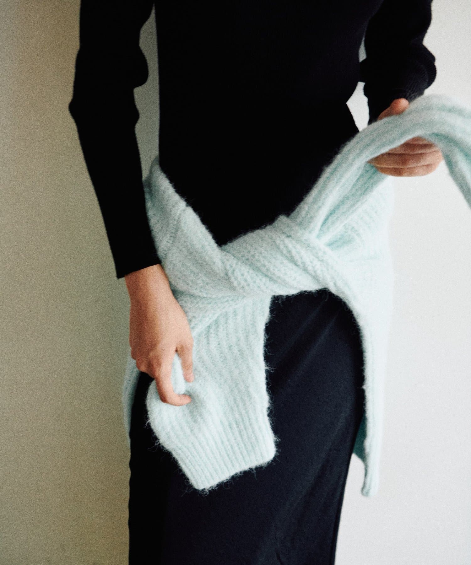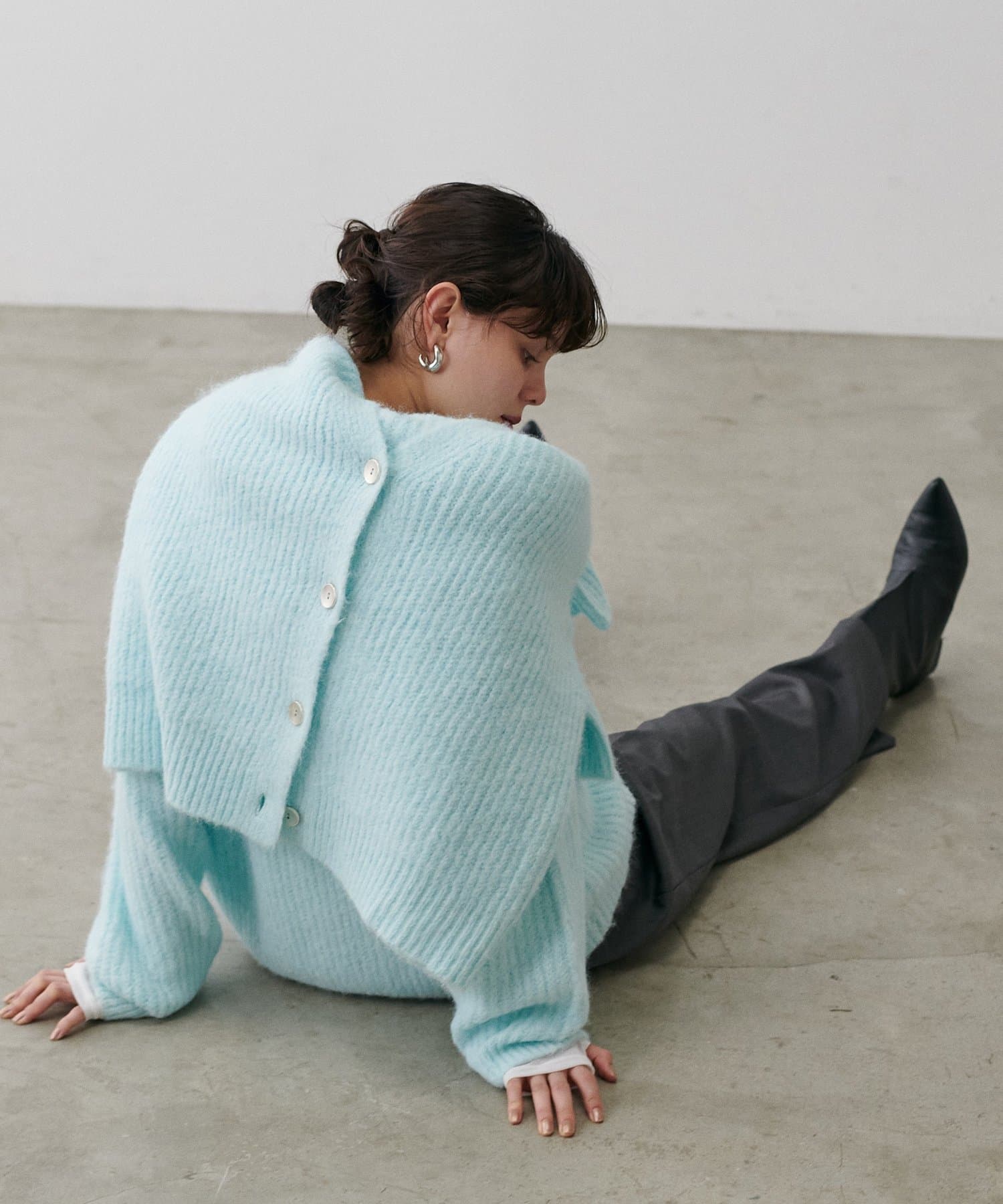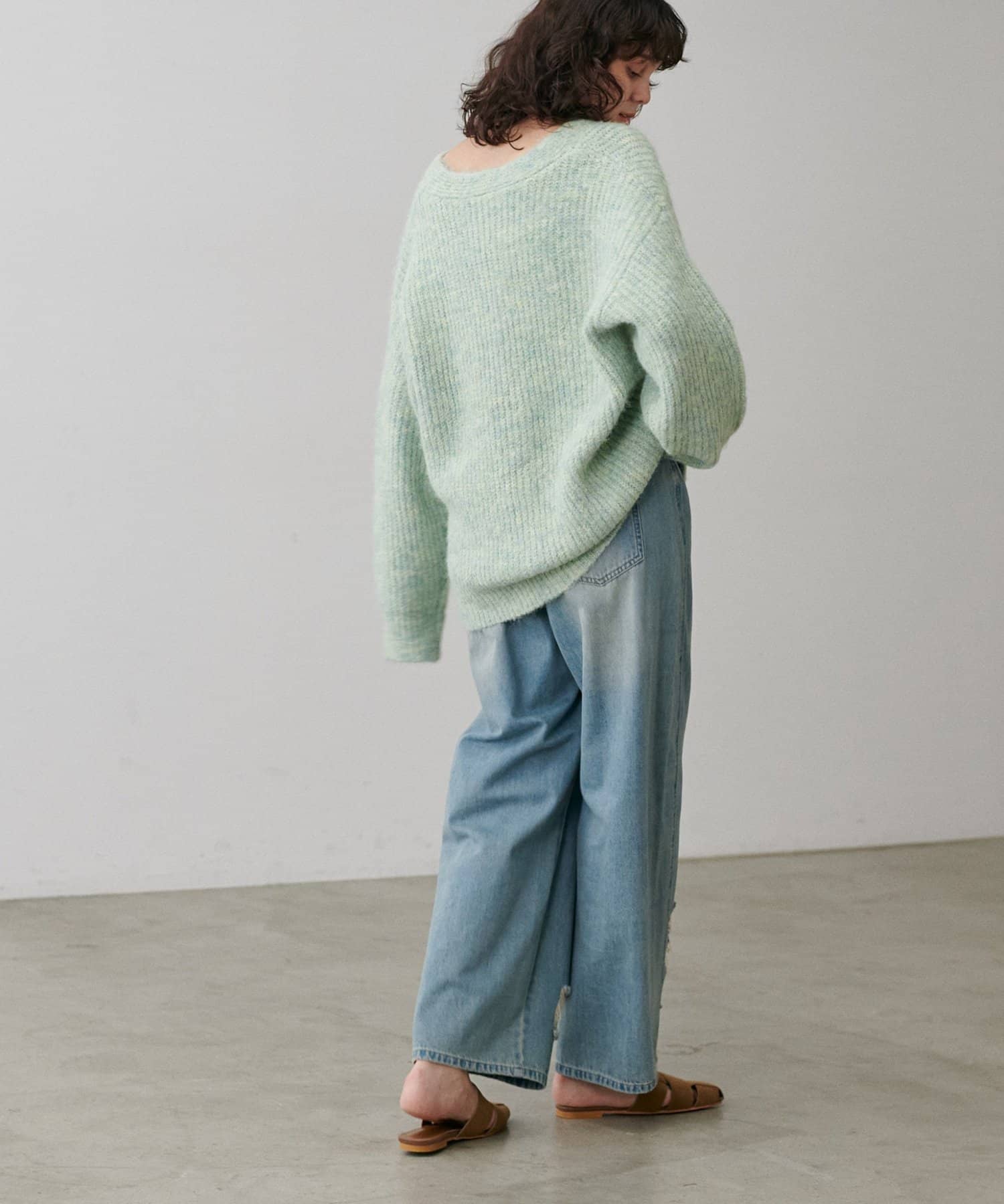 生地感:ふわふわでボリューミーなトレンドのシャギーニット素材。