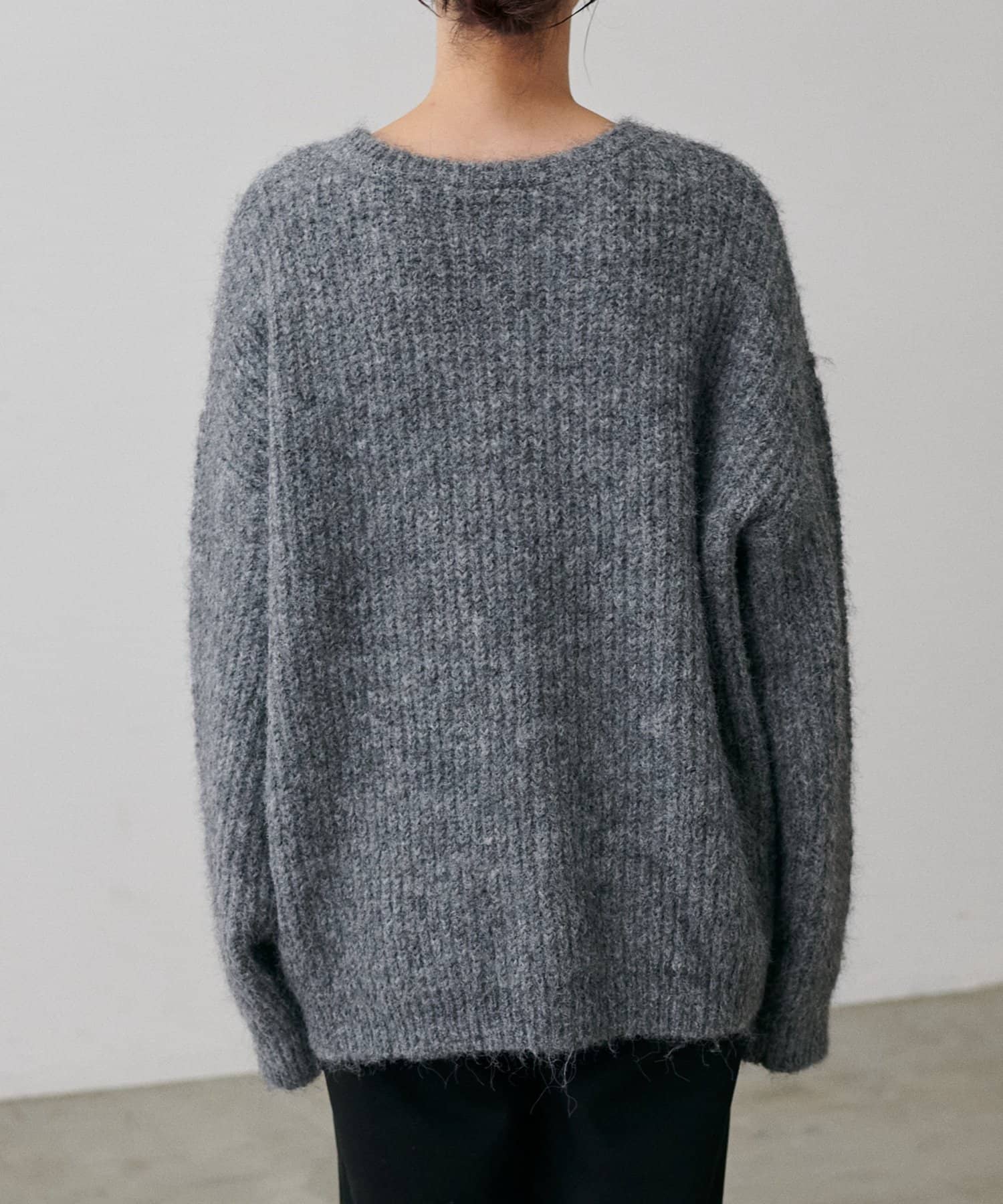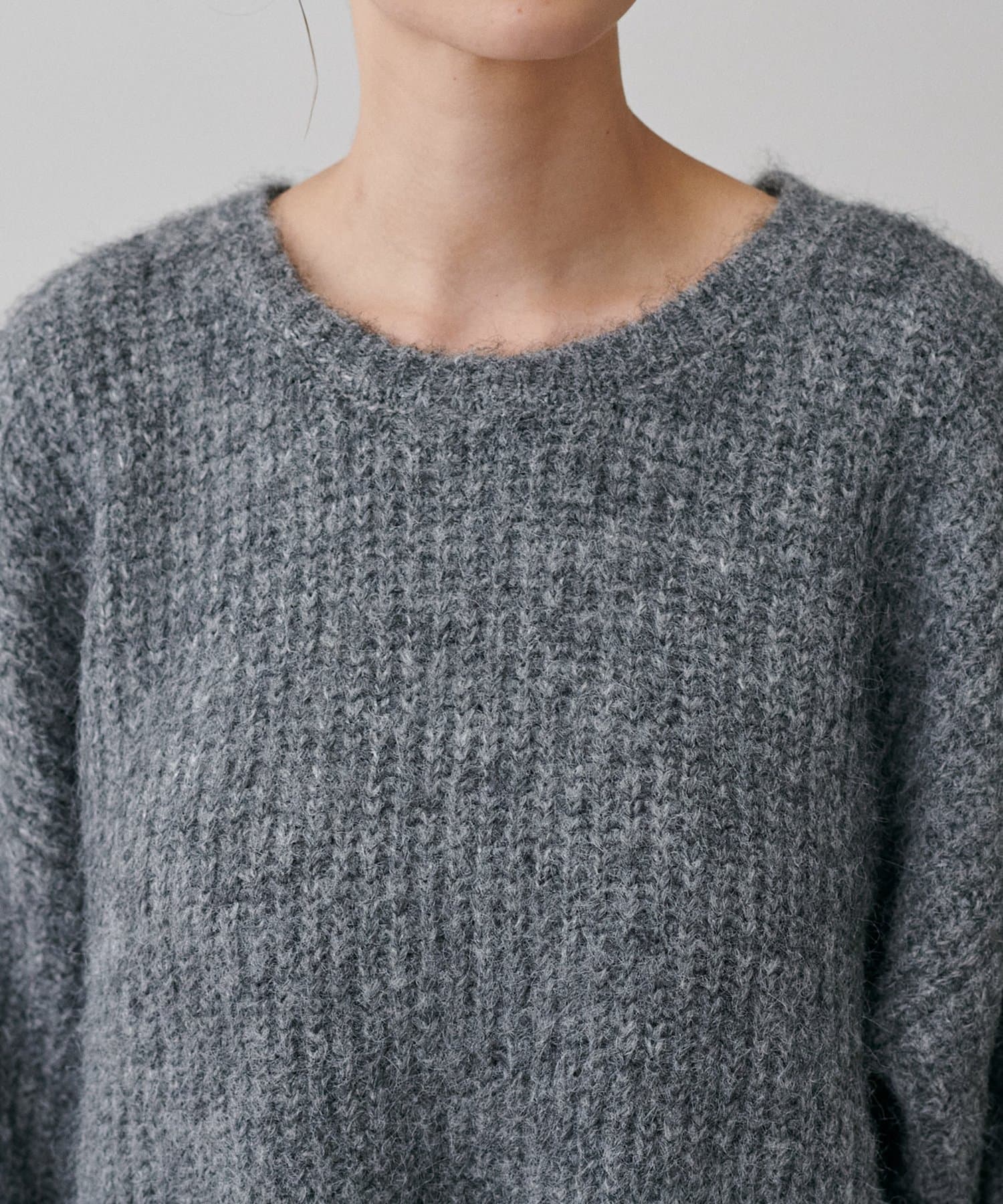 柔らかな質感のふわふわ毛足を楽しめるシャギー素材を使用したニット。