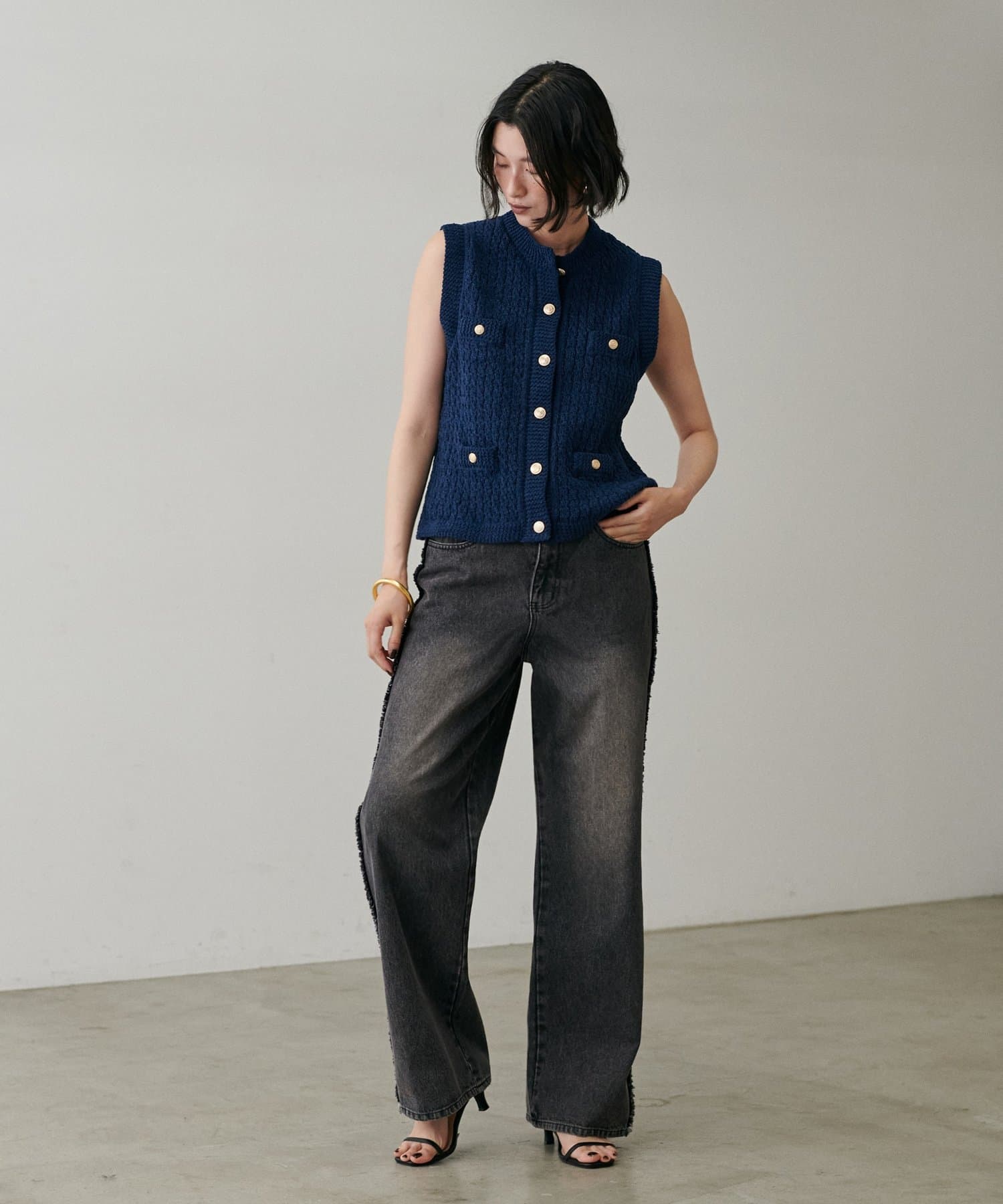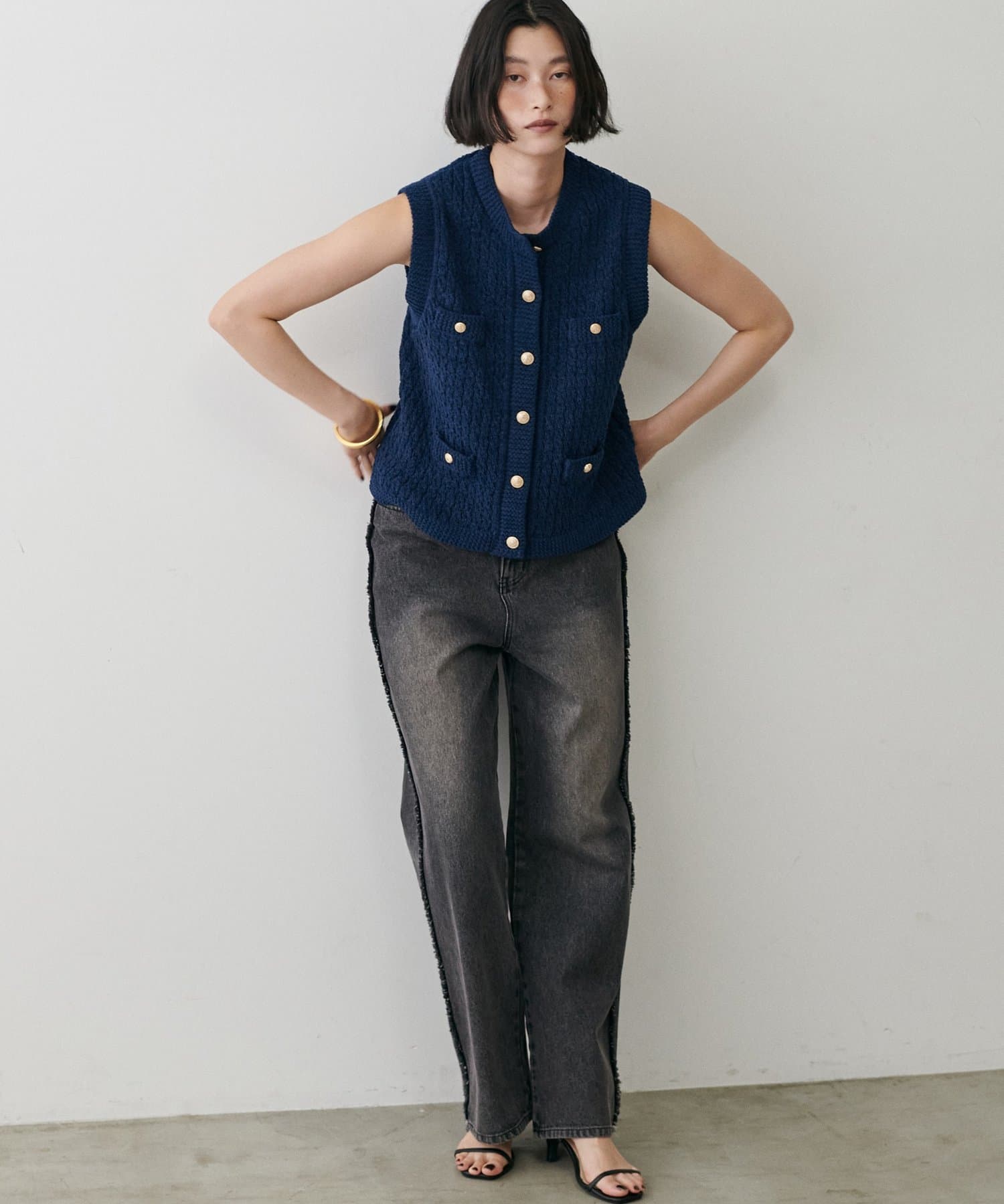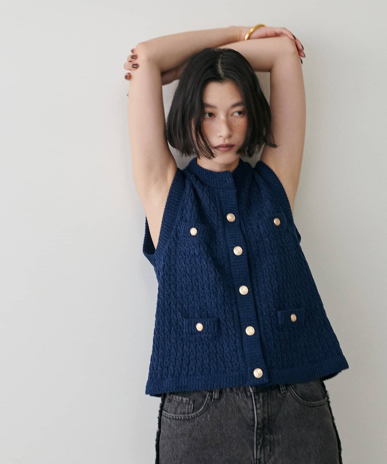 金ボタンが上品なアクセントとなり、シンプルなシルエットながらも華やかさをプラスしています。