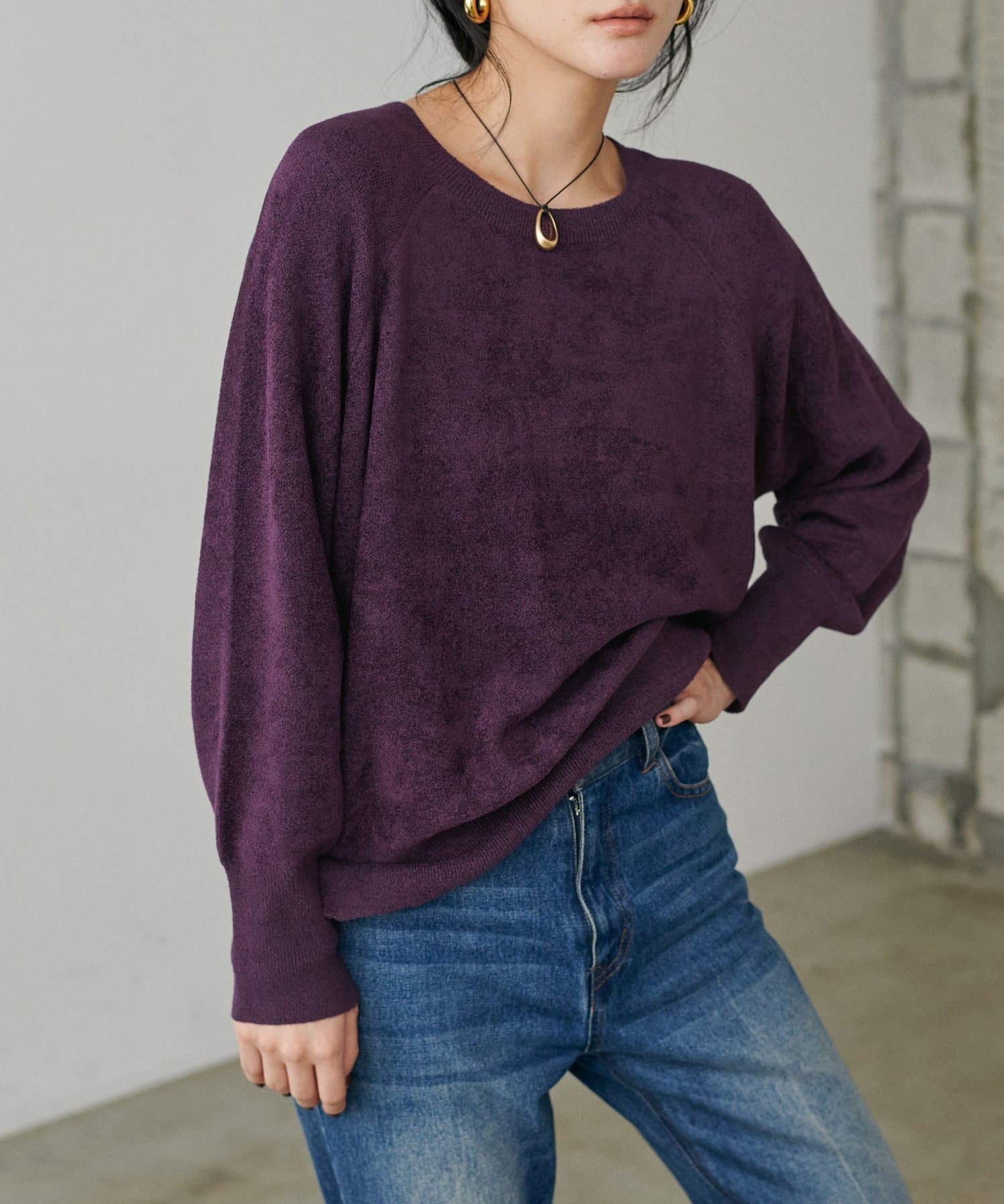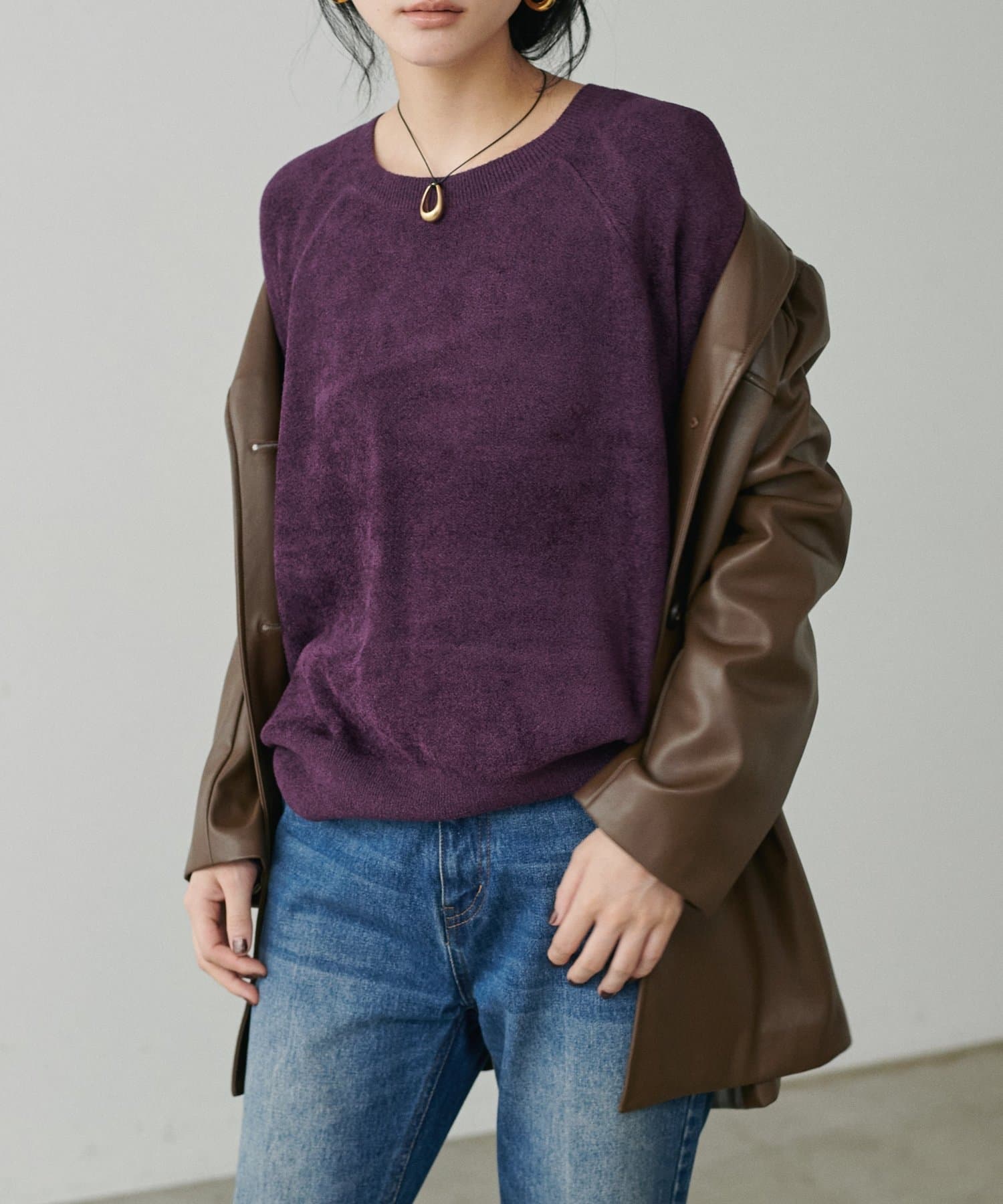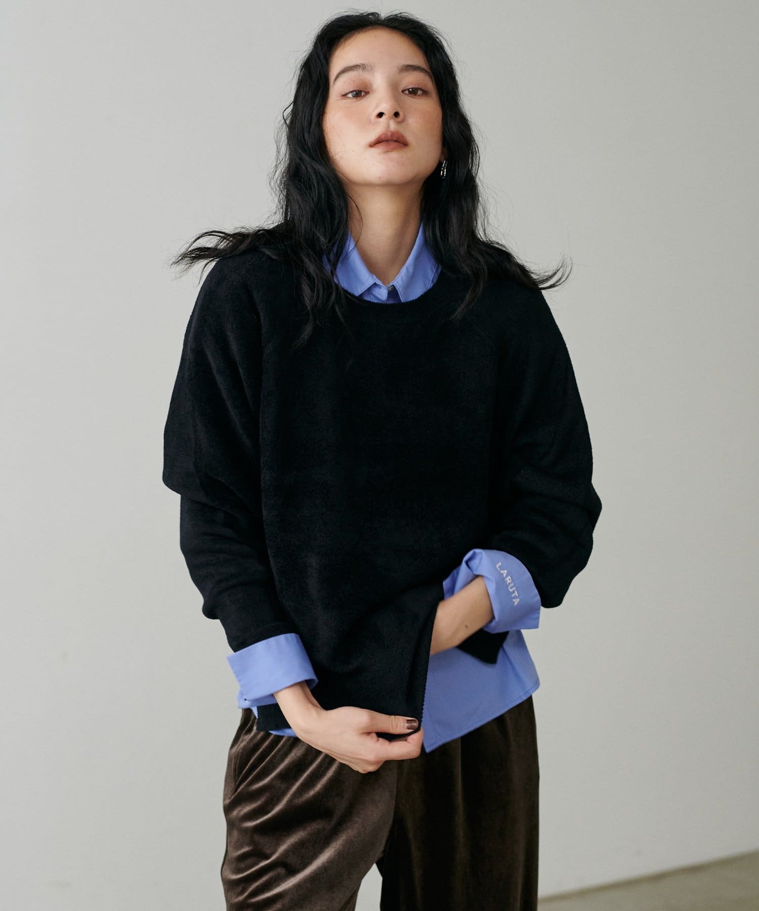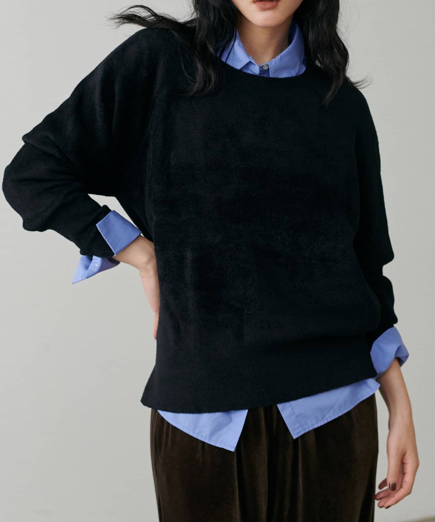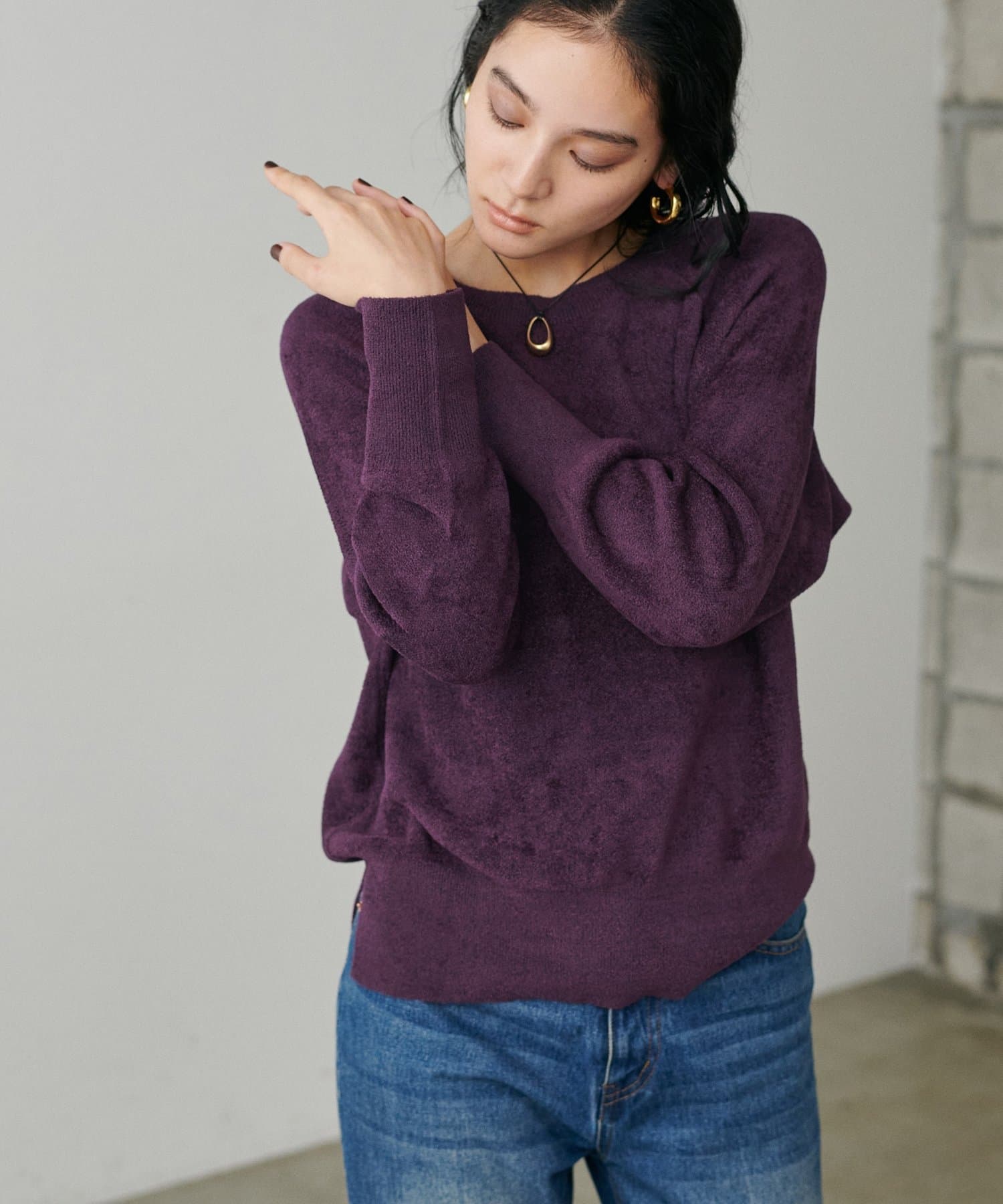 毛足の短いフェザー糸を使用し、もっちりとしたタッチで肌あたりが良く、思わず触れたくなるような滑らかな着心地です。