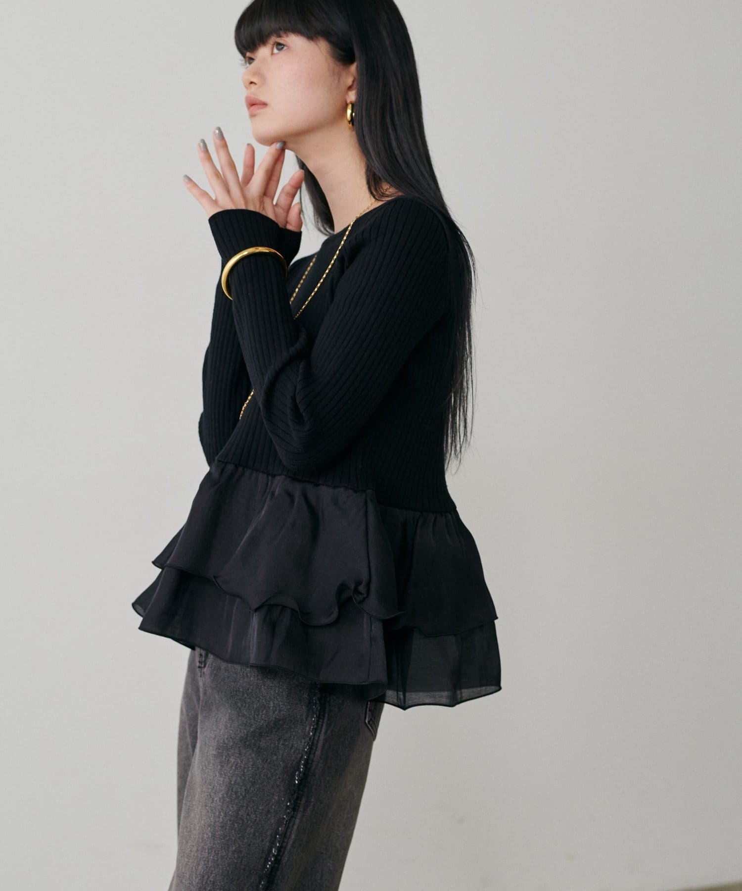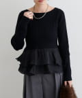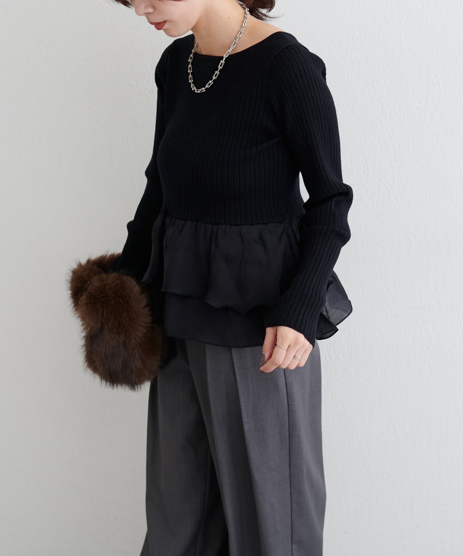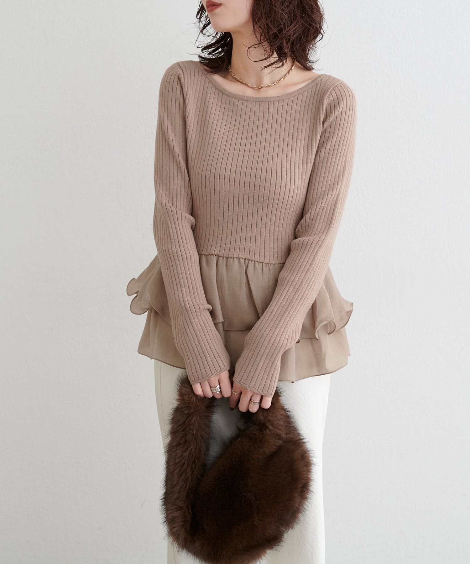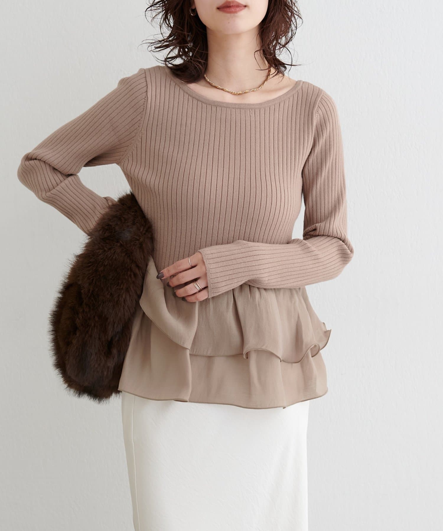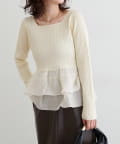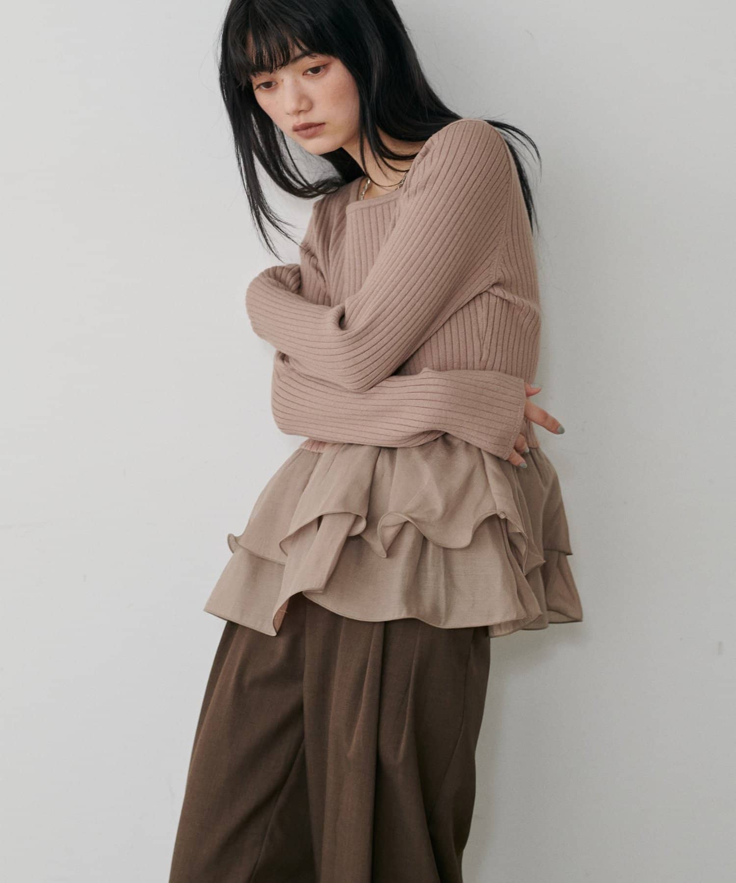 1枚でレイヤードスタイルが叶う、大人も着られるペプラムニット。