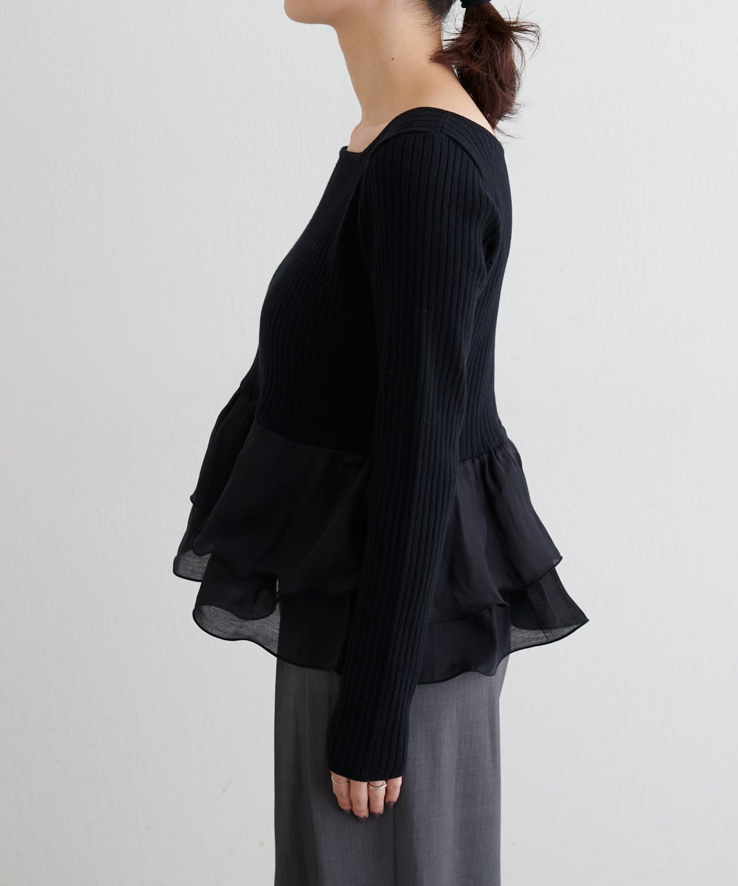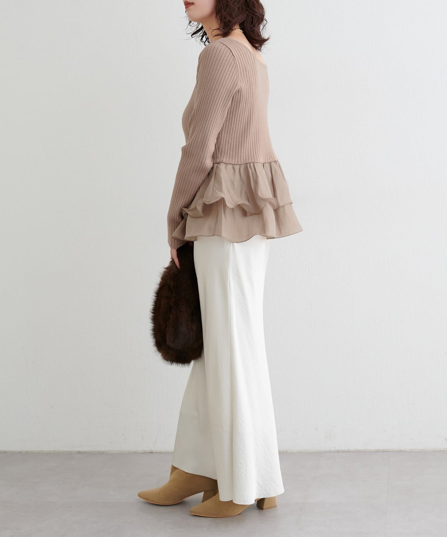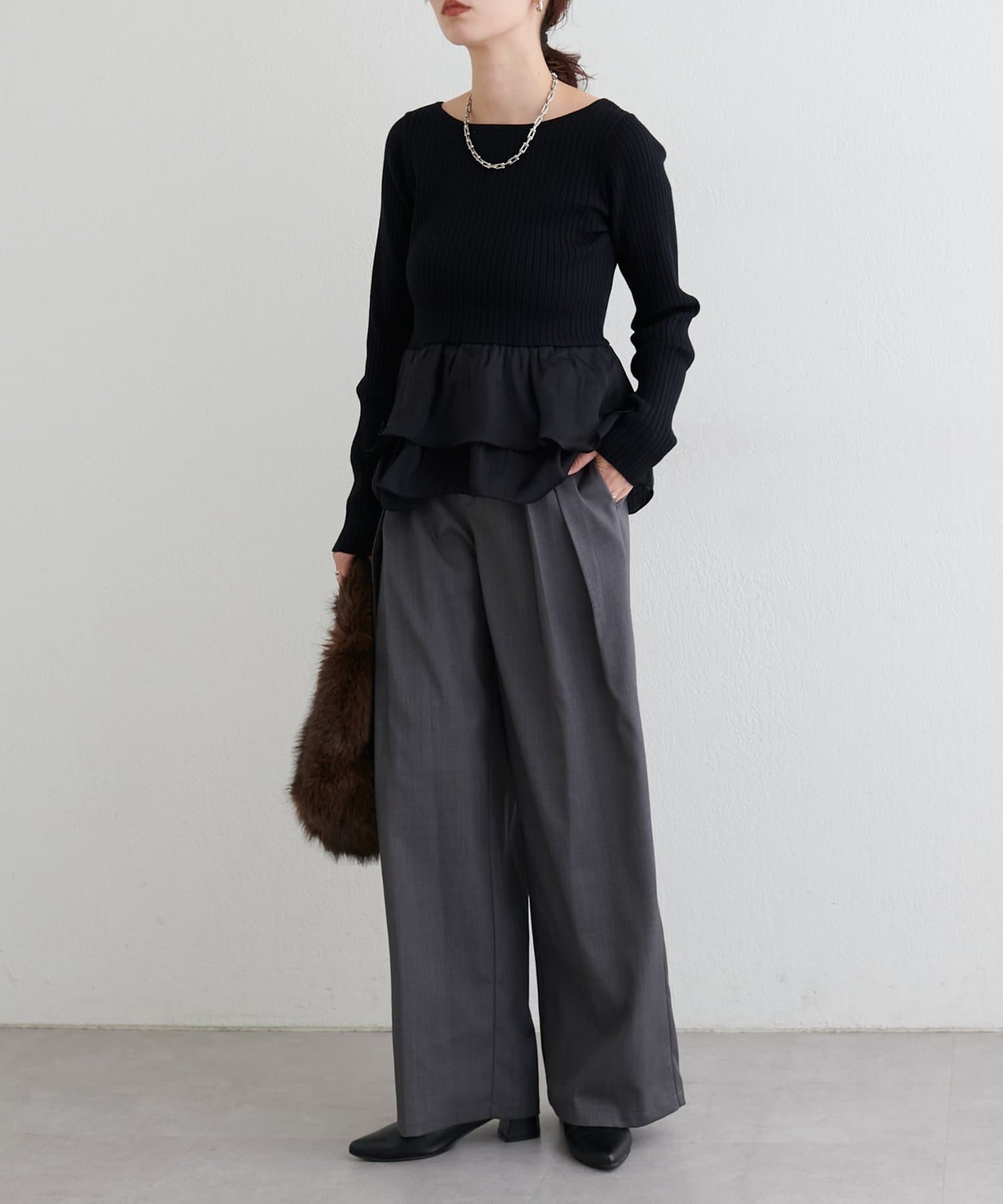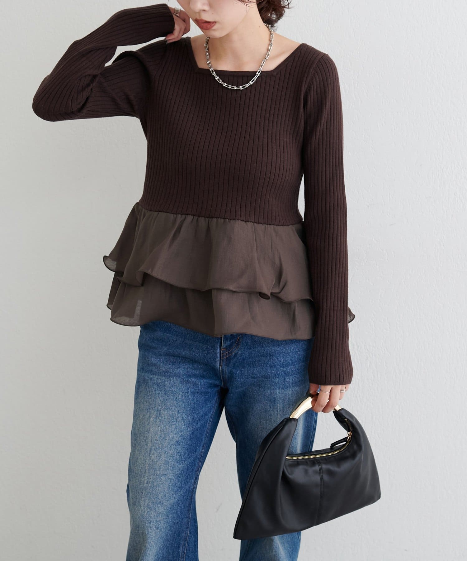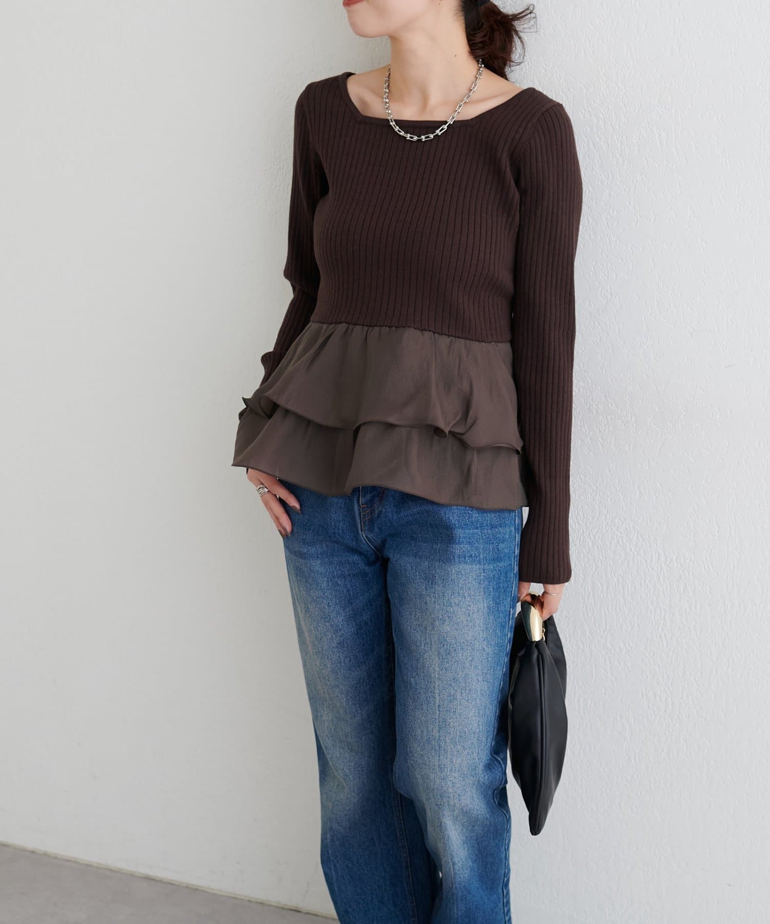 1枚でレイヤードスタイルが叶う、大人も着られるペプラムニット。
