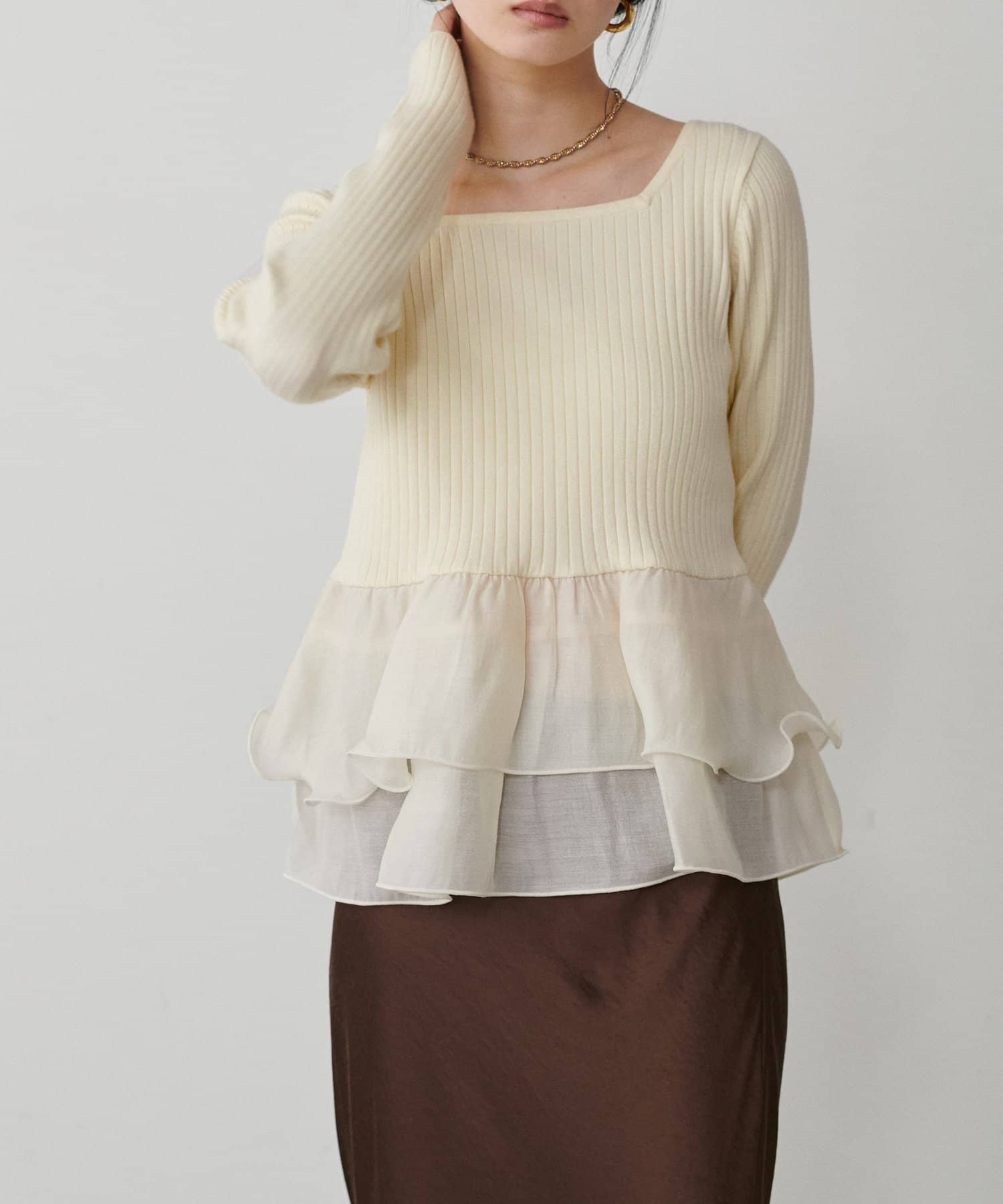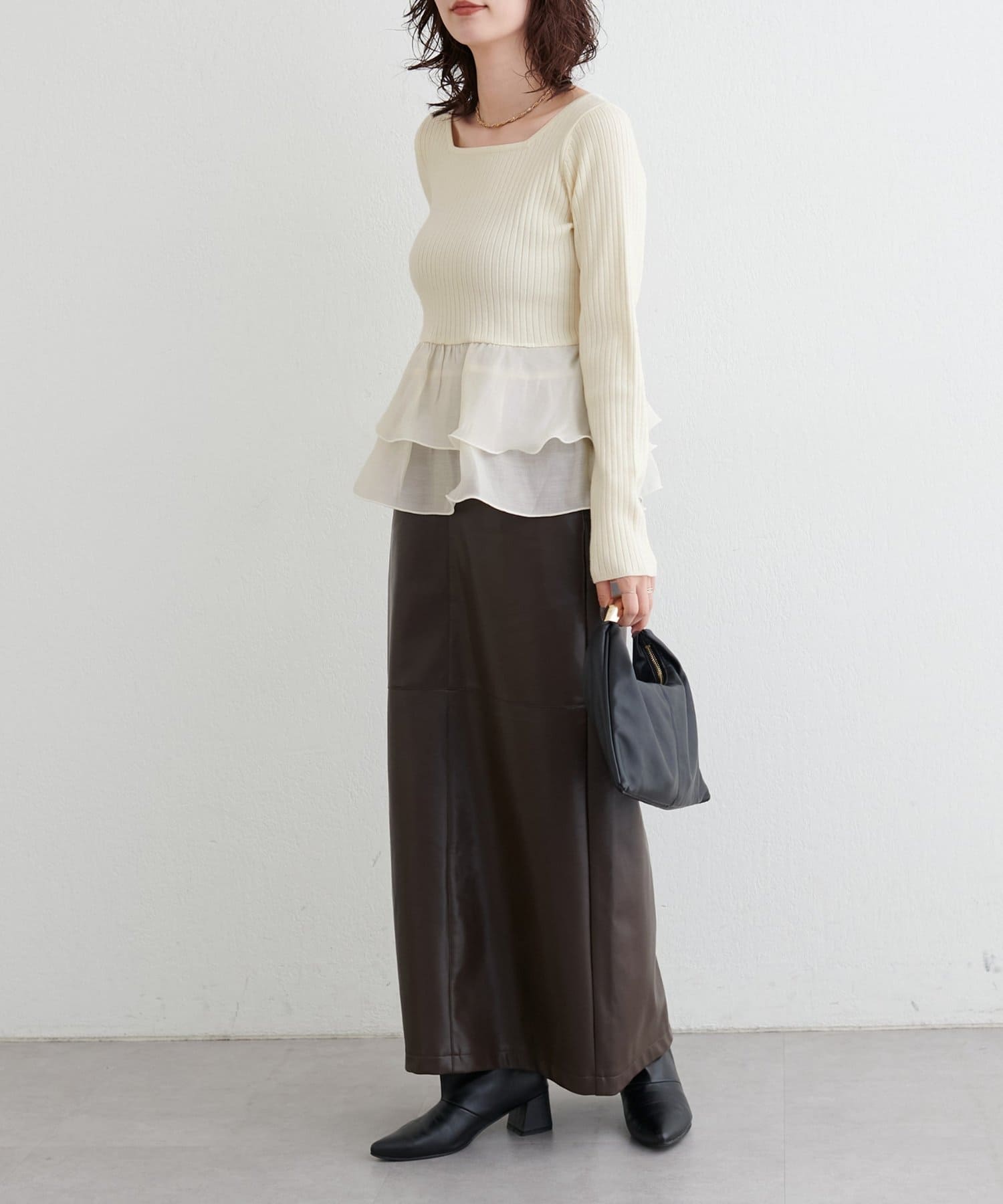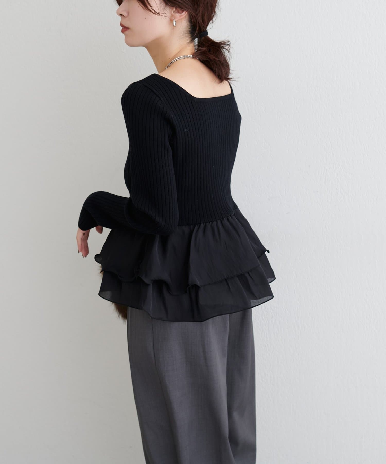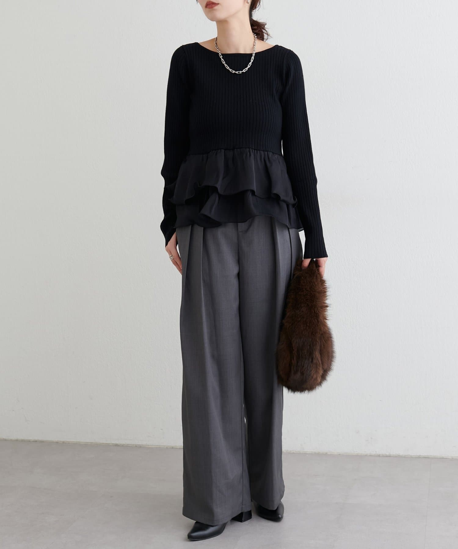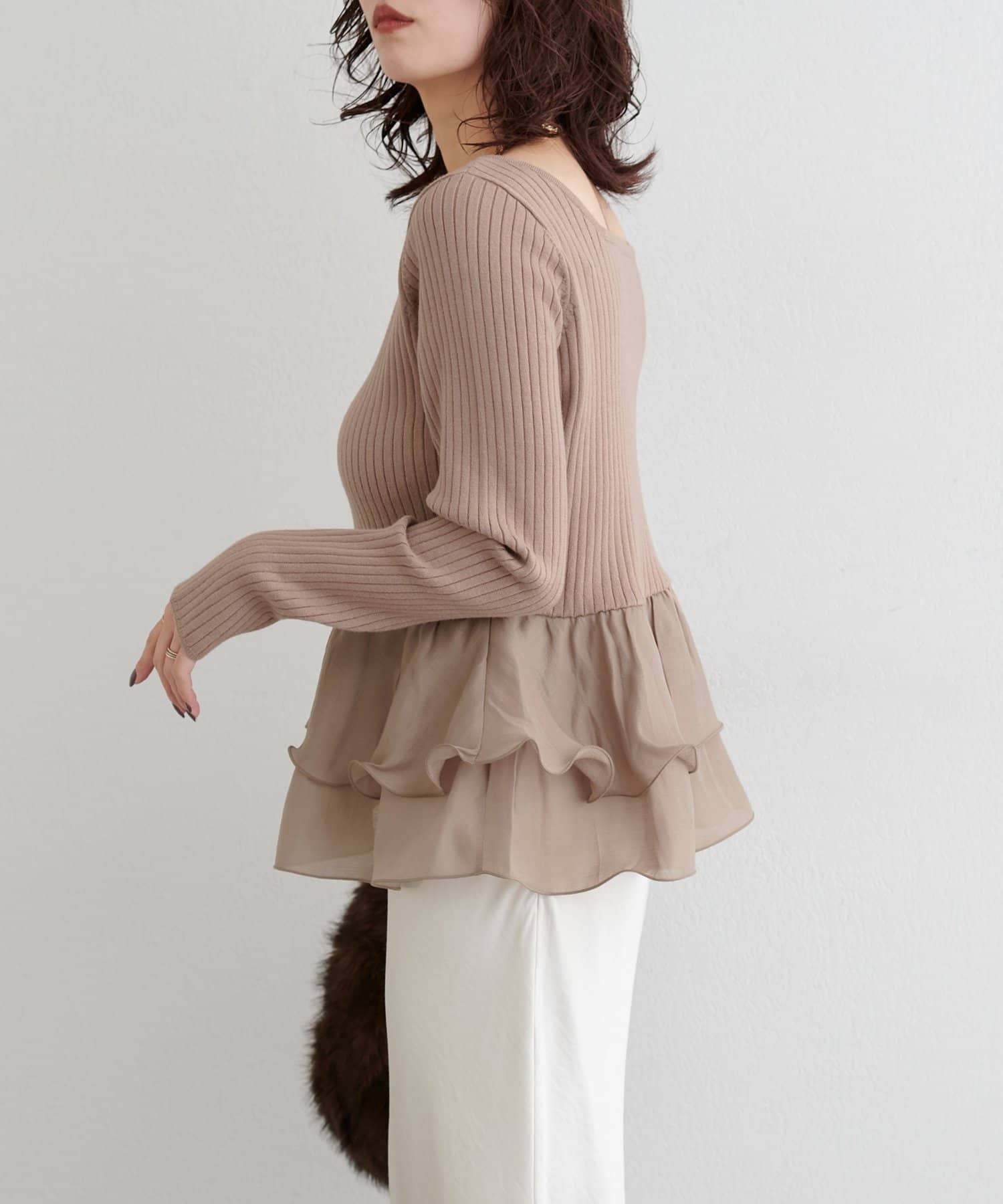 1枚でレイヤードスタイルが叶う、大人も着られるペプラムニット。