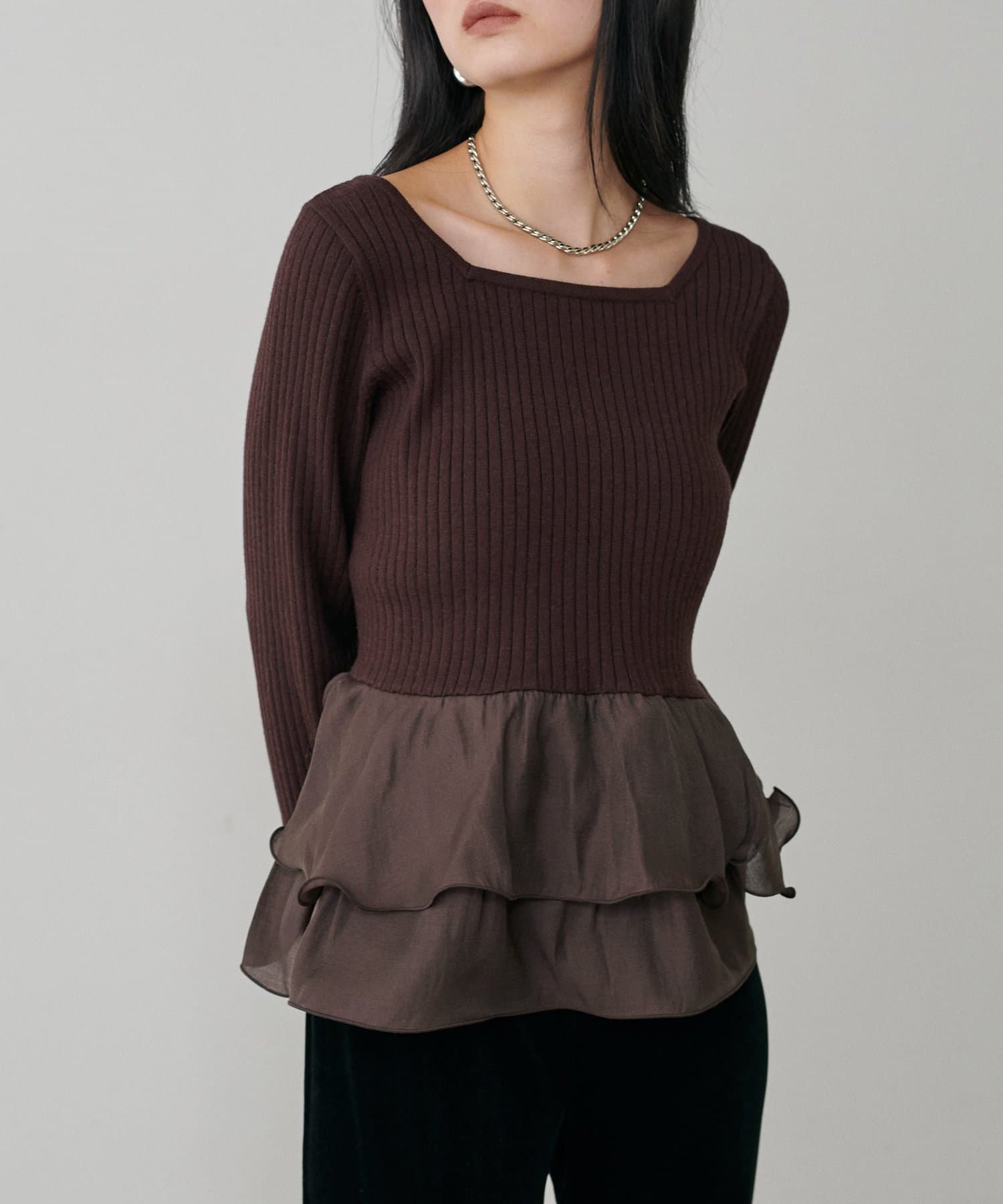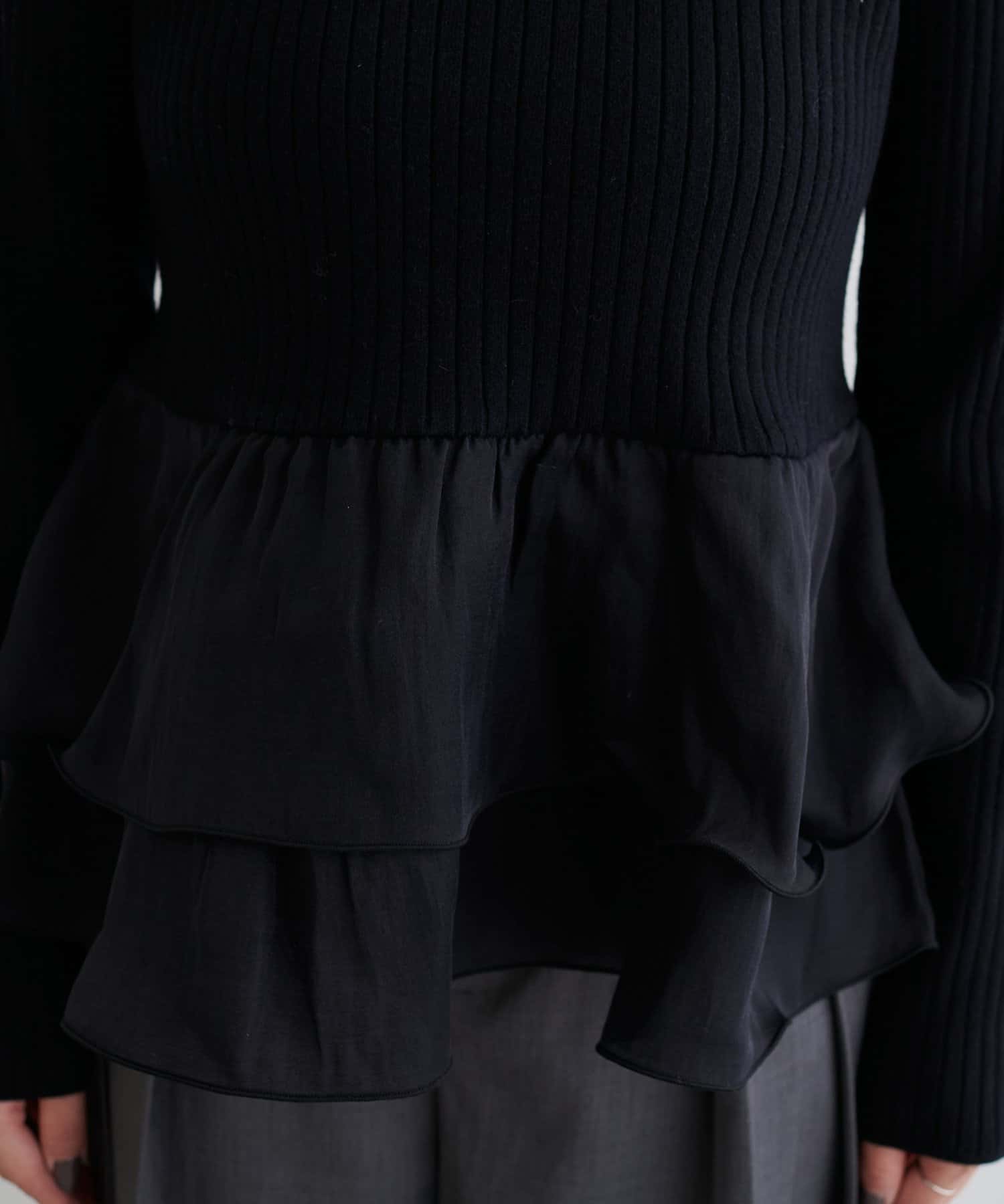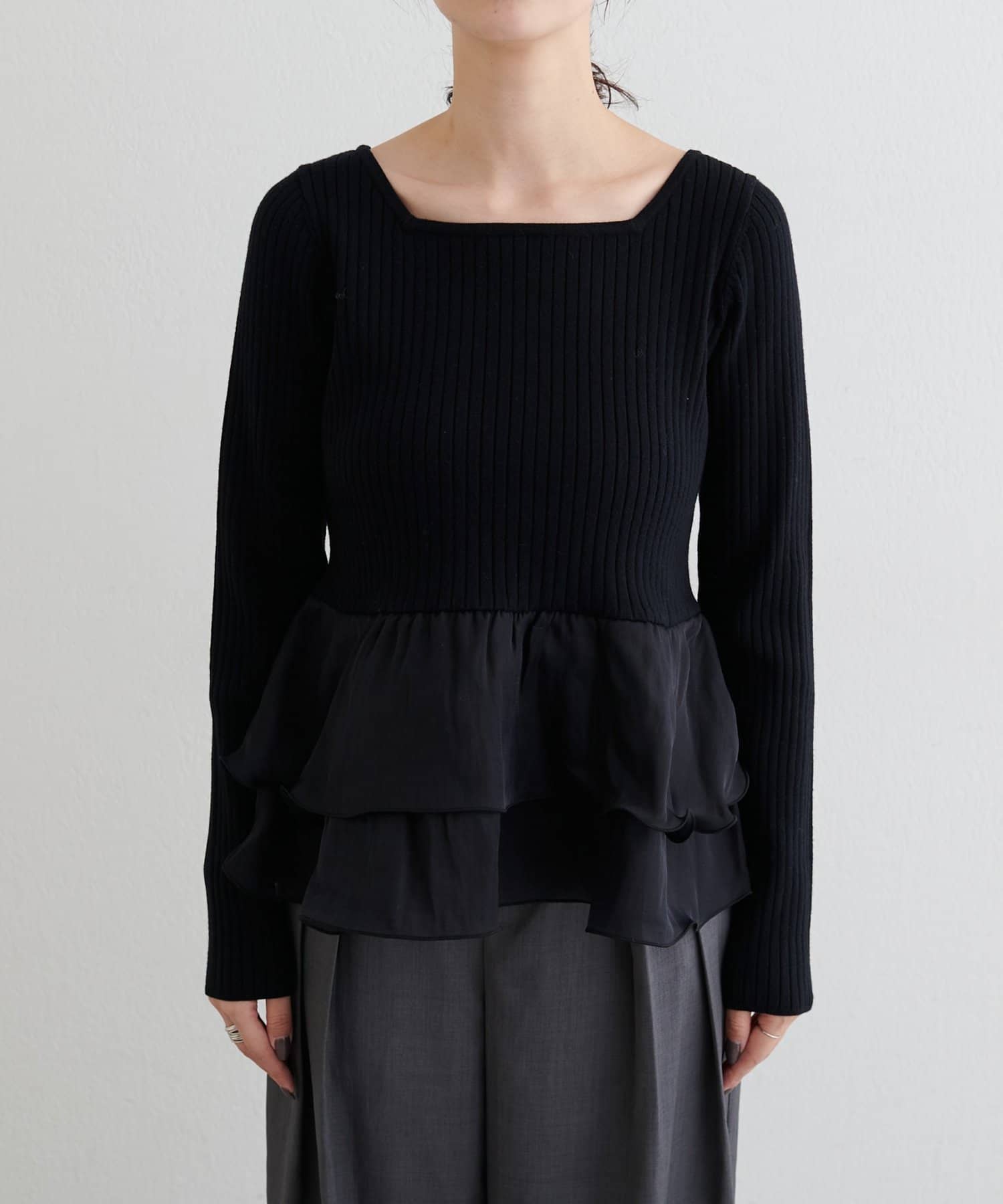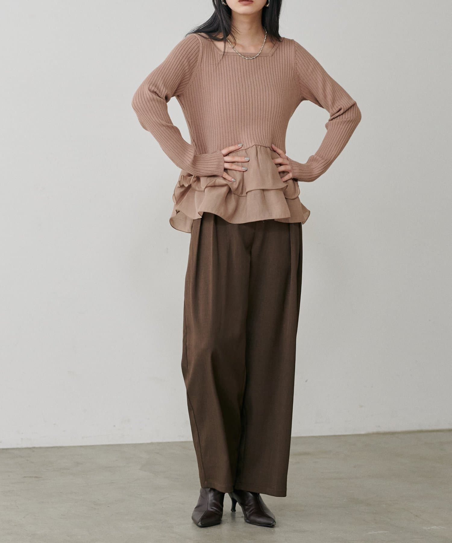 1枚でレイヤードスタイルが叶う、大人も着られるペプラムニット。