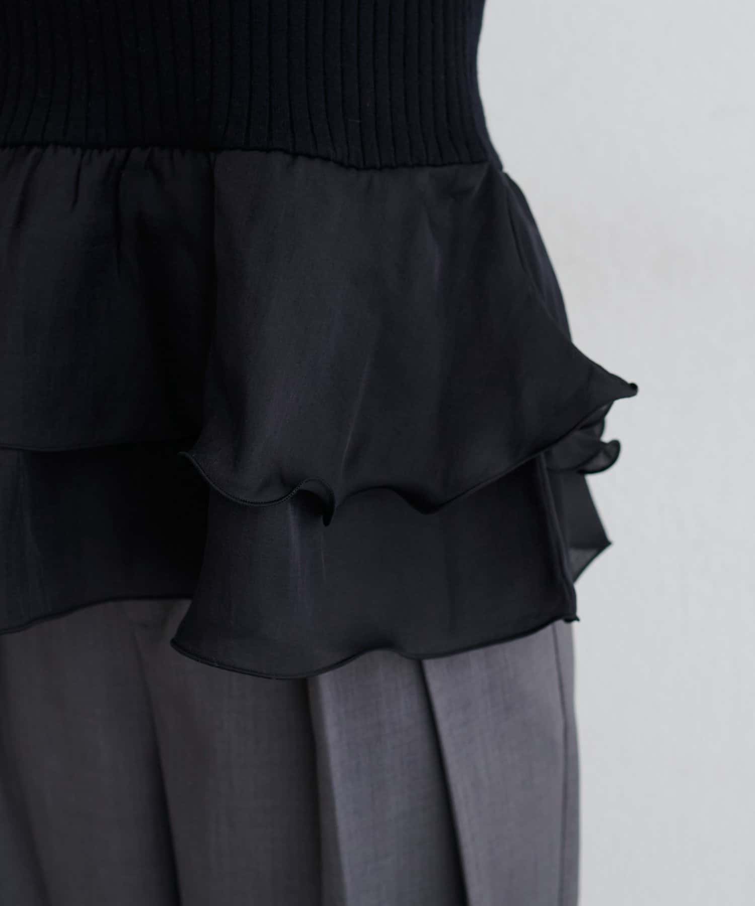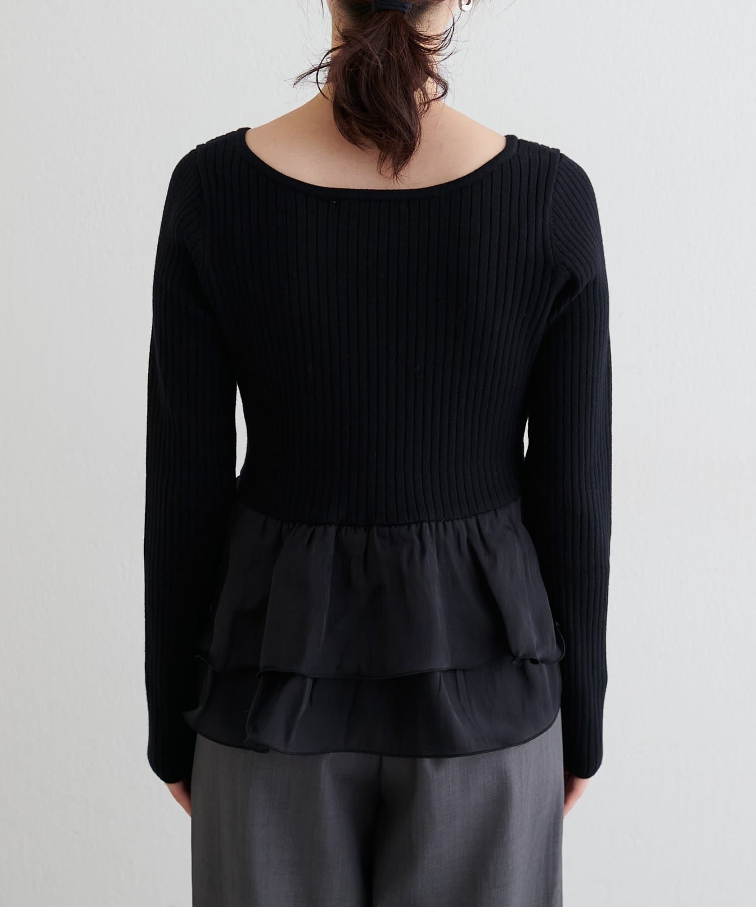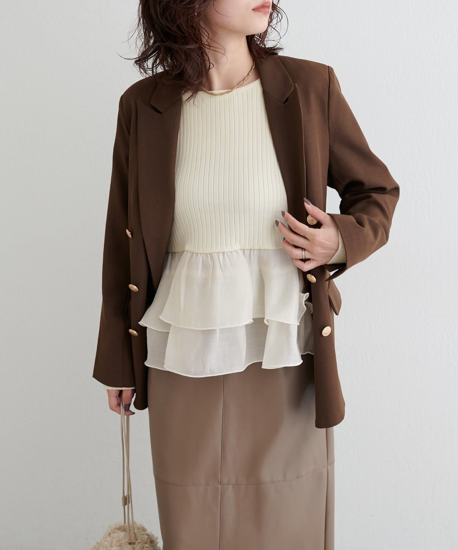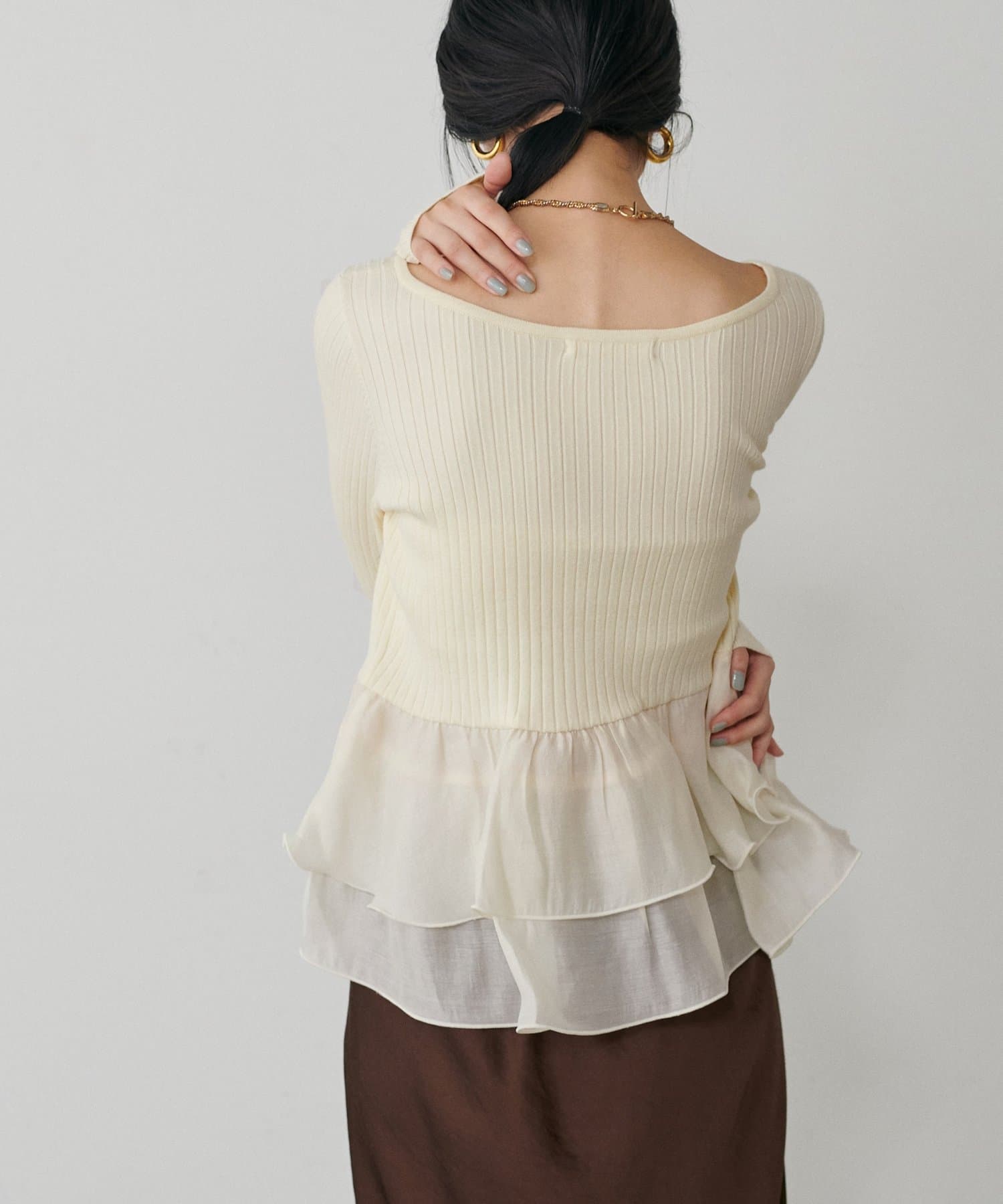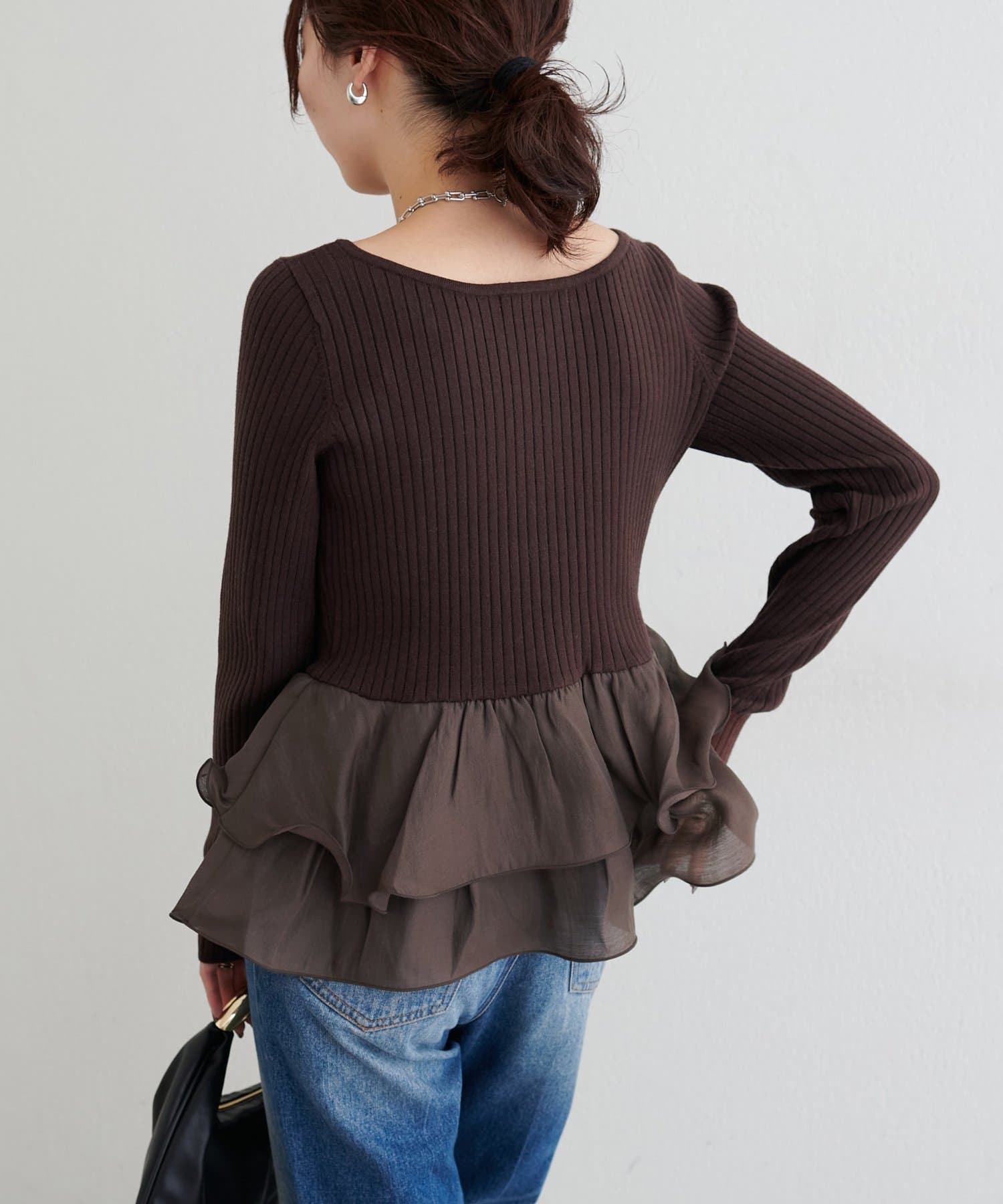 1枚でレイヤードスタイルが叶う、大人も着られるペプラムニット。