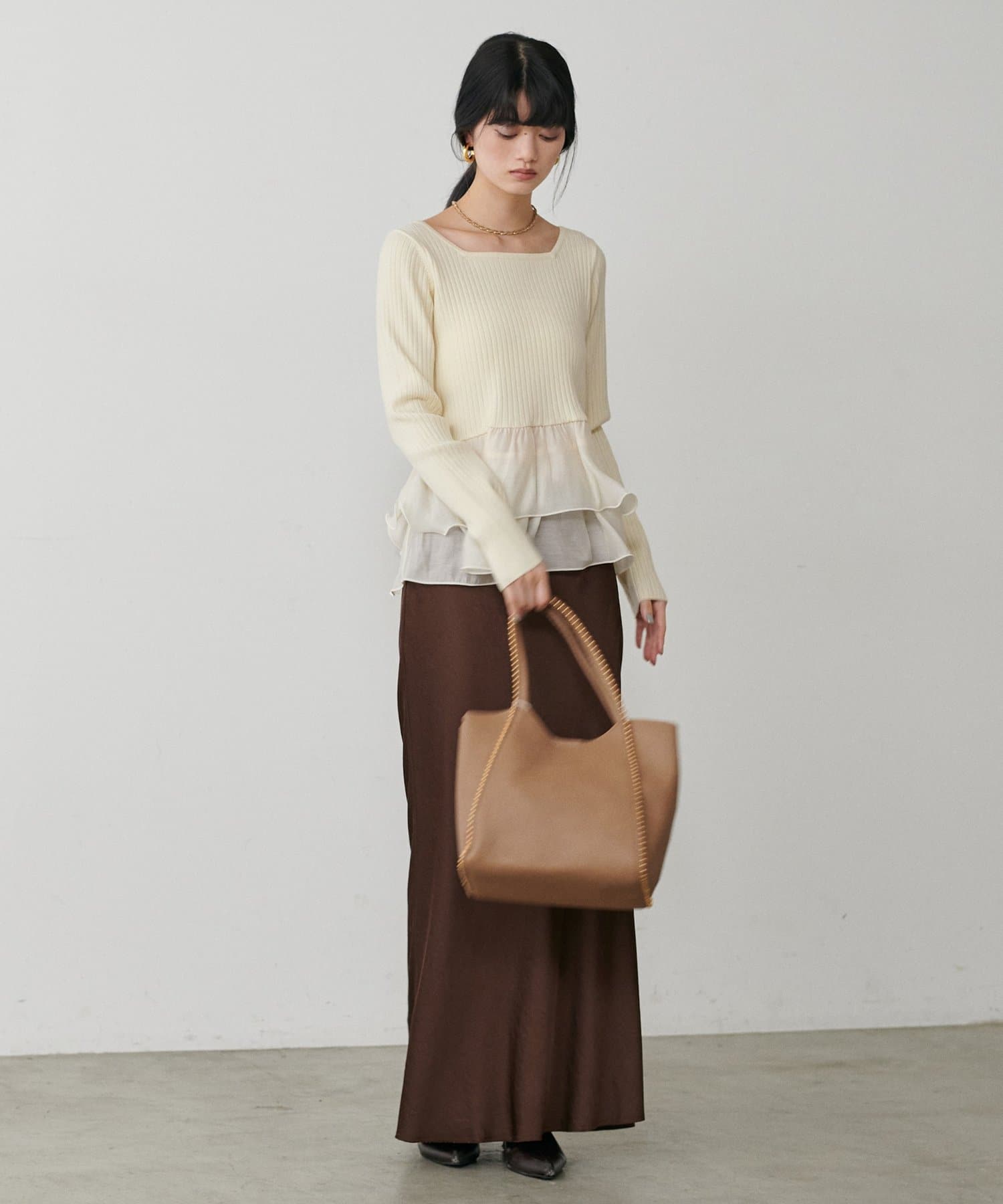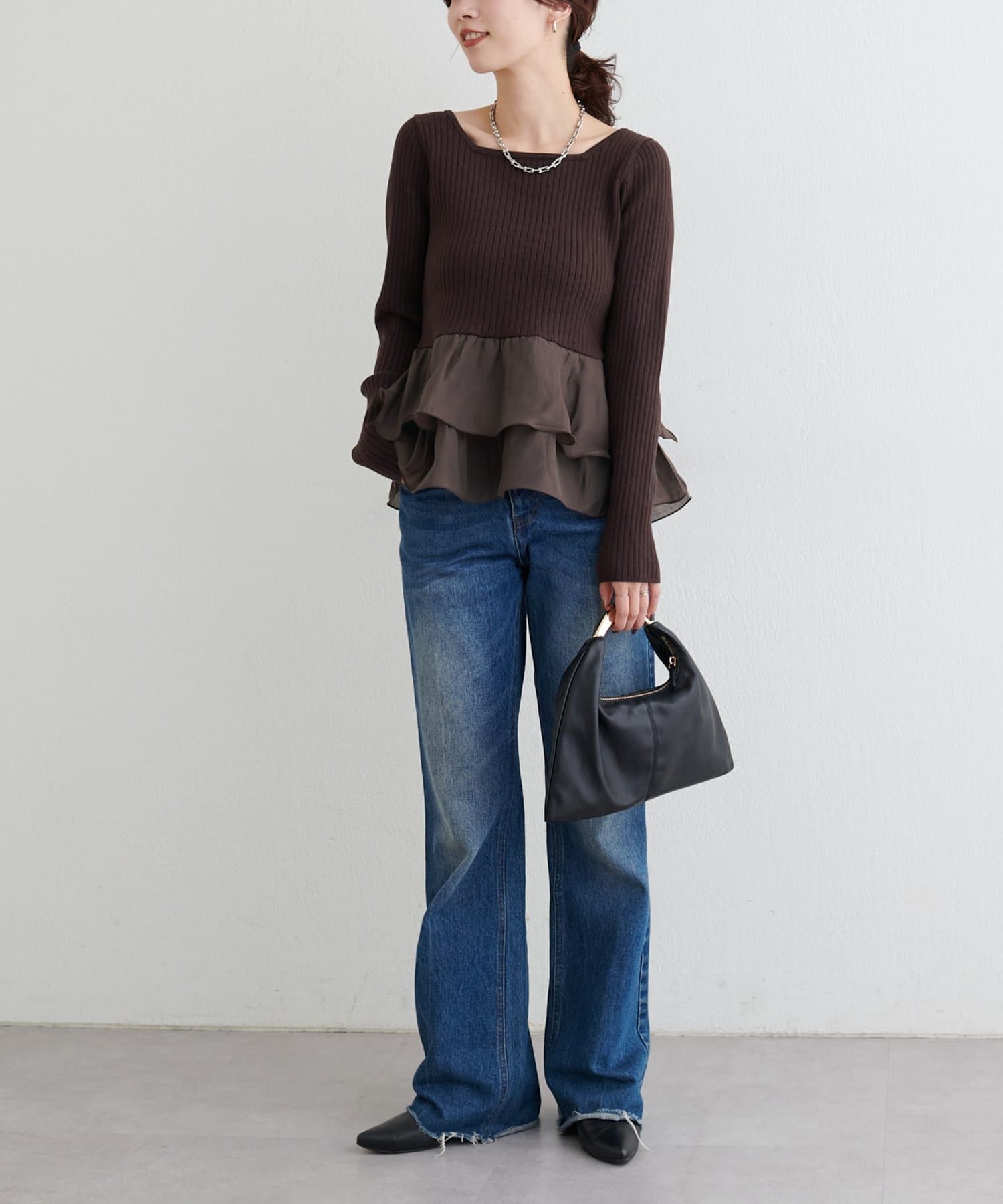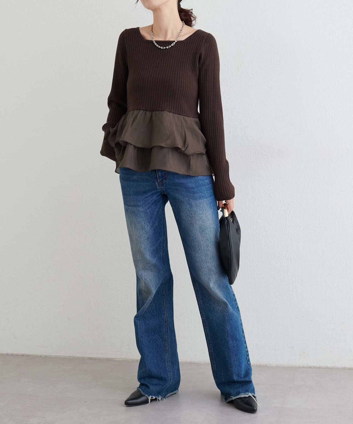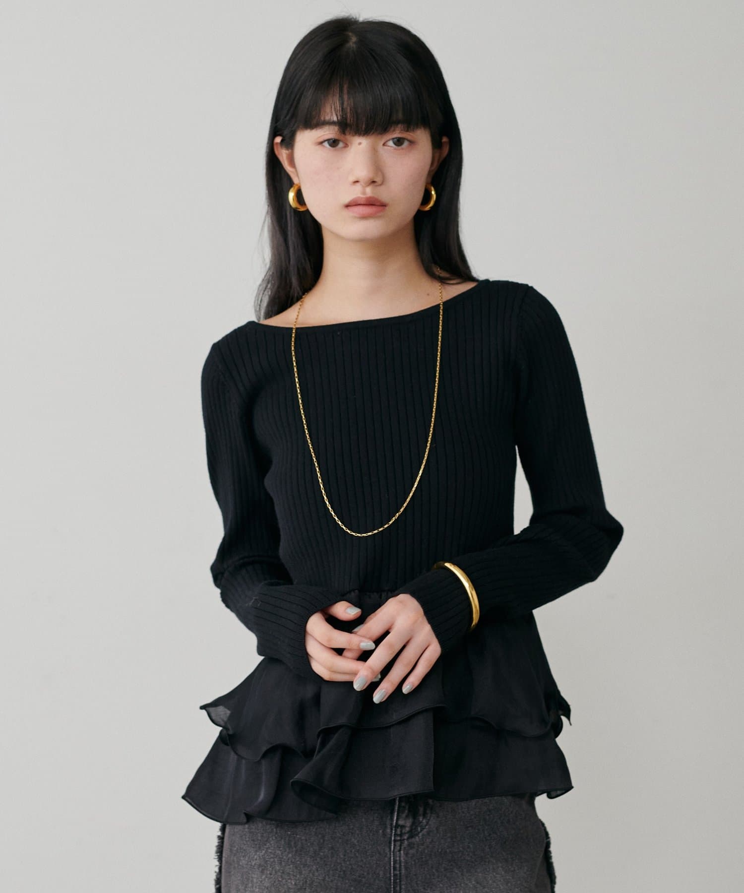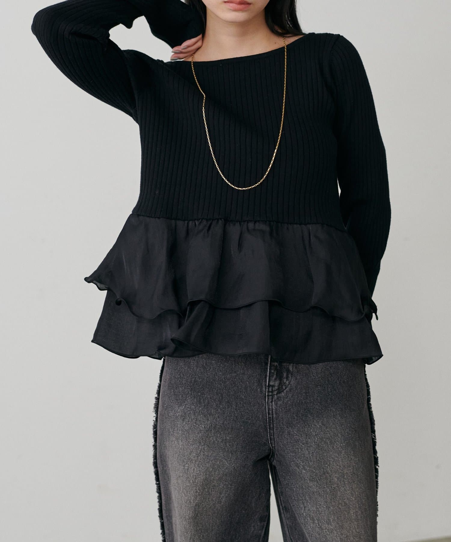 1枚でレイヤードスタイルが叶う、大人も着られるペプラムニット。