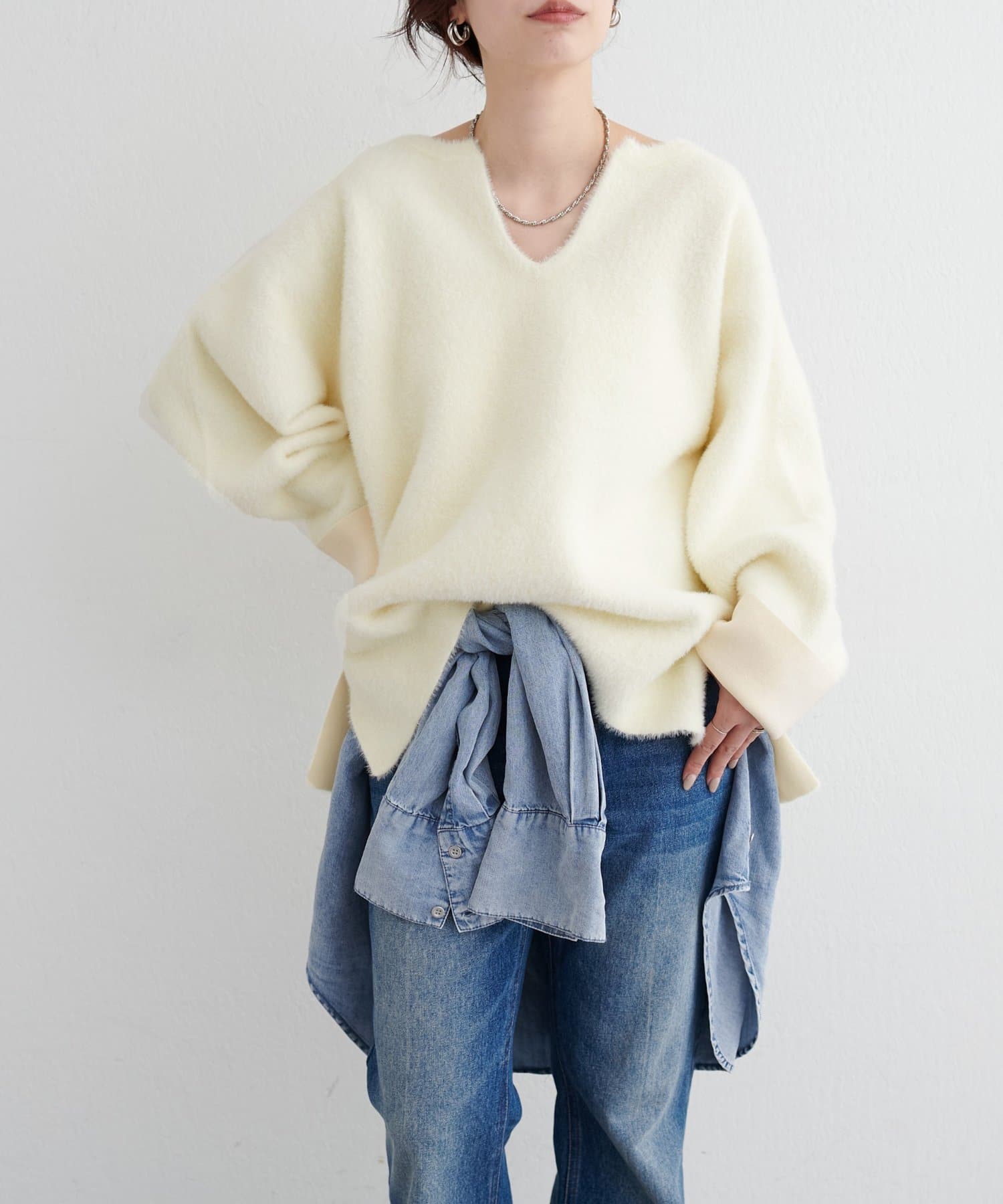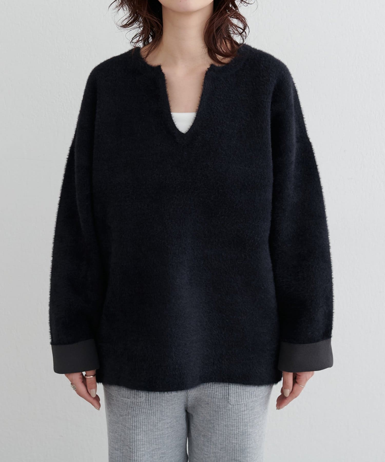 シンプルながらも素材の表情が際立ち、1枚で着てもレイヤードしても様になるアイテムです。
