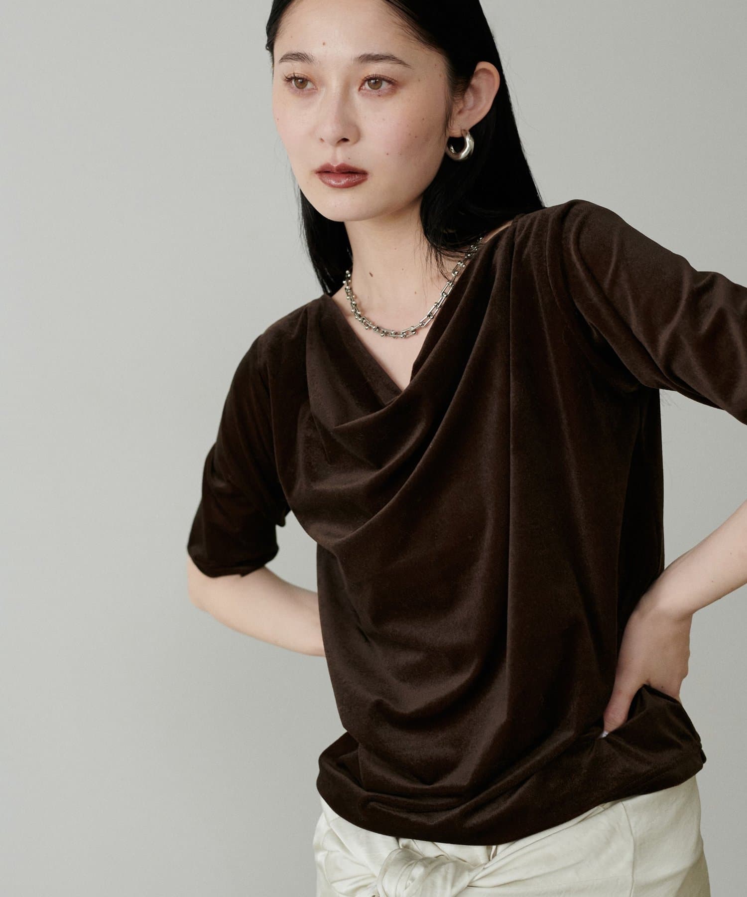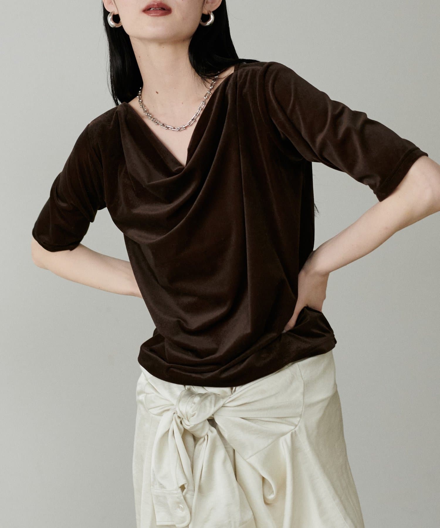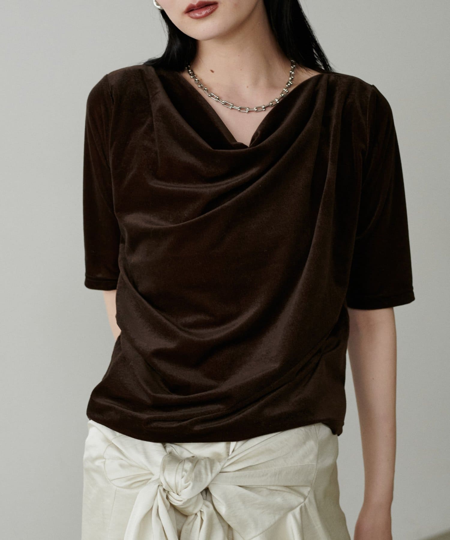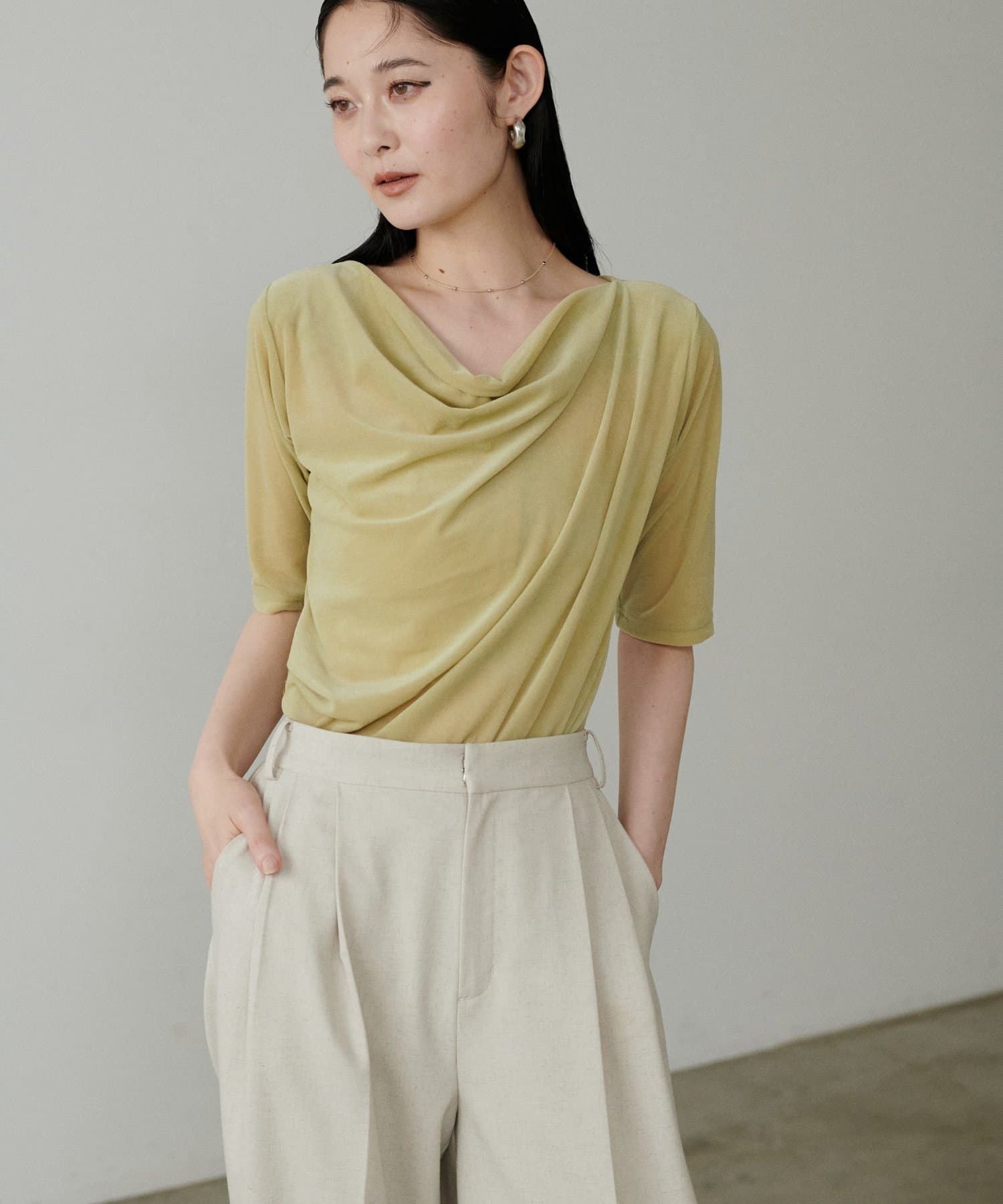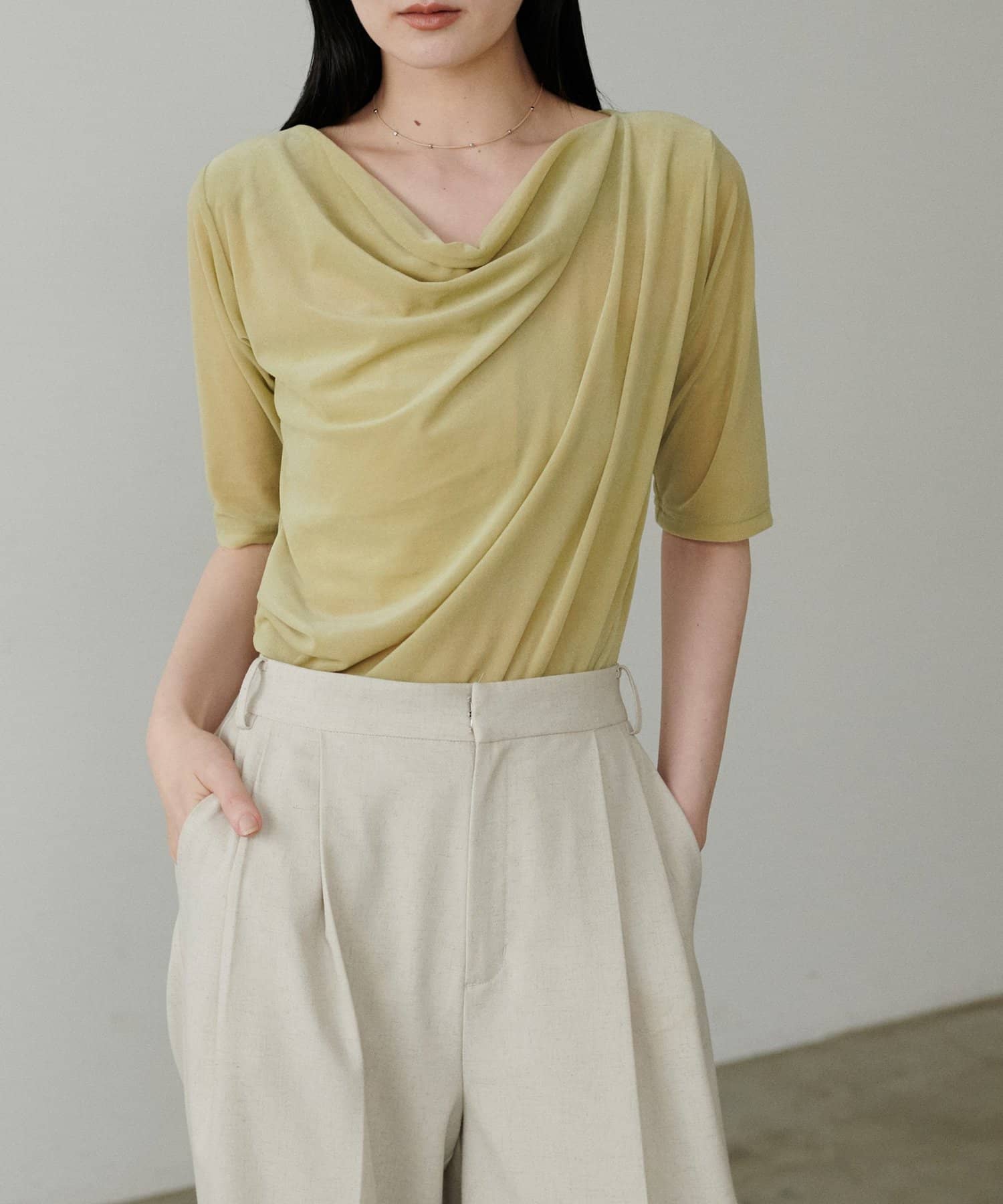 深めに開いたネックラインから生まれるドレープが、デコルテを美しく、華奢に見せてくれます。