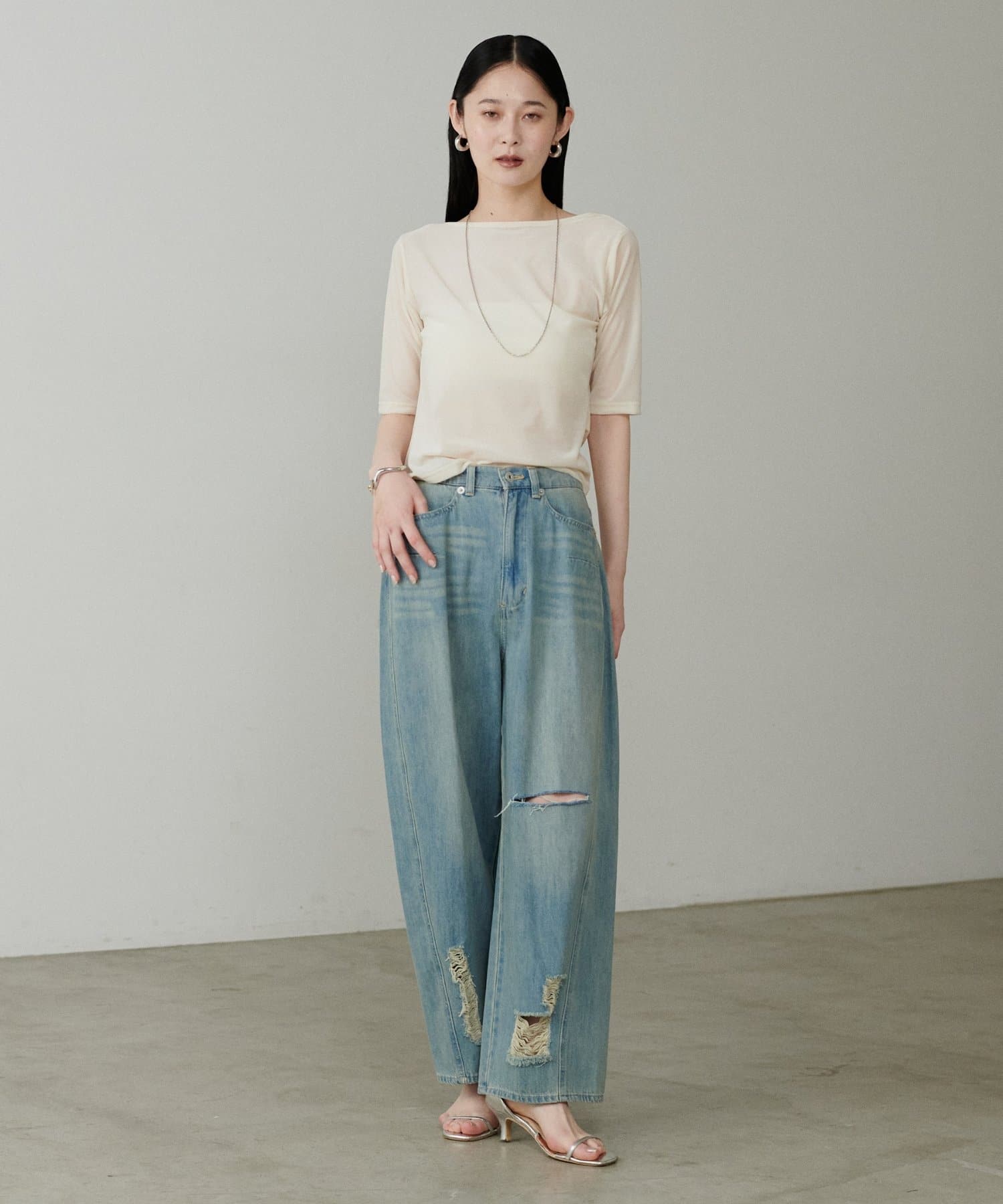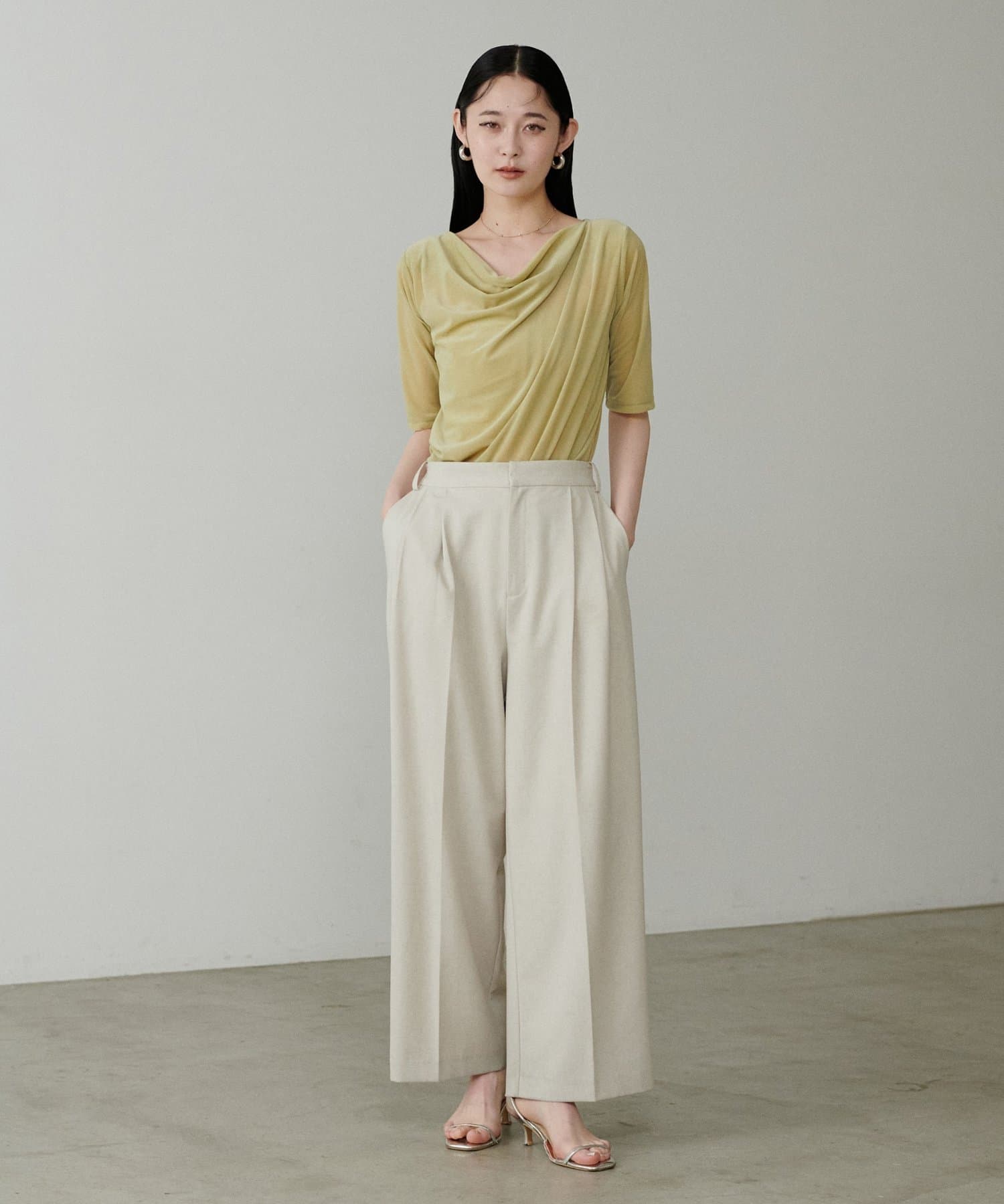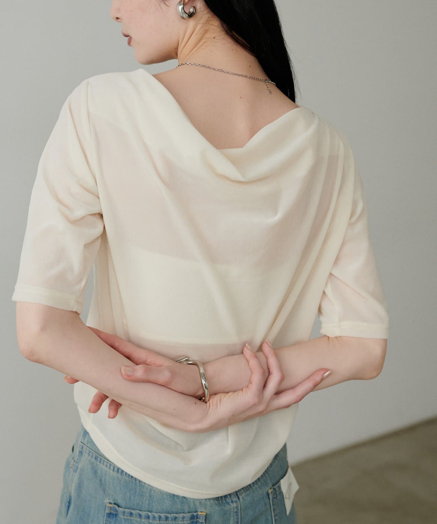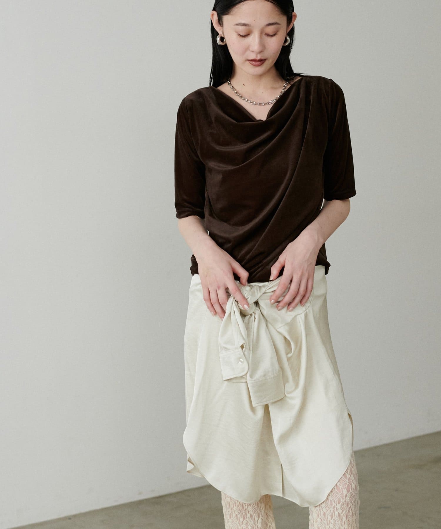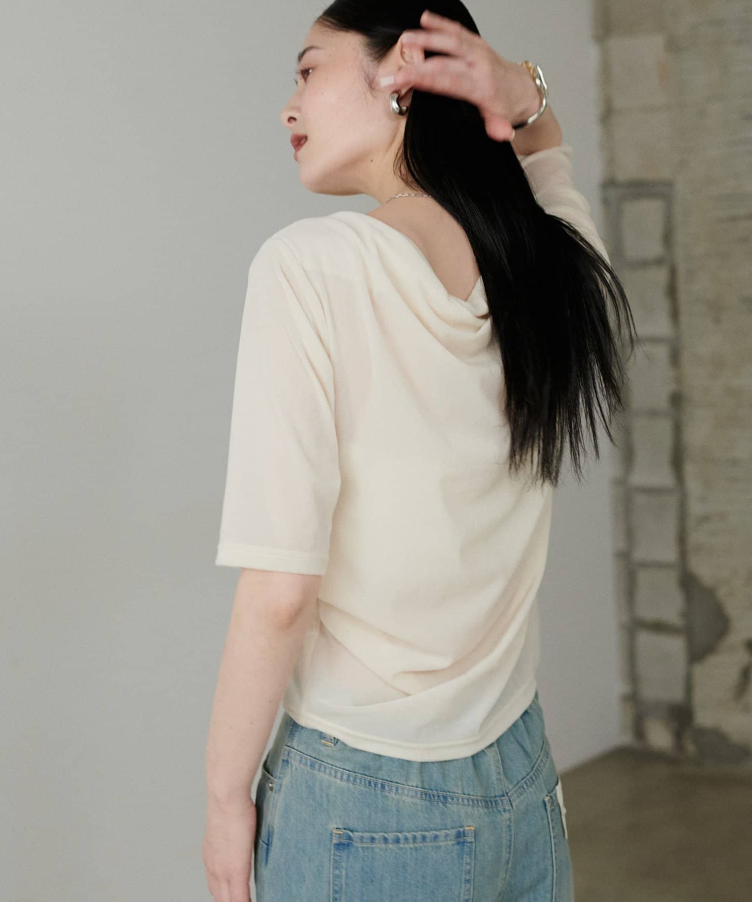 深めに開いたネックラインから生まれるドレープが、デコルテを美しく、華奢に見せてくれます。