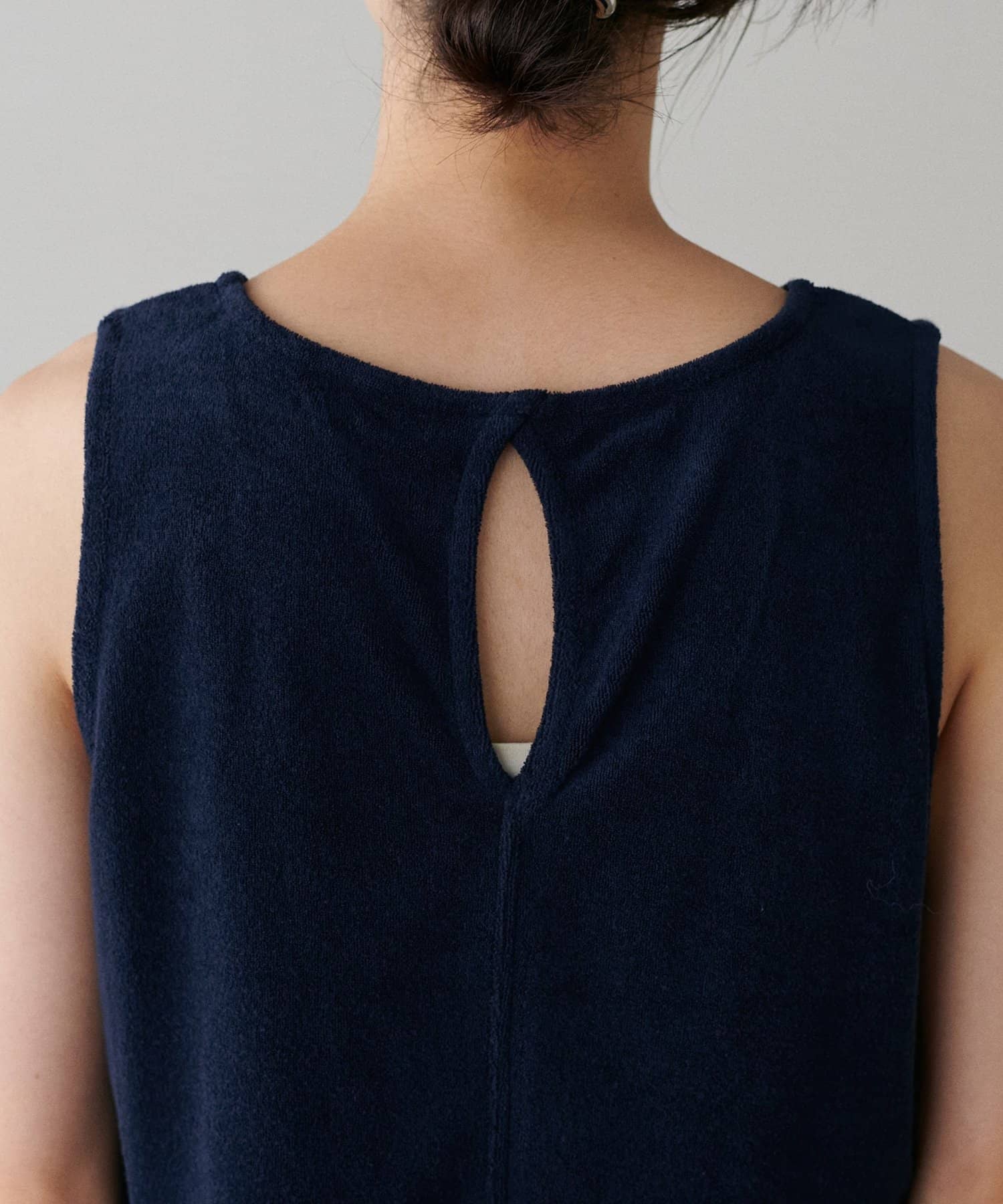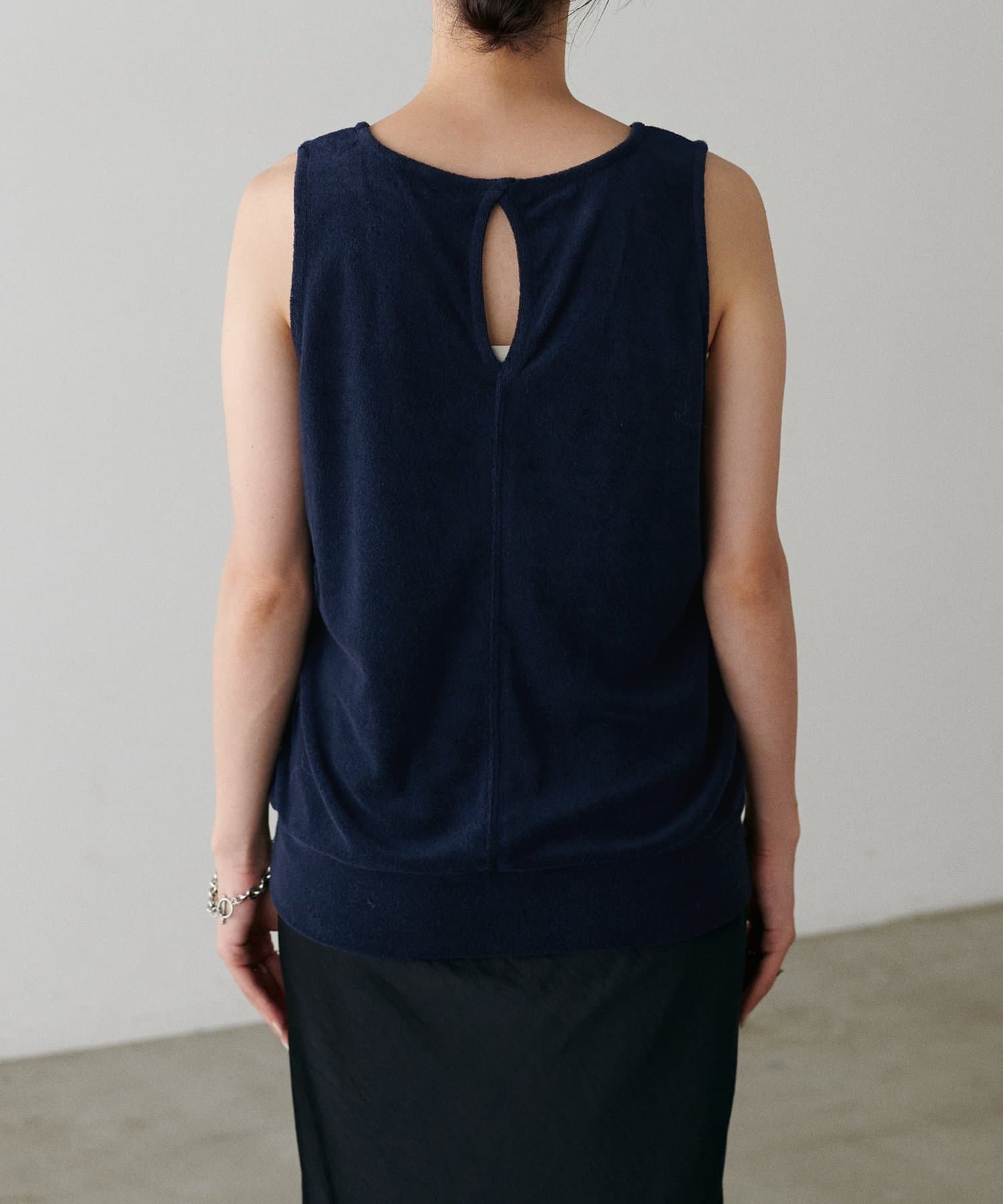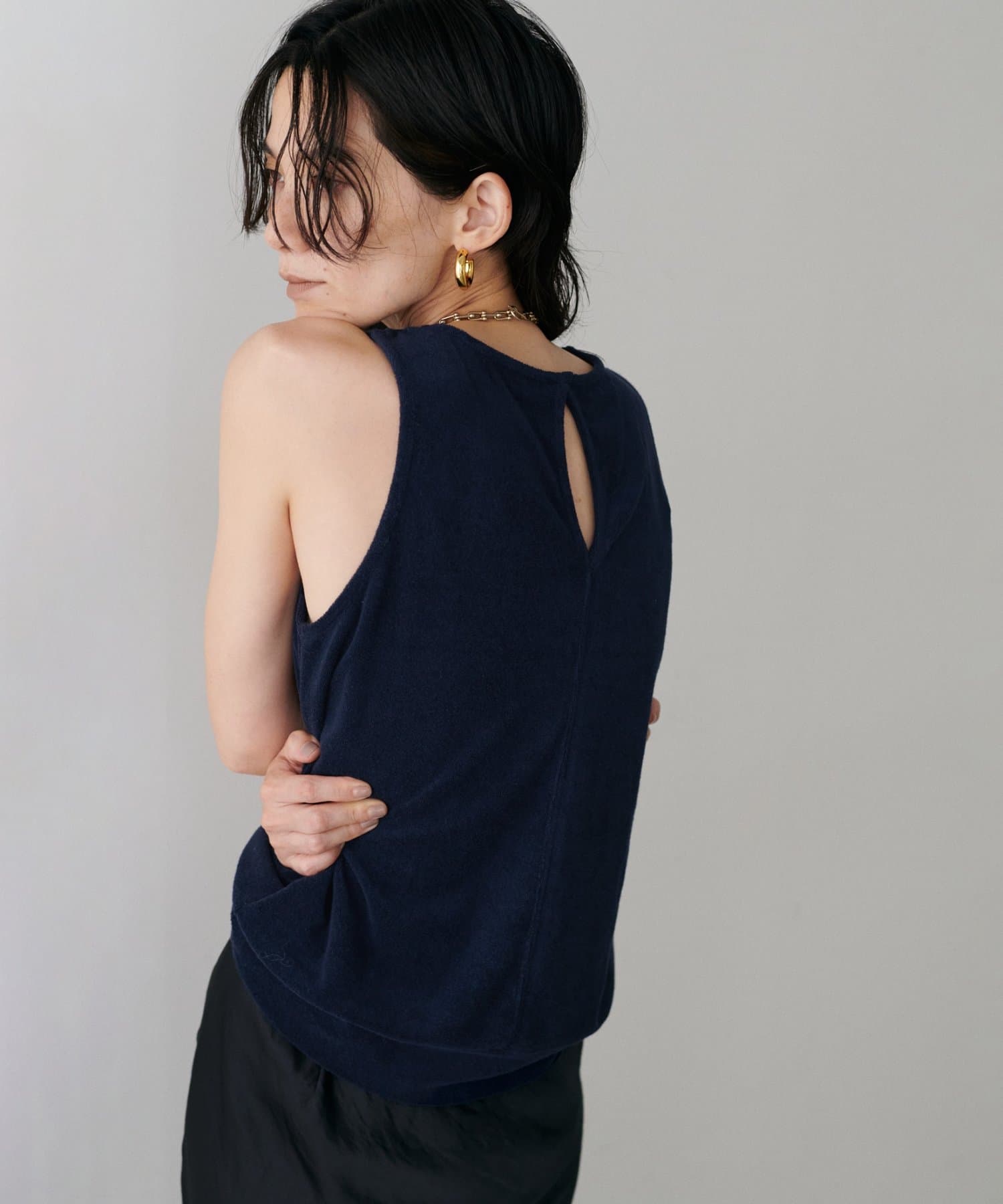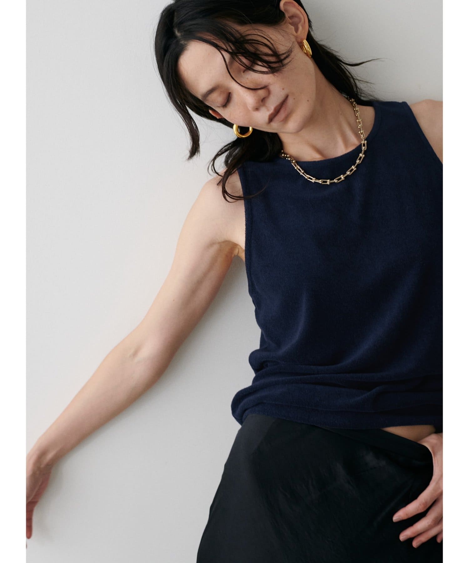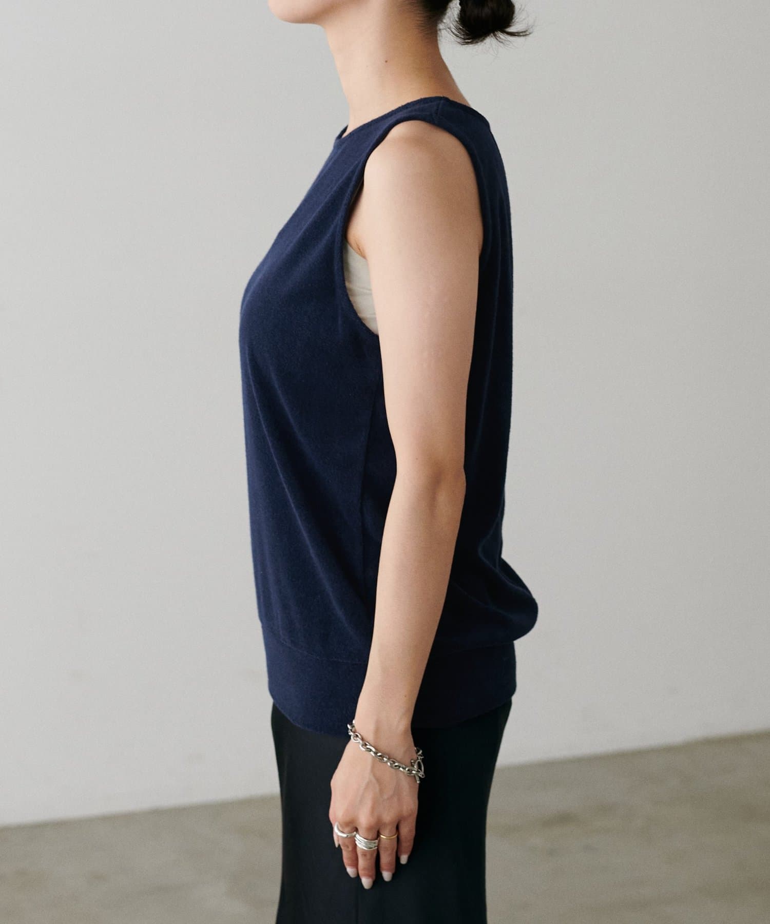 ふんわりとした柔らかいパイル素材で仕立てた、肌あたり抜群のノースリーブトップス。