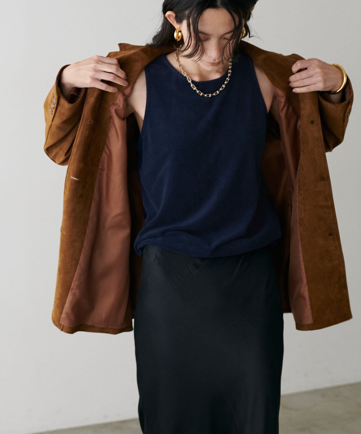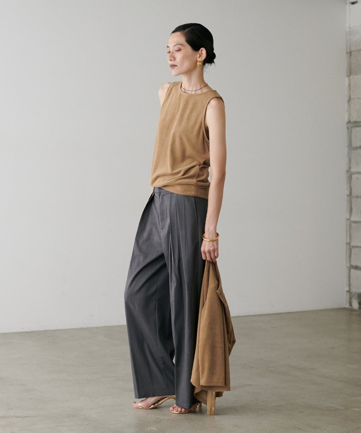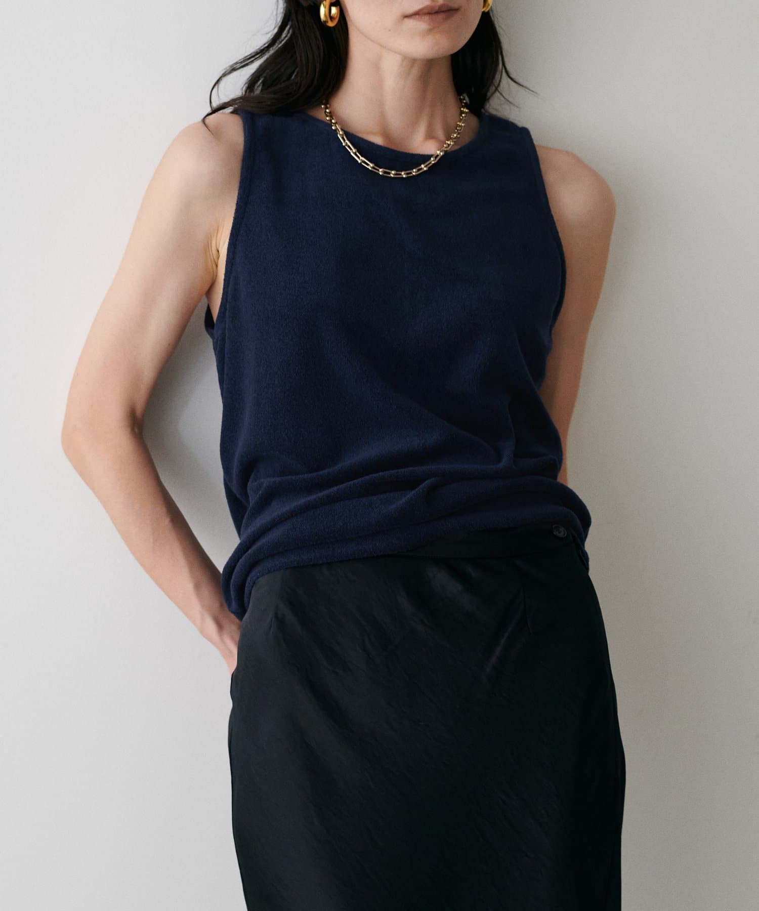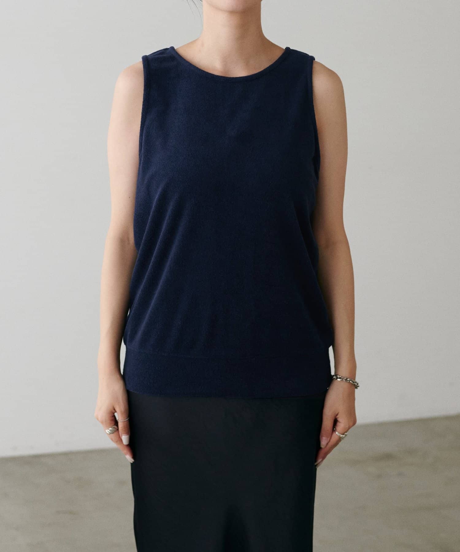 ふんわりとした柔らかいパイル素材で仕立てた、肌あたり抜群のノースリーブトップス。