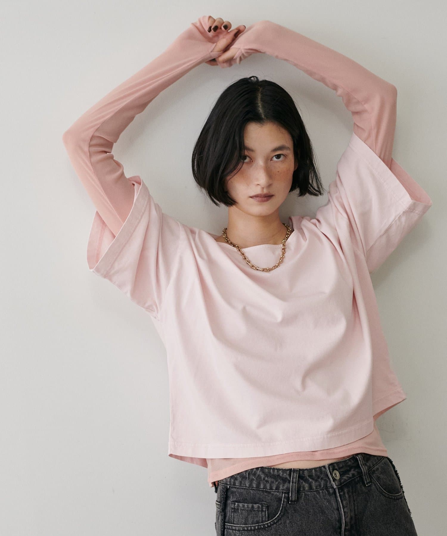 ピグメント加工によるヴィンテージライクな風合いが魅力のオフショルダードルマンTシャツ。