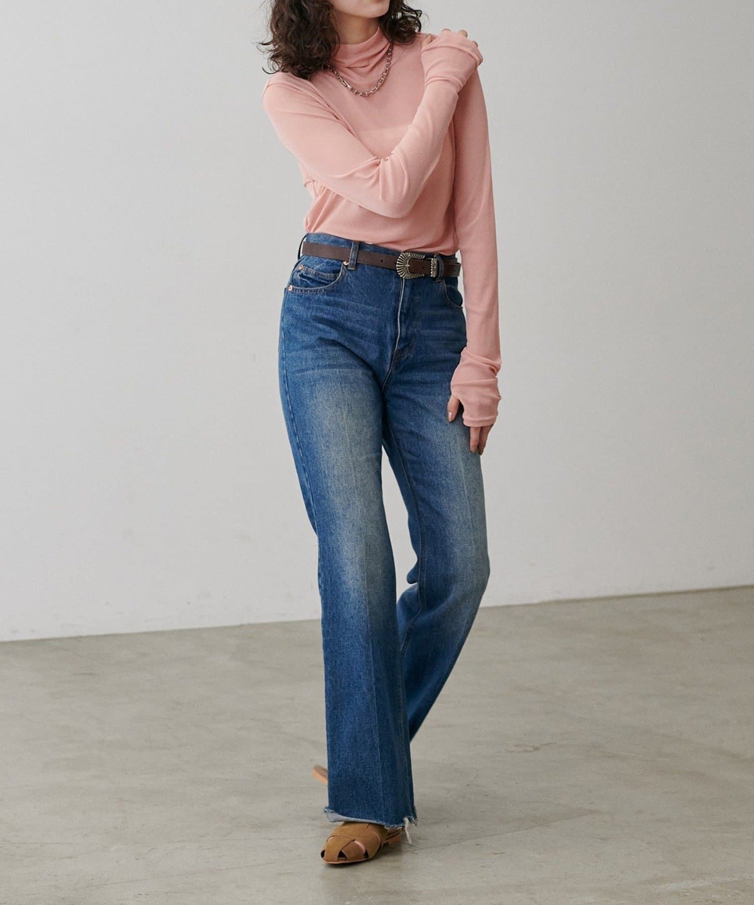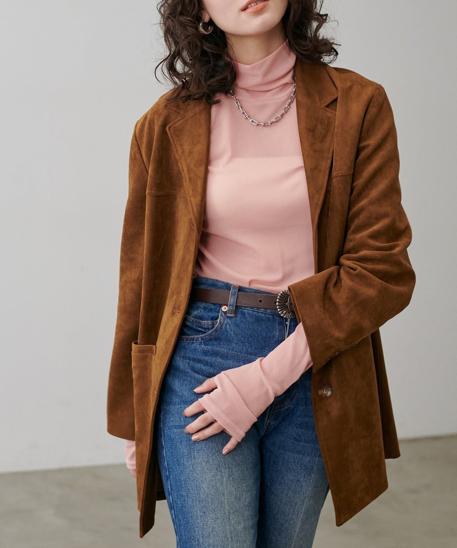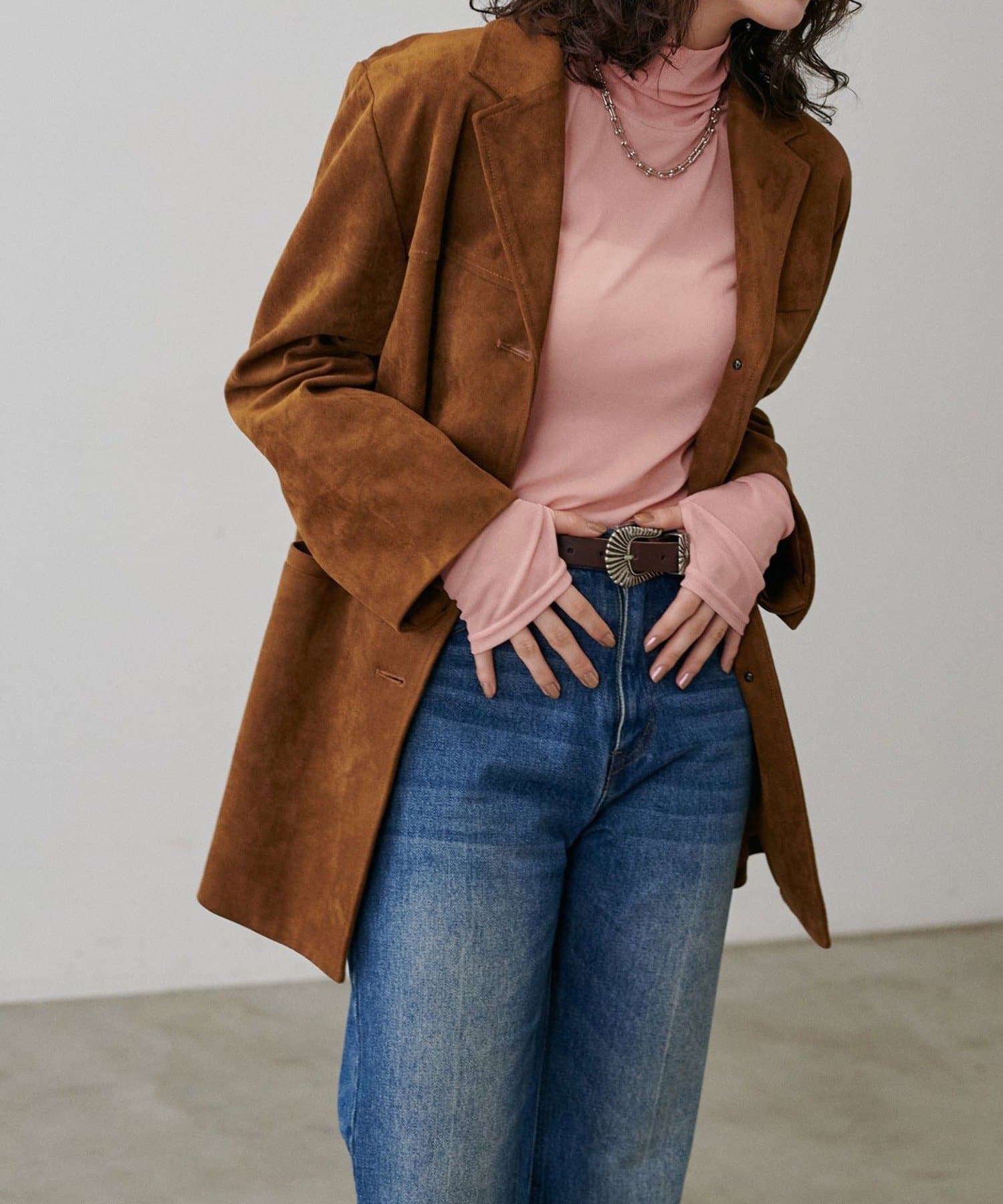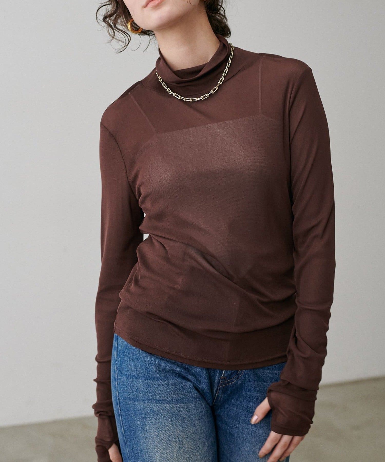 長めのスリーブとハイネックデザインを生かして