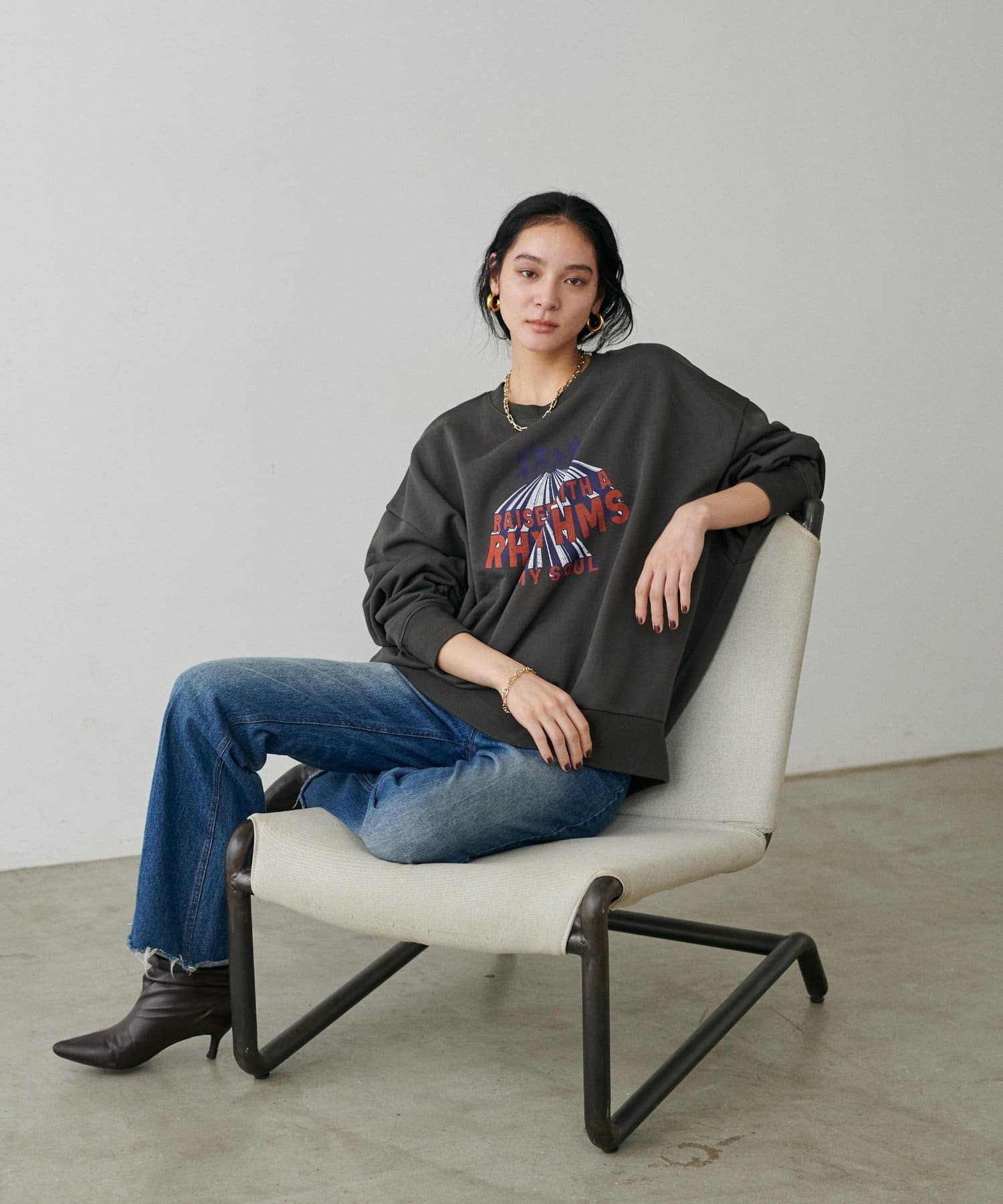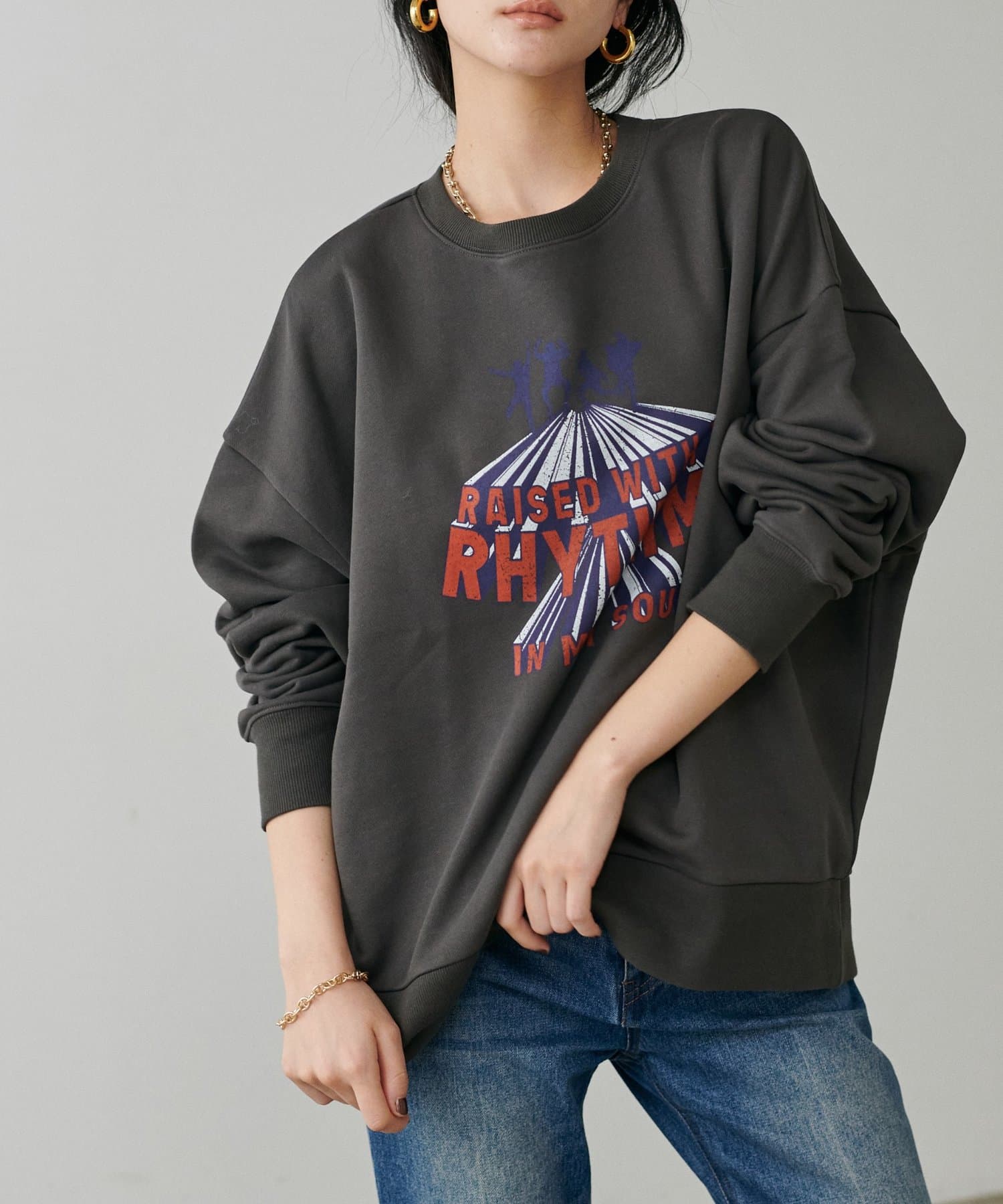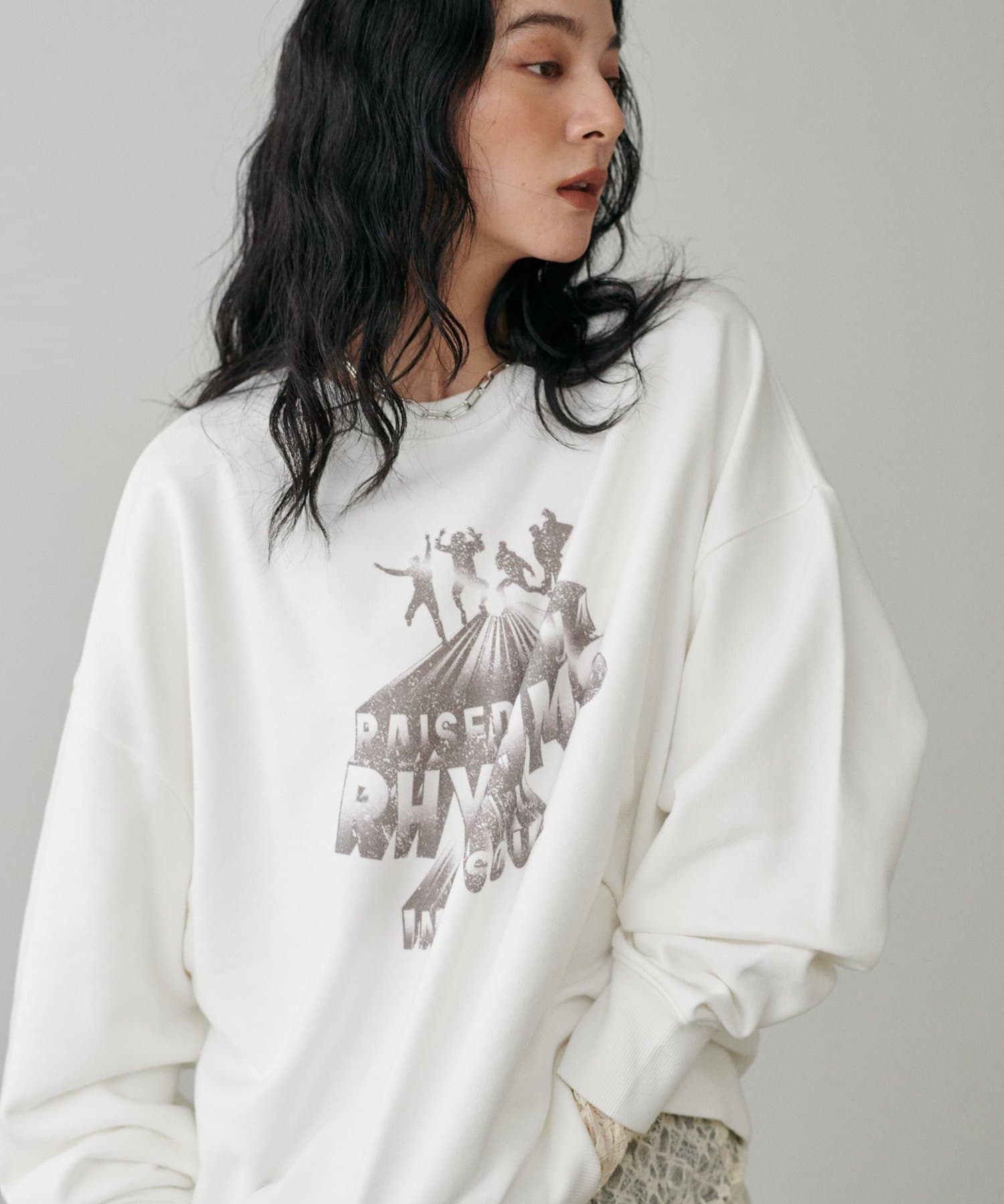 架空のバンドロゴをモチーフにした、遊び心のあるグラフィックプリントが印象的な裏毛プルオーバー。
