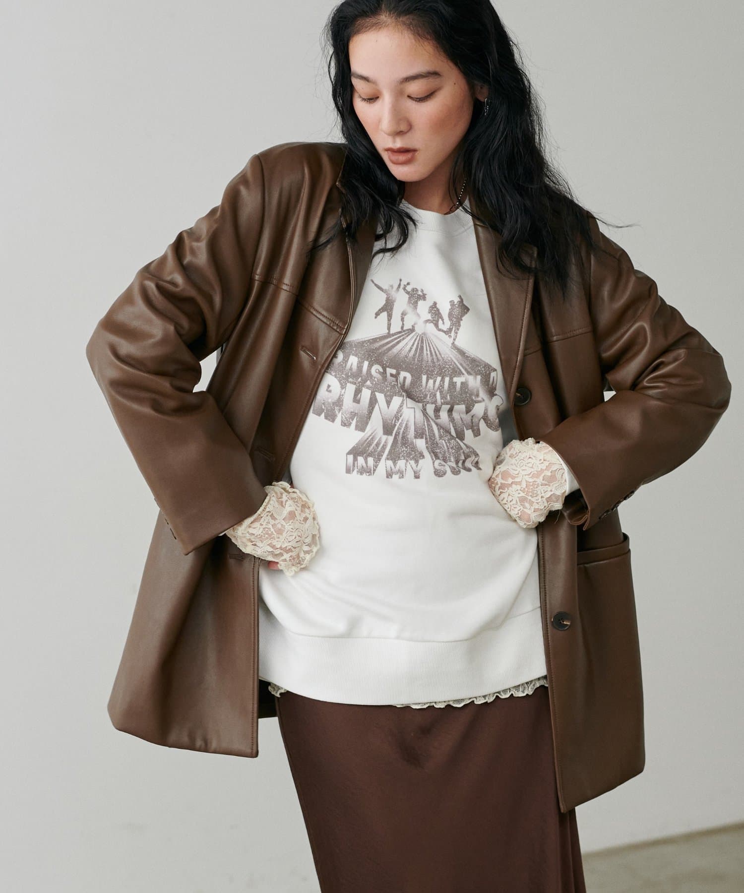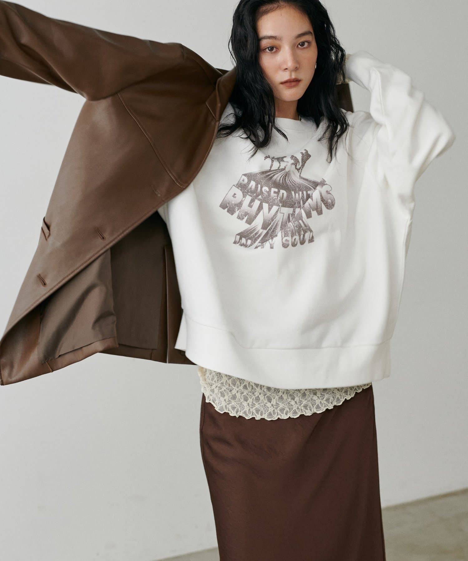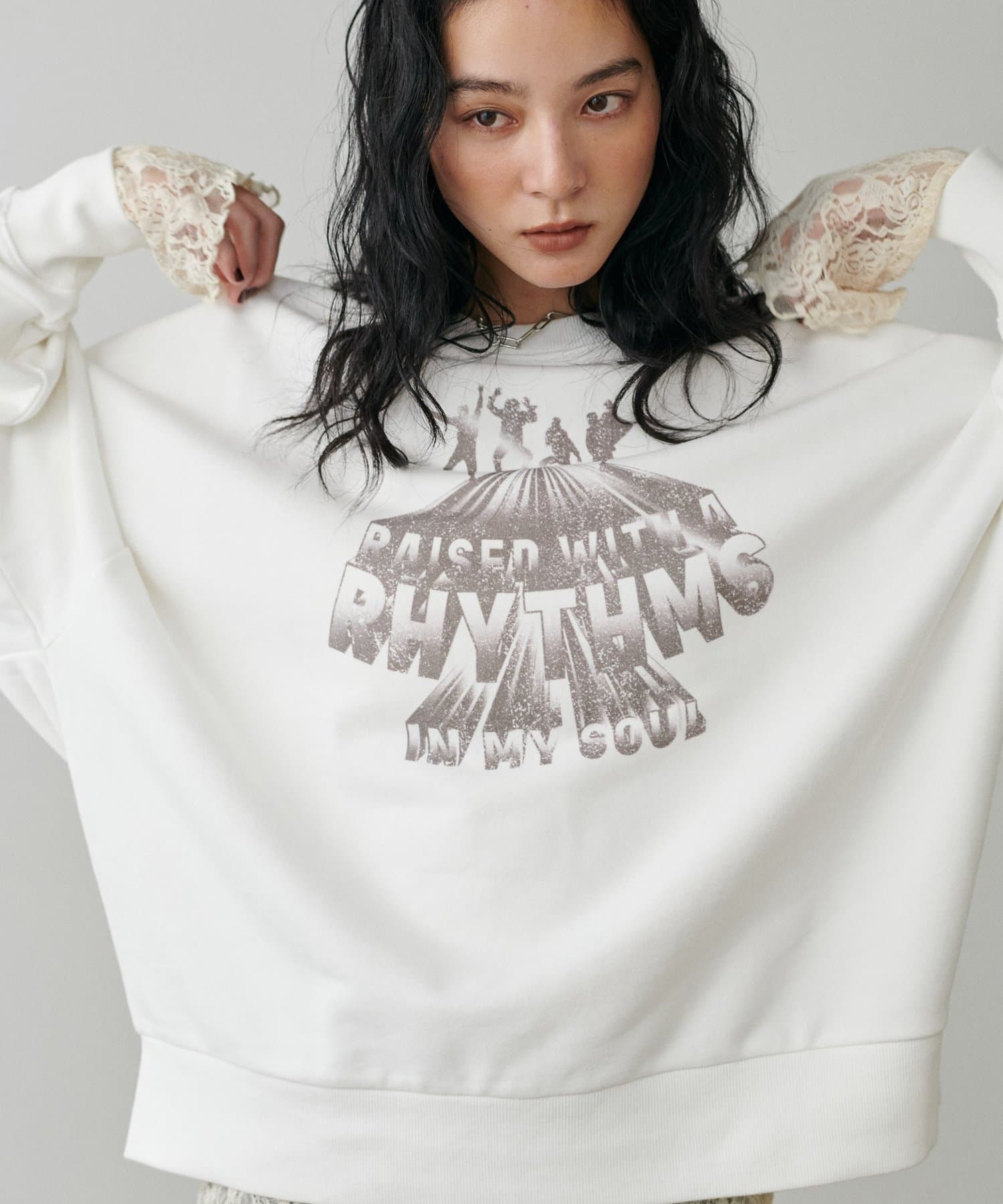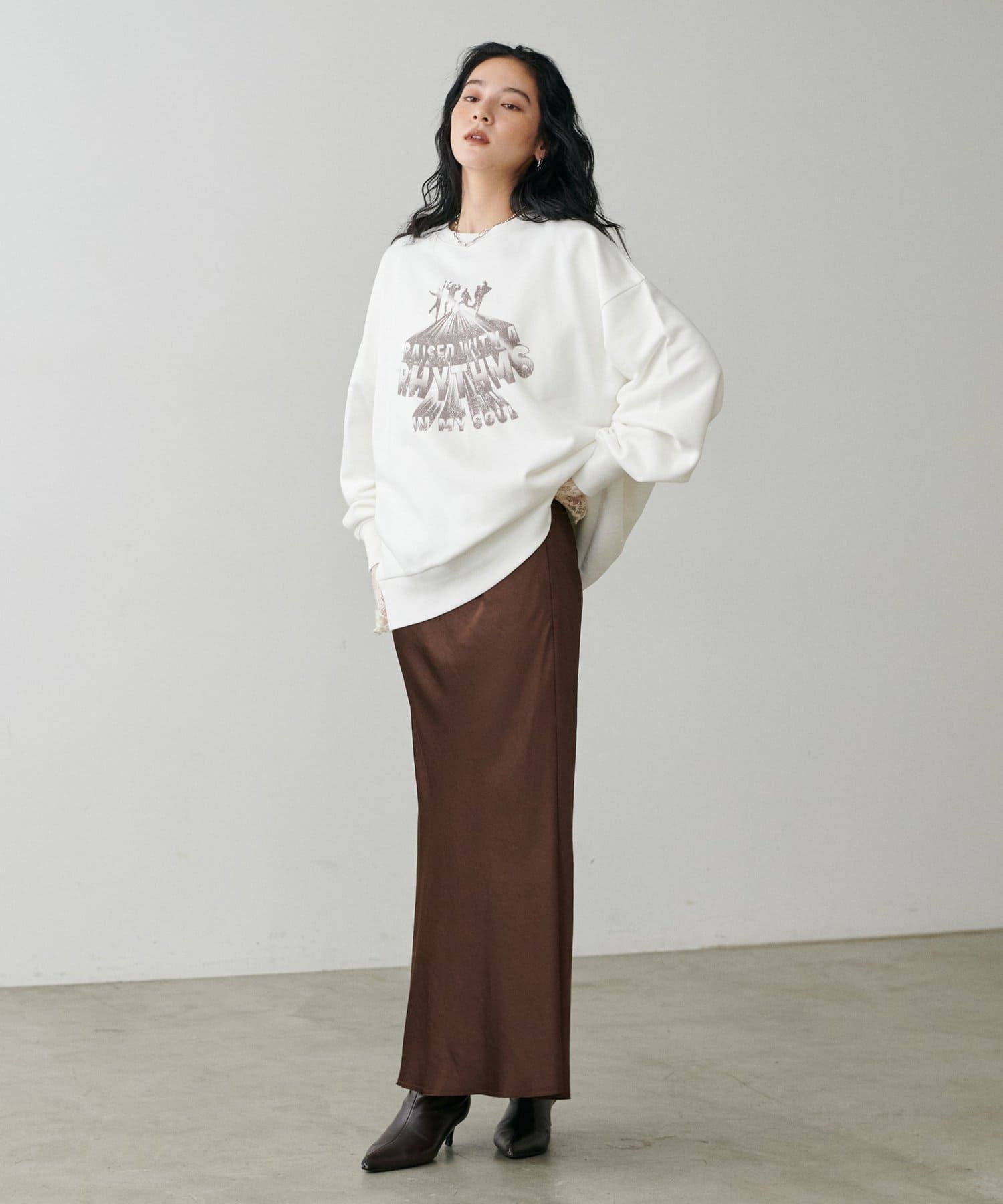 架空のバンドロゴをモチーフにした、遊び心のあるグラフィックプリントが印象的な裏毛プルオーバー。