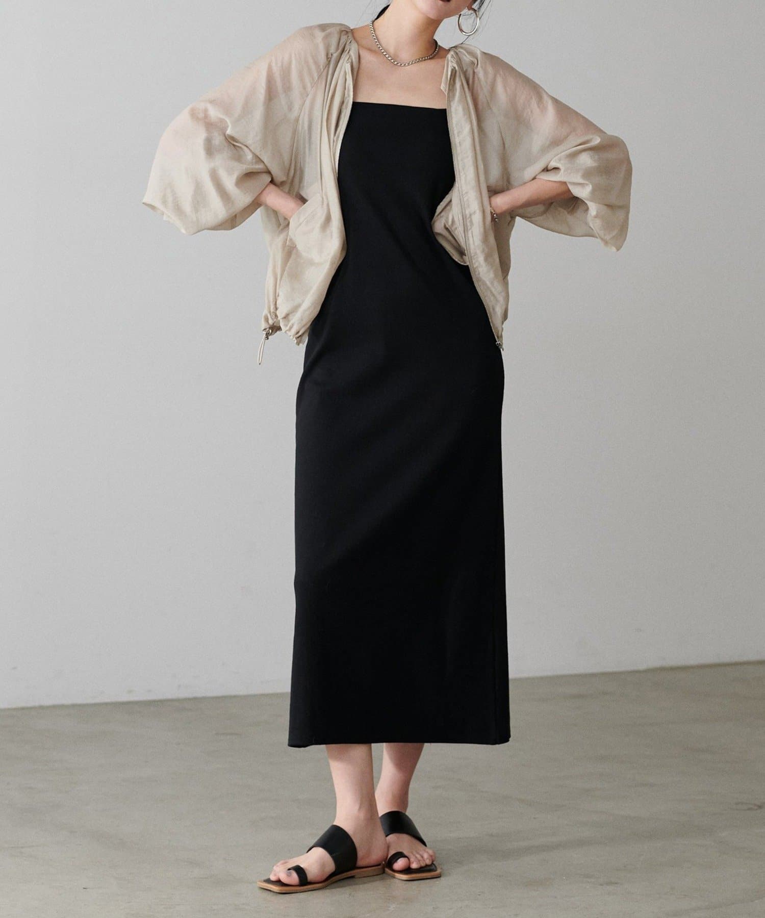夏は透け感を生かして、キャミワンピースやノースリーブの上に、