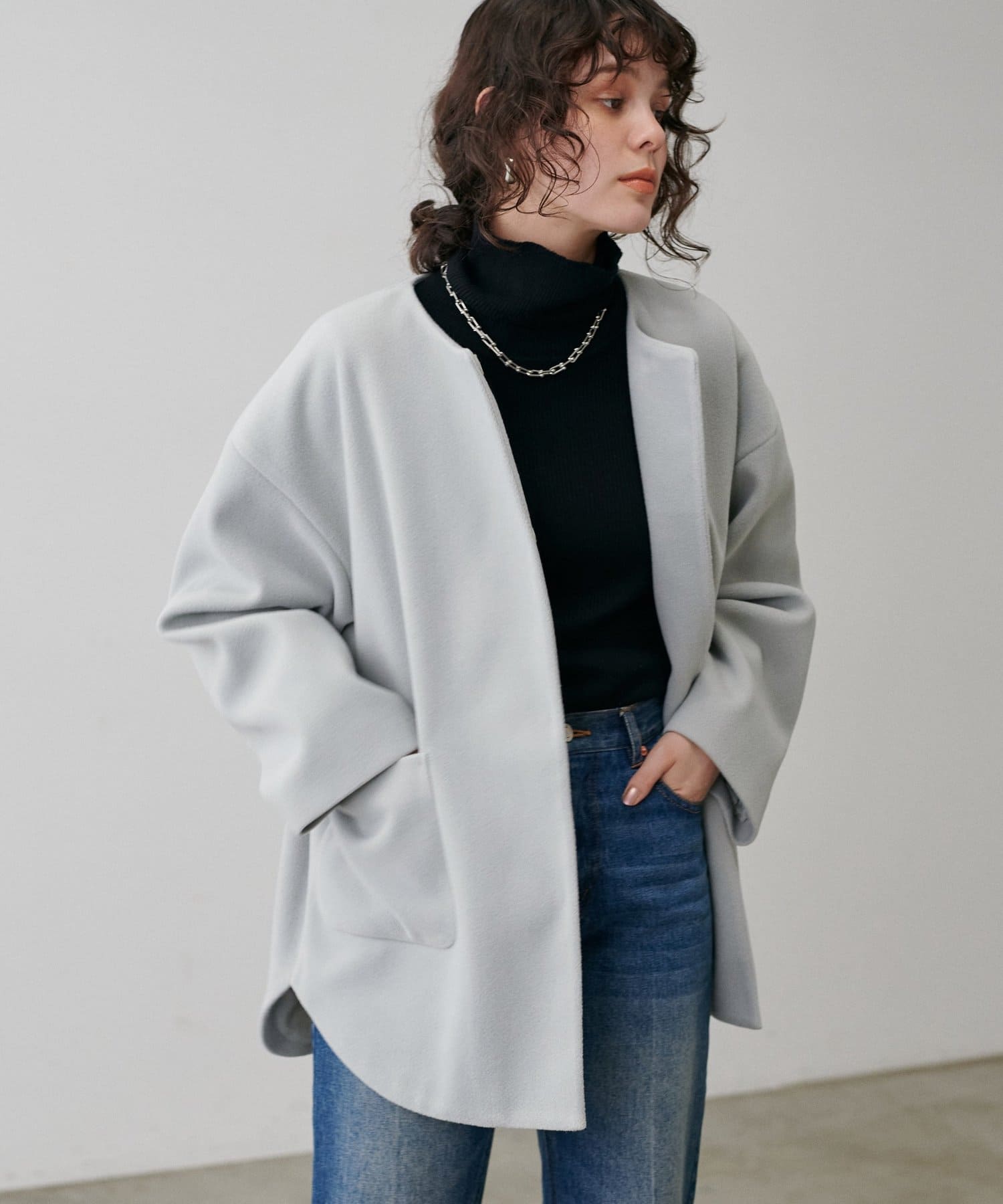 着れるのが嬉しいポイント。ノーカラーなのでハイネックの