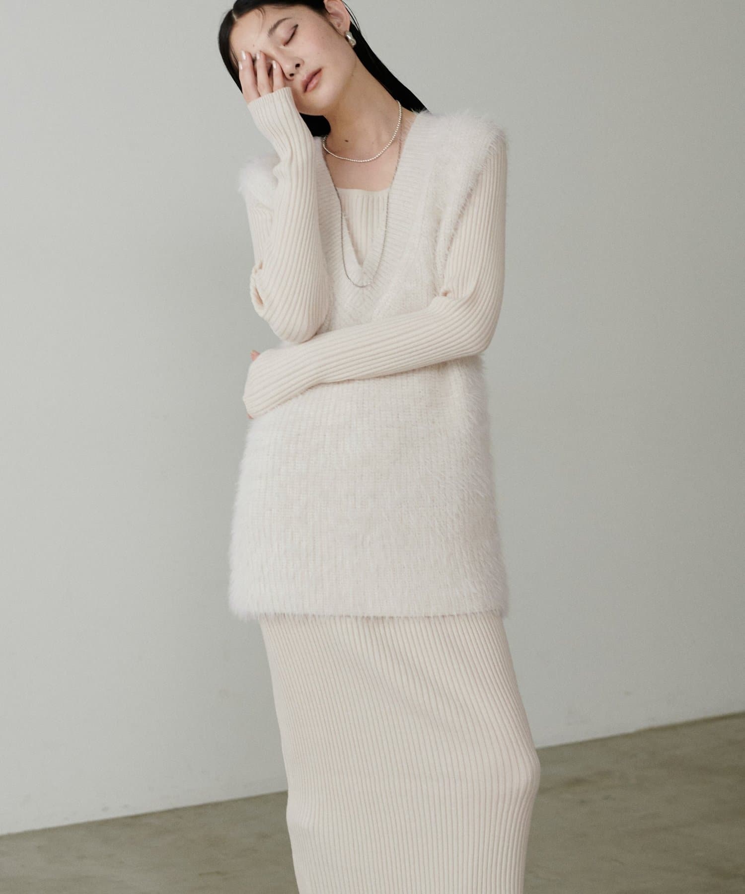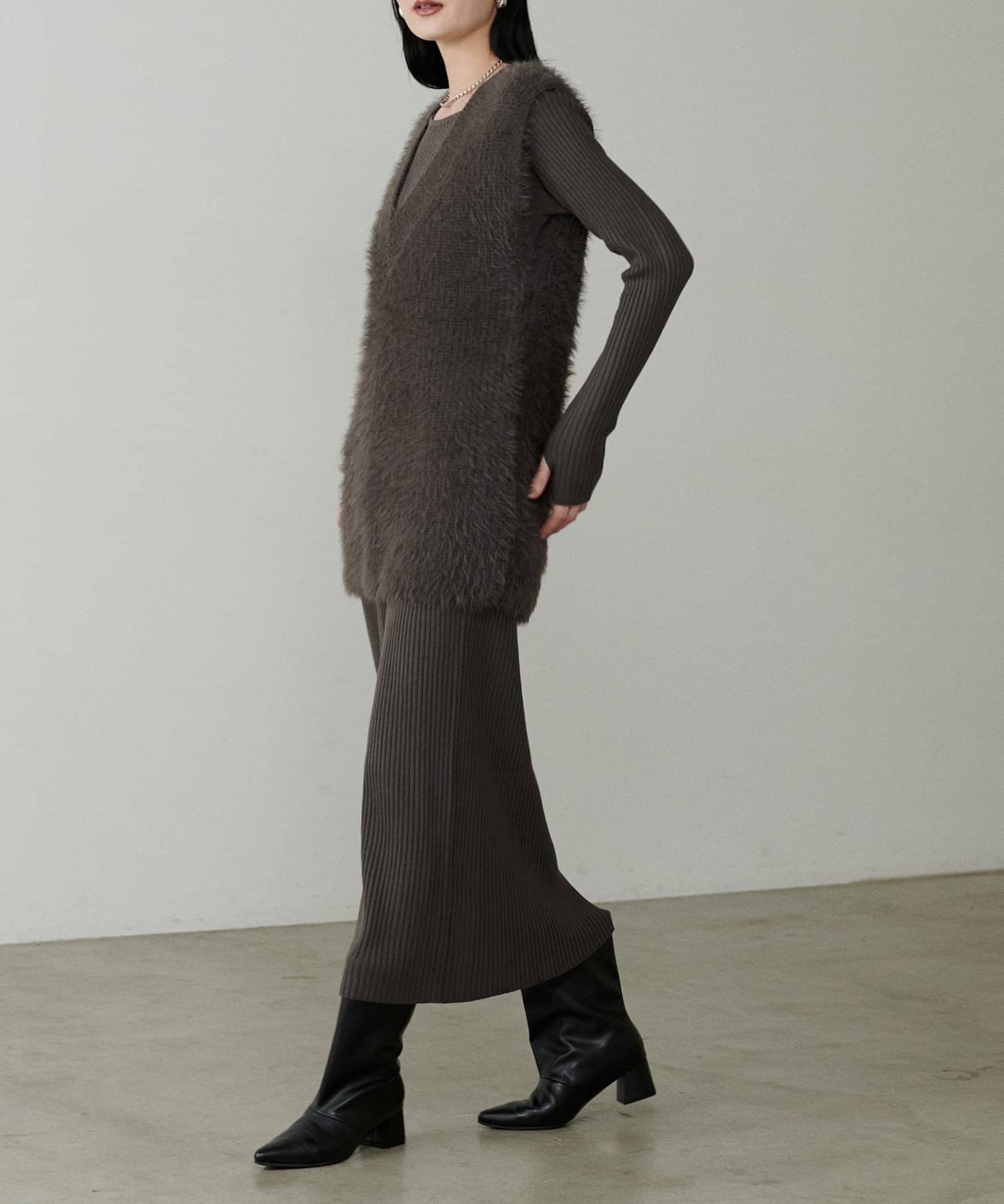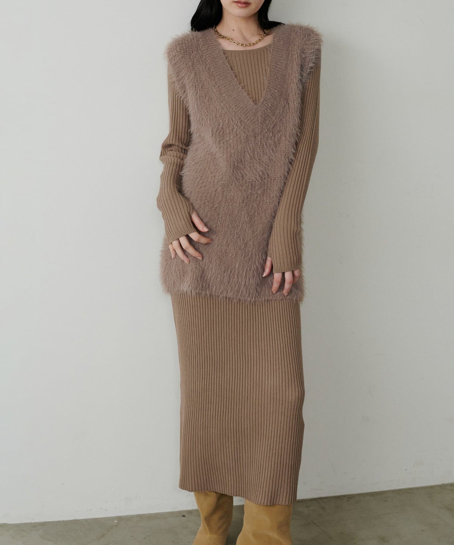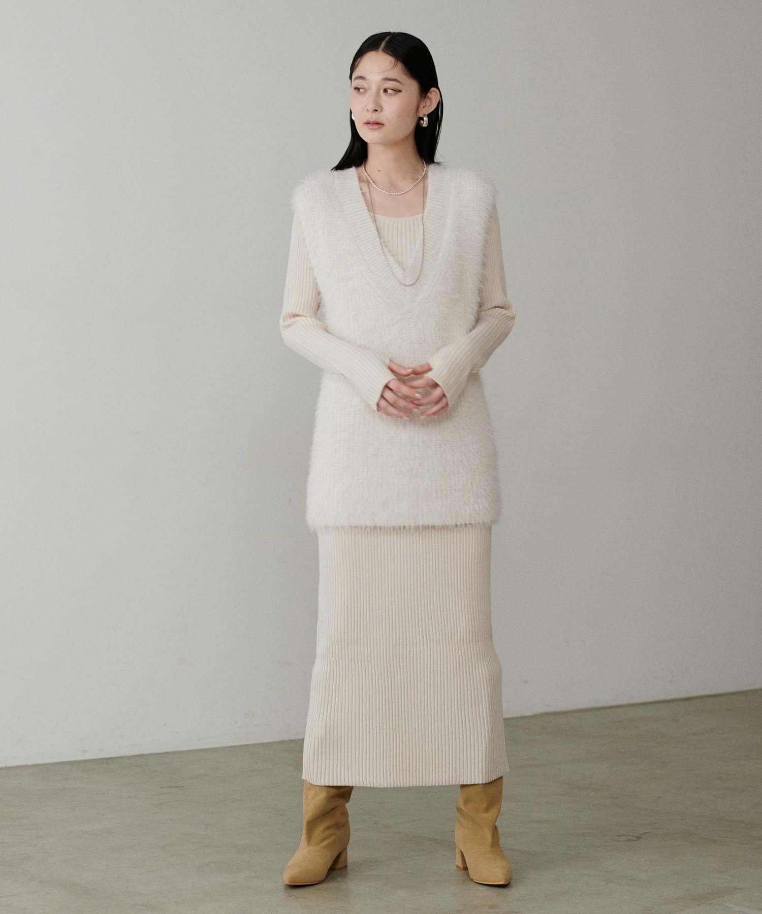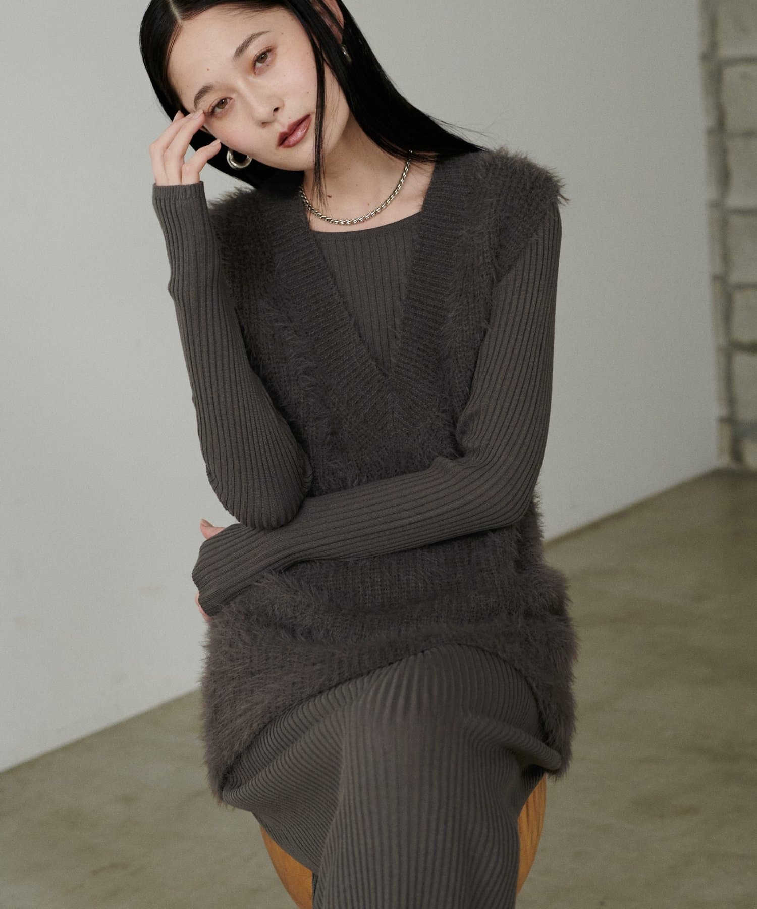 シンプルなリブのニットワンピースに同色のフェザーベストがセットになったアイテム。