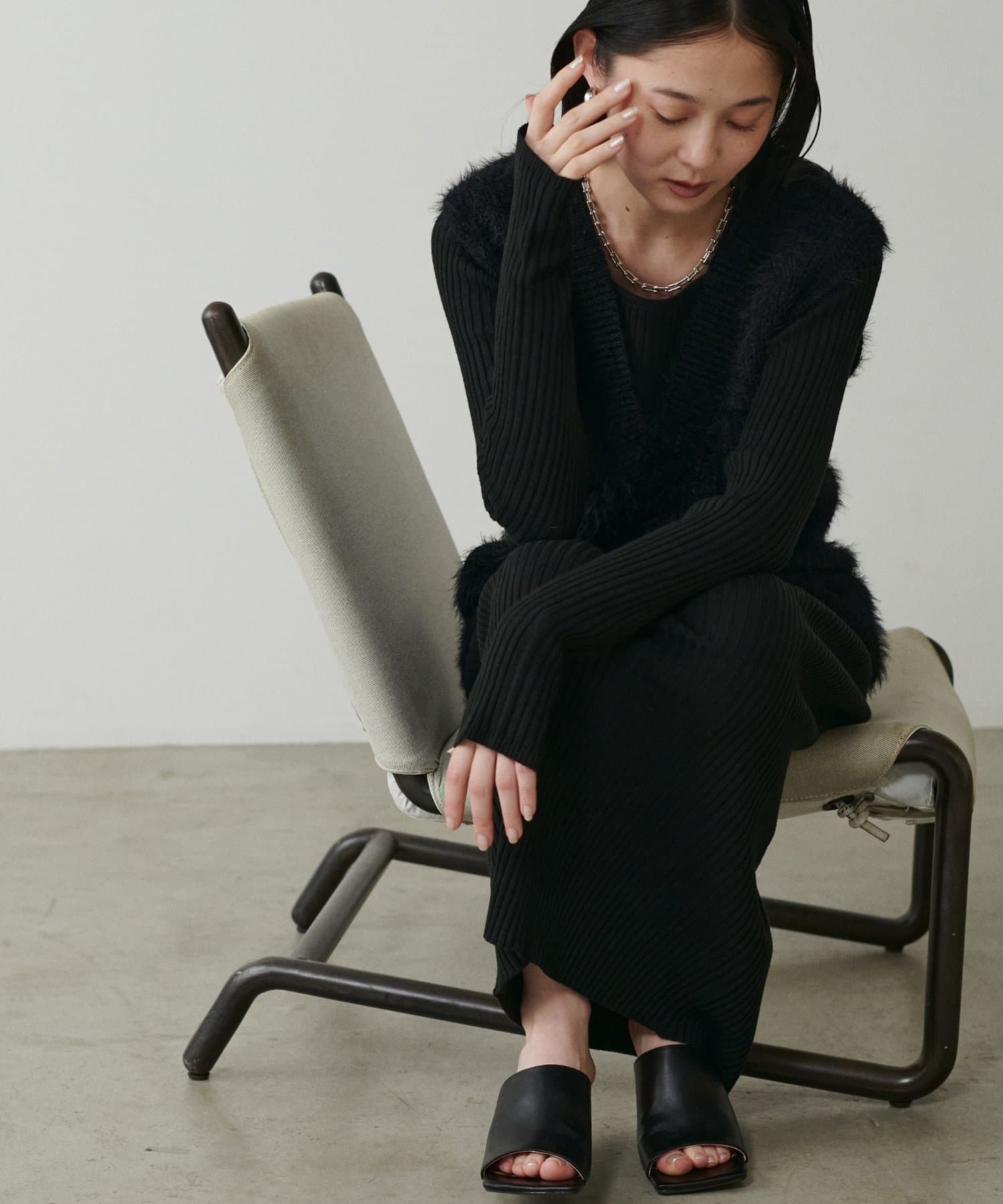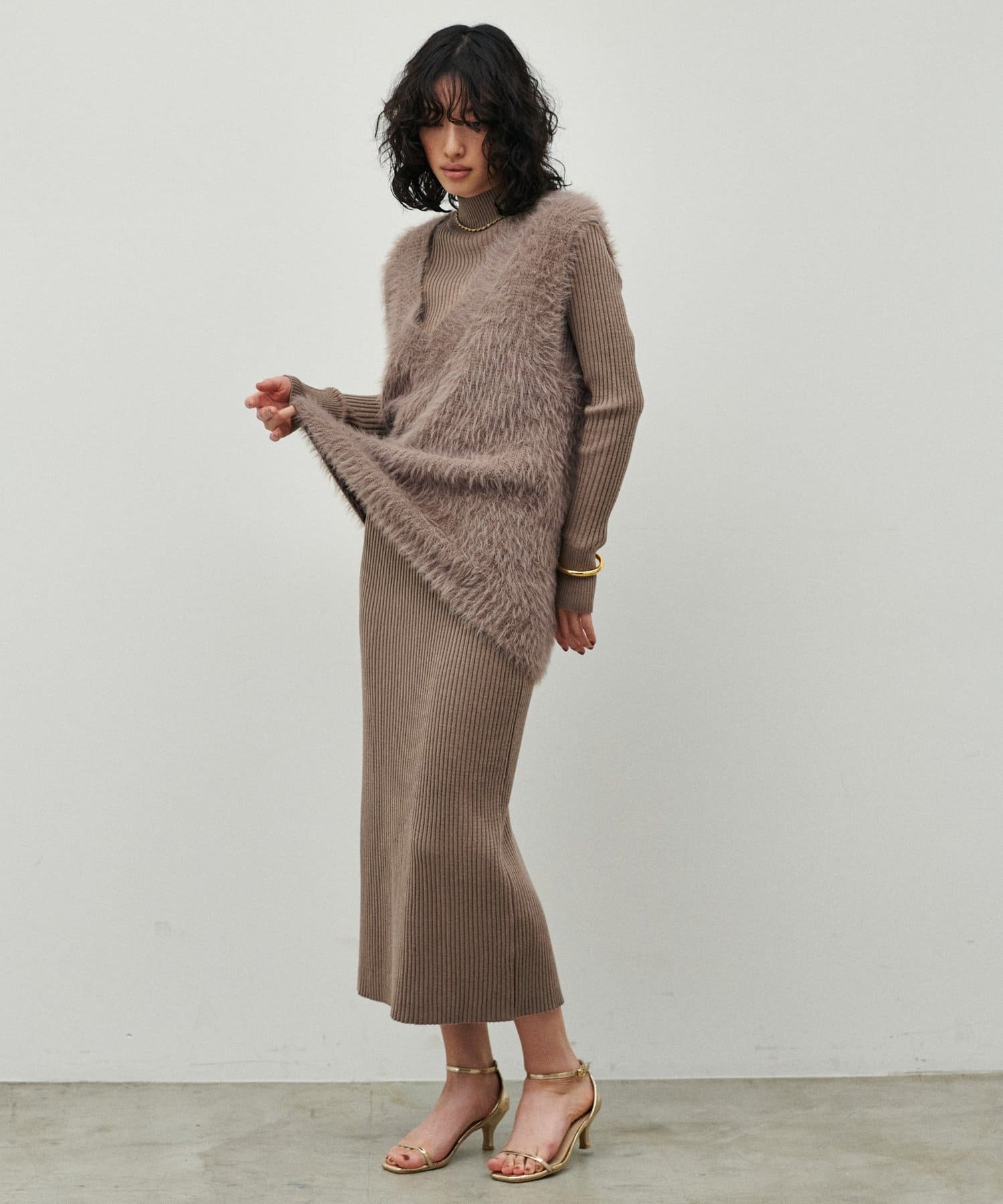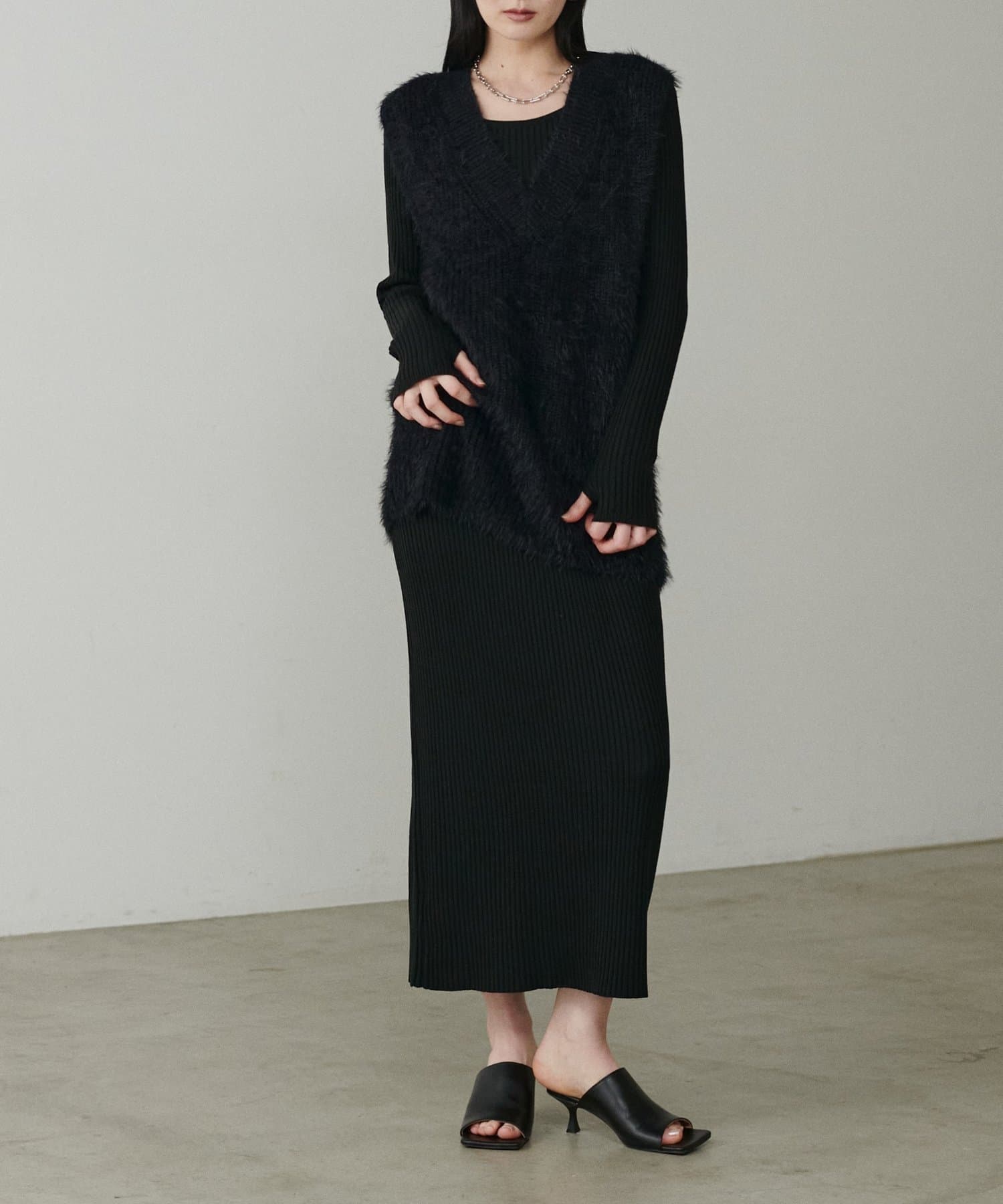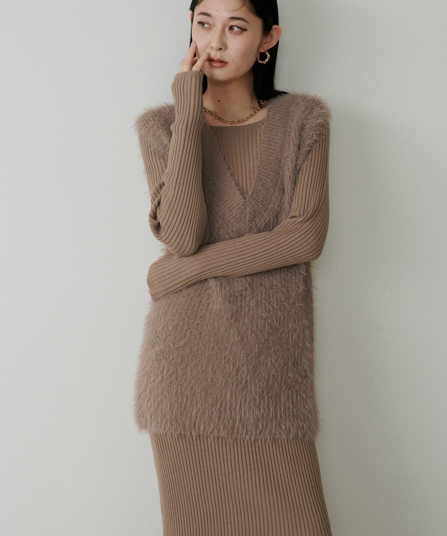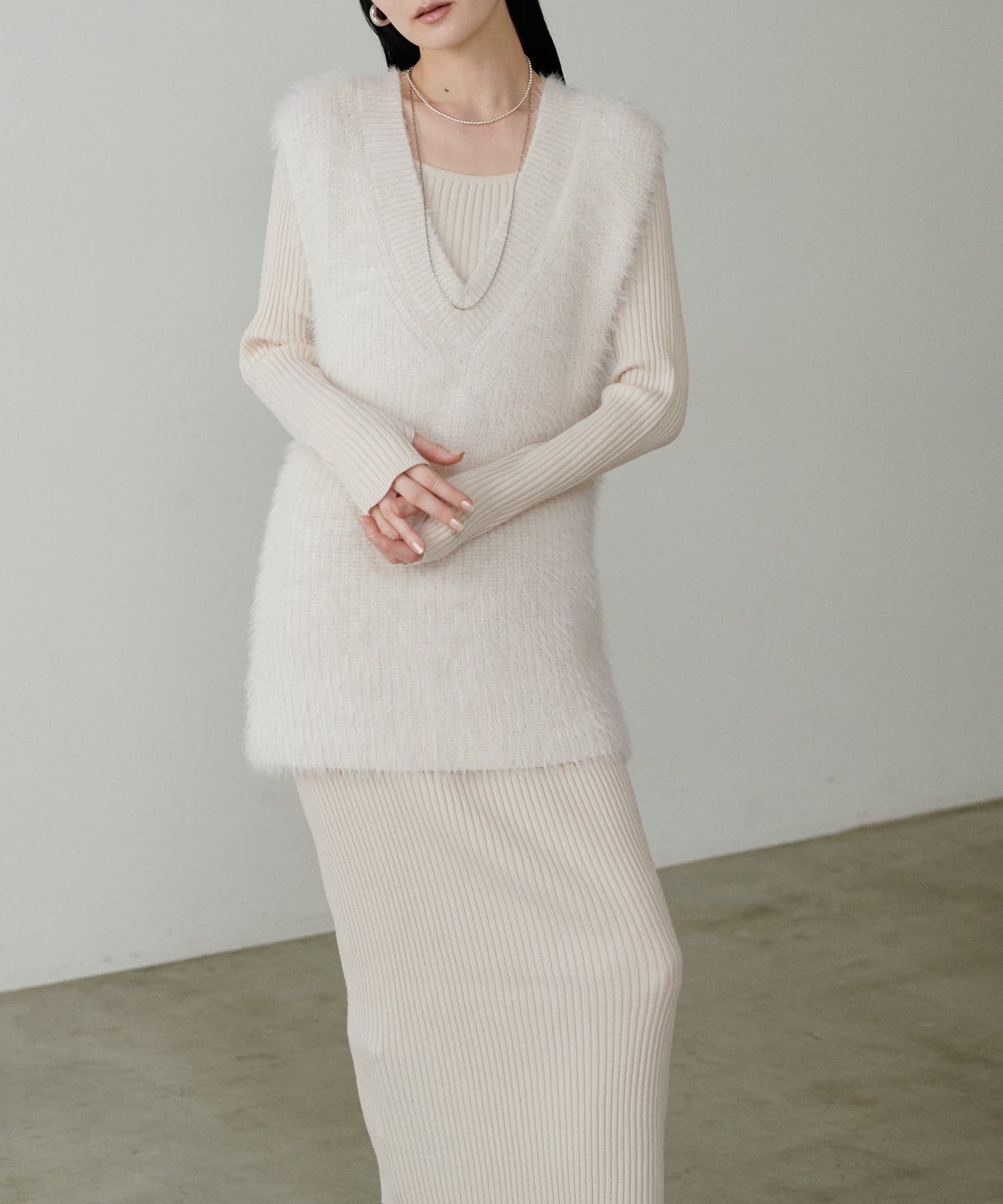 シンプルなリブのニットワンピースに同色のフェザーベストがセットになったアイテム。
