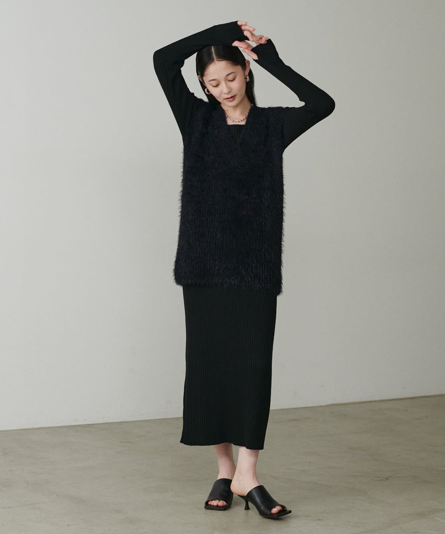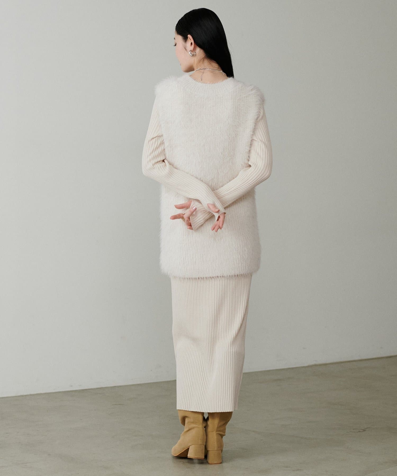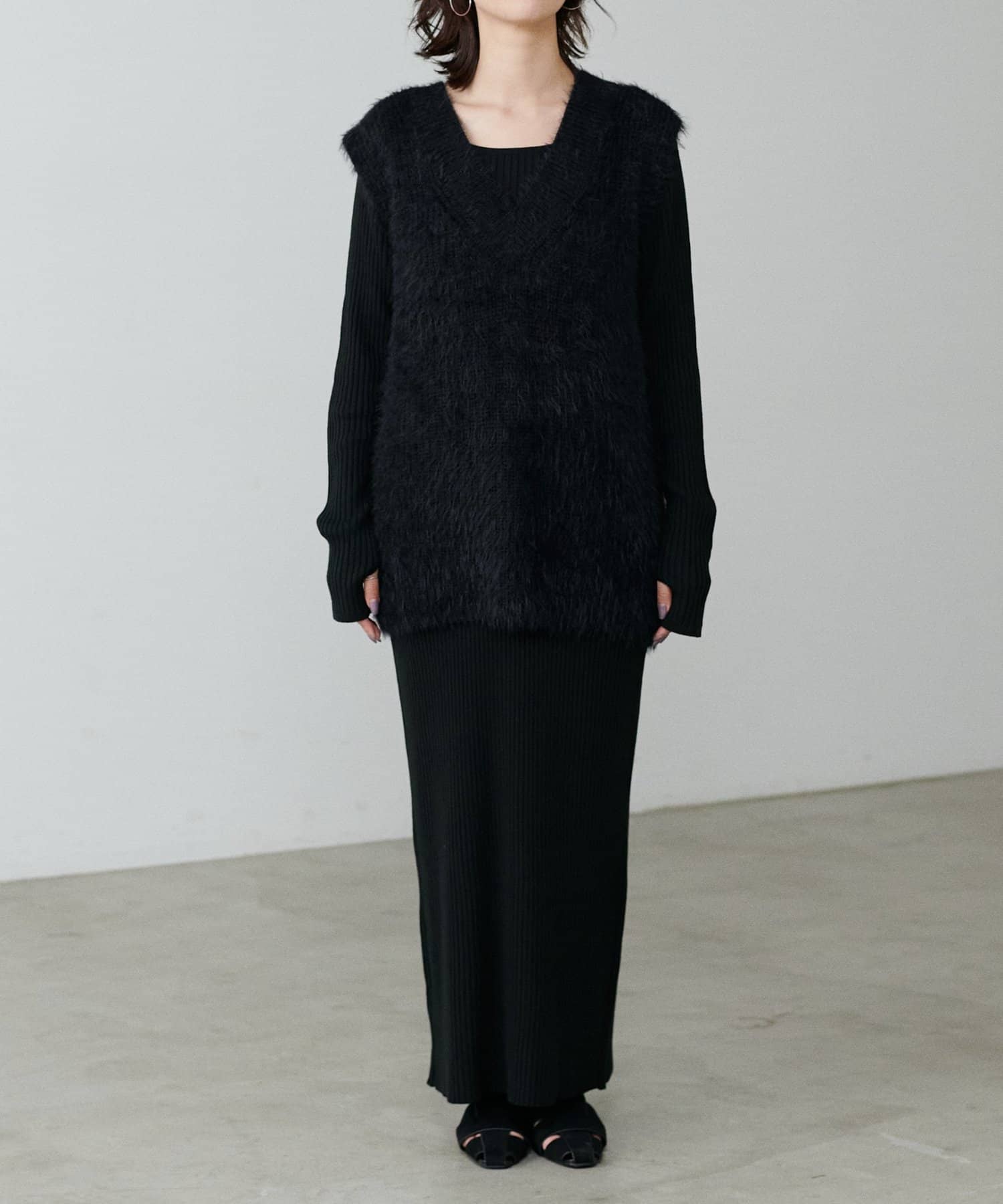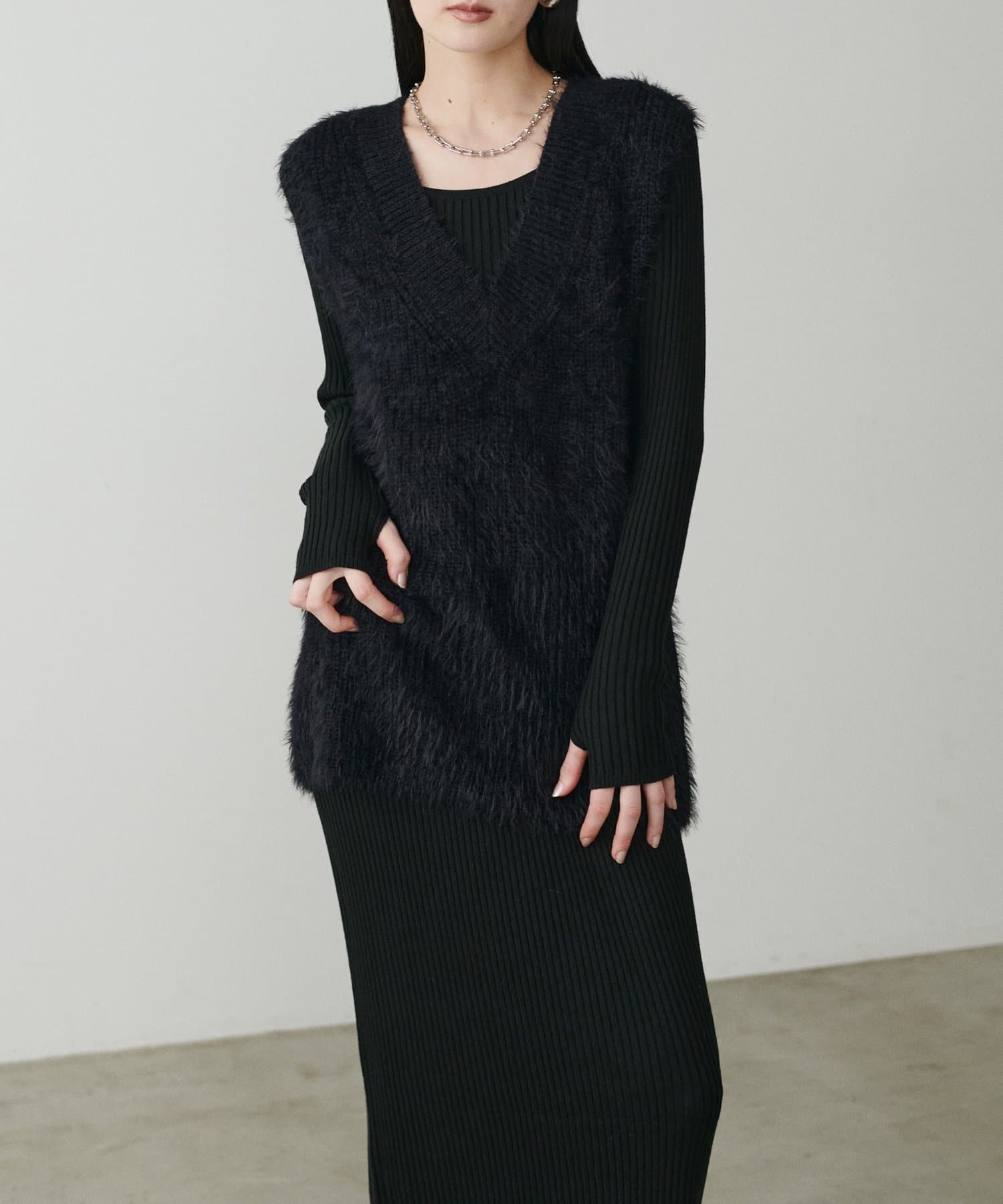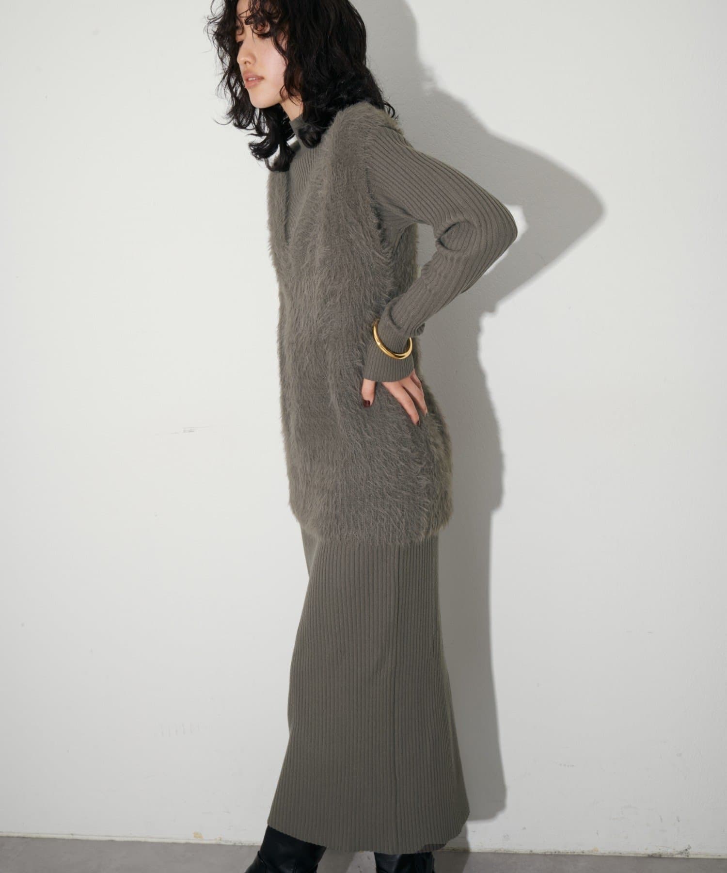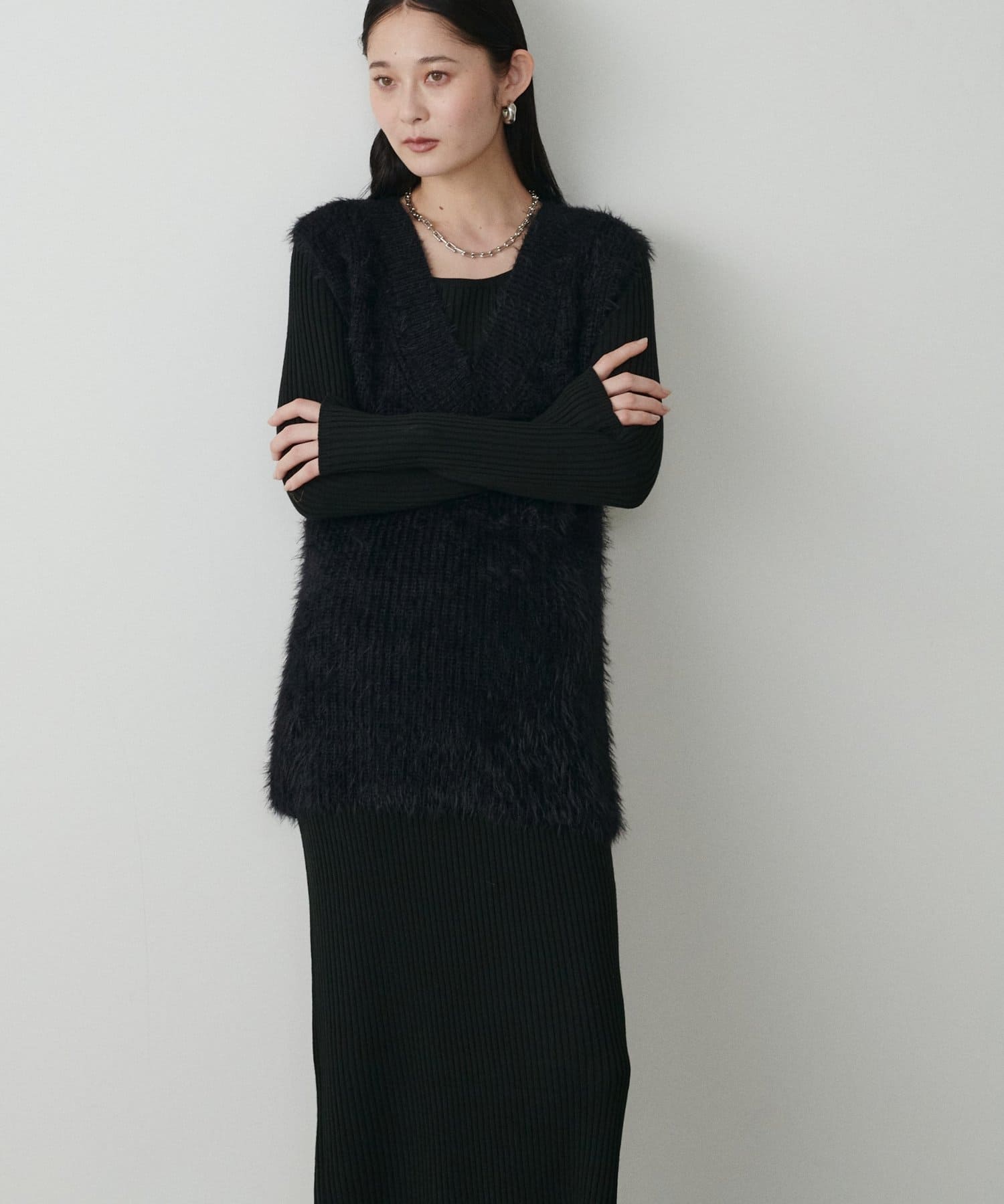 シンプルなリブのニットワンピースに同色のフェザーベストがセットになったアイテム。